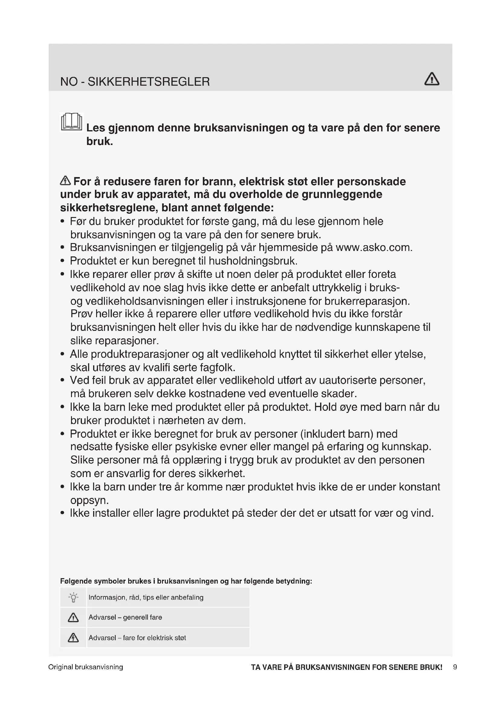 - Ikke installer eller lagre produktet på steder der det er utsatt for vær og vind. Original bruksanvisning TA VARE PÅ BRUKSANVISNINGEN FOR SENERE BRUK! Følgende symboler brukes i bruksanvisningen og har følgende betydning: Informasjon, råd, tips eller anbefaling Advarsel – generell fare Advarsel – fare for elektrisk støt10 Sokkelskuffen skal bare brukes med en vaskemaskin og tørketrommel produsert av Asko Appliances.