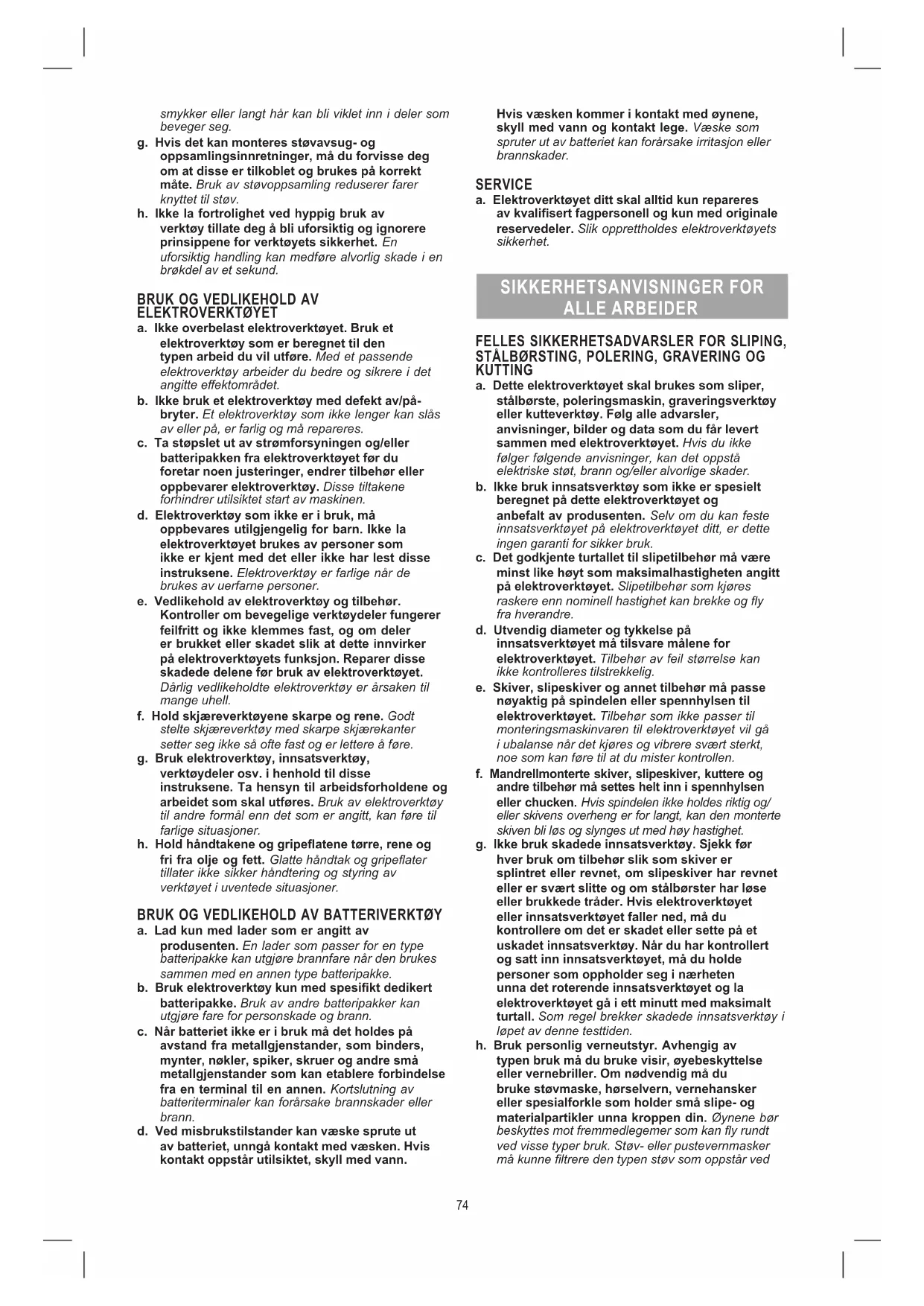 a. Lad kun med lader som er angitt av produsenten. En lader som passer for en type batteripakke kan utgjøre brannfare når den brukes sammen med en annen type batteripakke. b. Bruk elektroverktøy kun med spesikt dedikert batteripakke. Bruk av andre batteripakker kan utgjøre fare for personskade og brann. c. Når batteriet ikke er i bruk må det holdes på avstand fra metallgjenstander, som binders, mynter, nøkler, spiker, skruer og andre små metallgjenstander som kan etablere forbindelse fra en terminal til en annen. Kortslutning av batteriterminaler kan forårsake brannskader eller brann. d. Ved misbrukstilstander kan væske sprute ut av batteriet, unngå kontakt med væsken. Hvis kontakt oppstår utilsiktet, skyll med vann. Hvis væsken kommer i kontakt med øynene, skyll med vann og kontakt lege. Væske som spruter ut av batteriet kan forårsake irritasjon eller brannskader. SERVICE a. Elektroverktøyet ditt skal alltid kun repareres av kvalisert fagpersonell og kun med originale reservedeler. Slik opprettholdes elektroverktøyets sikkerhet. SIKKERHETSANVISNINGER FOR ALLE ARBEIDER FELLES SIKKERHETSADVARSLER FOR SLIPING,