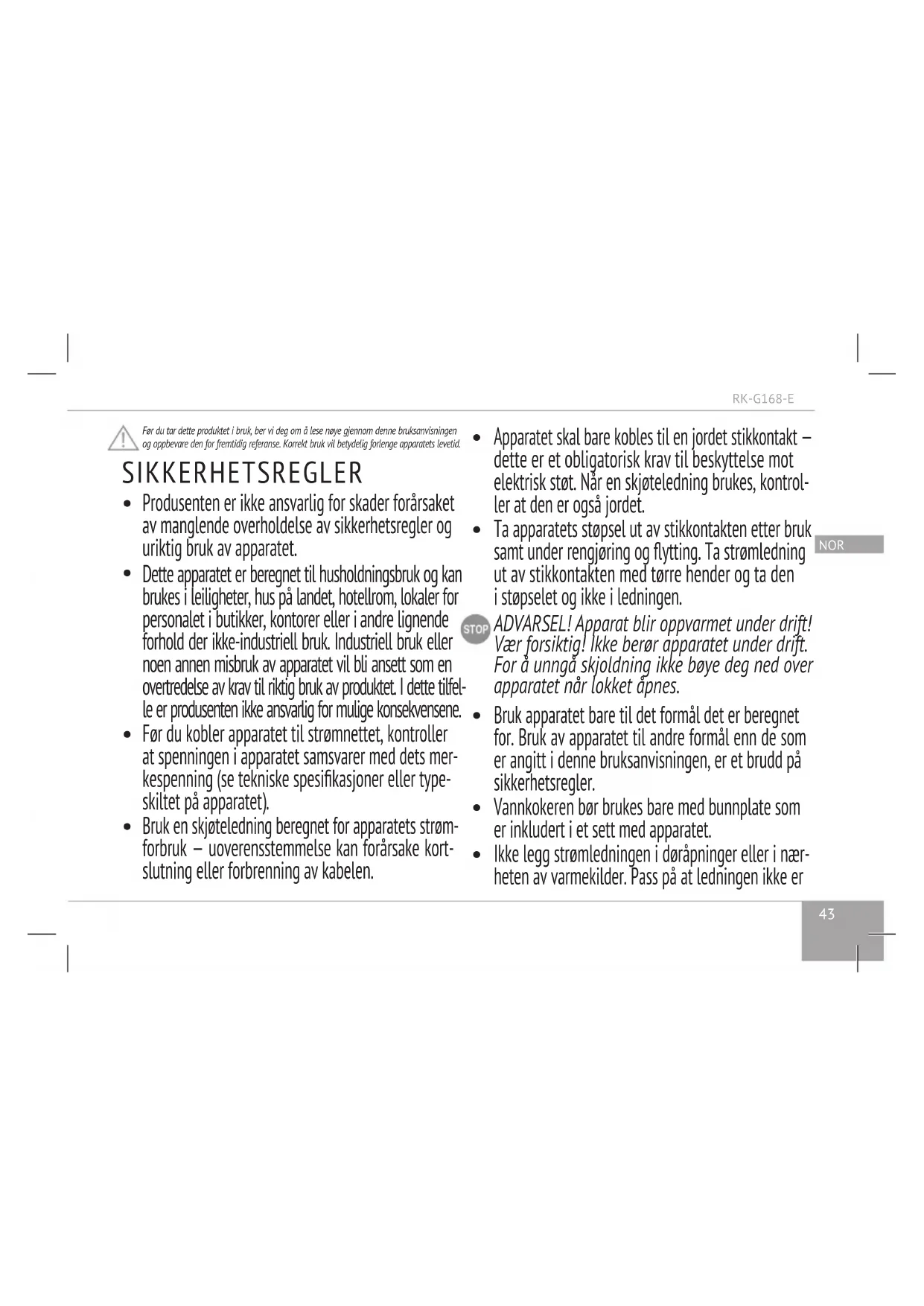 NOR Før du tar dette produktet i bruk, ber vi deg om å lese nøye gjennom denne bruksanvisningen og oppbevare den for fremtidig referanse. Korrekt bruk vil betydelig forlenge apparatets levetid. SIKKERHETSREGLER