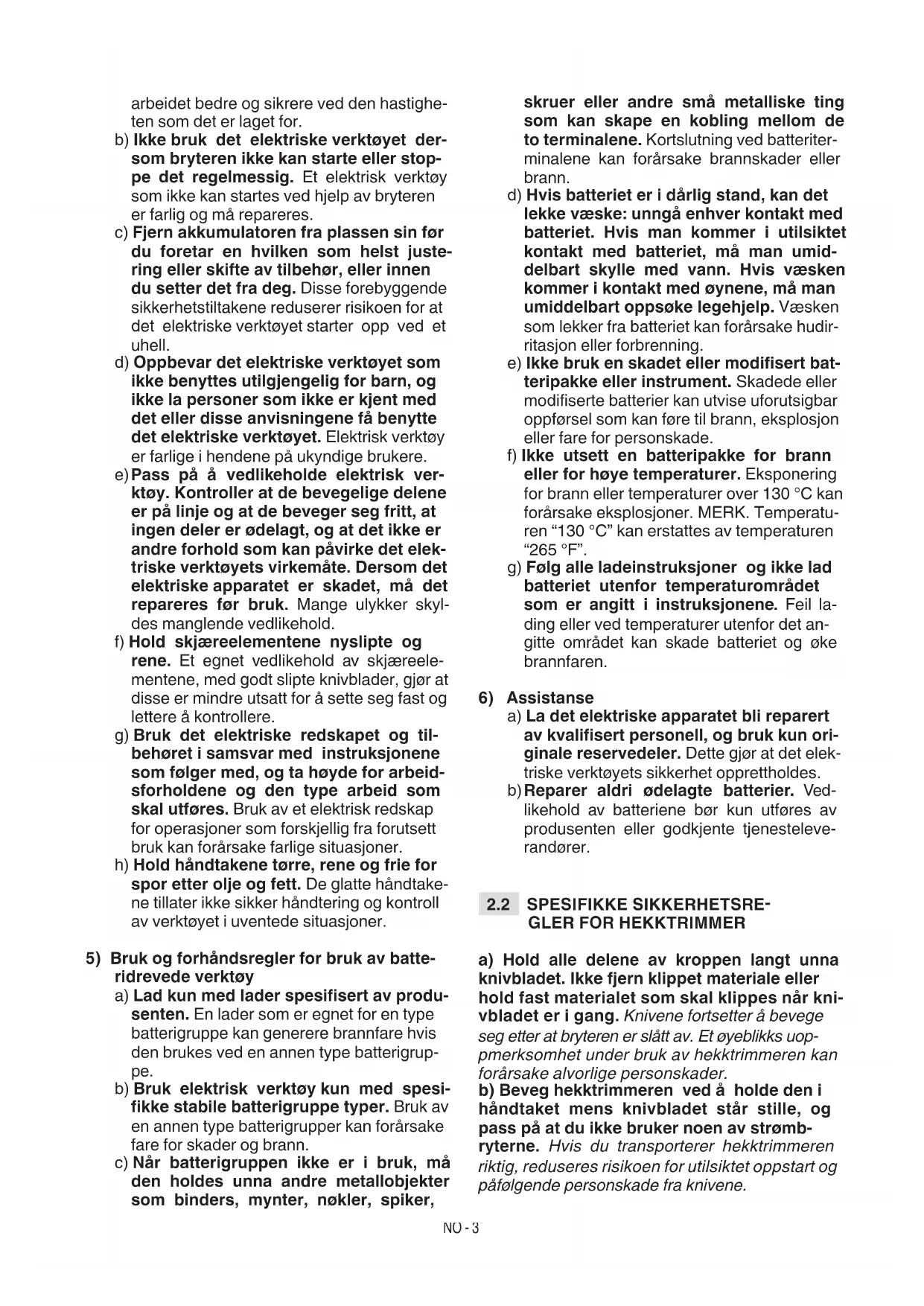 a) Hold alle delene av kroppen langt unna knivbladet. Ikke fjern klippet materiale eller hold fast materialet som skal klippes når kni- vbladet er i gang. Knivene fortsetter å bevege seg etter at bryteren er slått av. Et øyeblikks uop- pmerksomhet under bruk av hekktrimmeren kan forårsake alvorlige personskader. b) Beveg hekktrimmeren ved å holde den i håndtaket mens knivbladet står stille, og pass på at du ikke bruker noen av strømb- ryterne. Hvis du transporterer hekktrimmeren riktig, reduseres risikoen for utilsiktet oppstart og påfølgende personskade fra knivene.NO - 4 c) Når du transporterer eller oppbevarer hekktrimmeren, må du alltid sette på kniv- dekslet. En ordentlig håndtering av hekktrimme- ren reduserer risikoen for personskader forårs- aket av knivbladene. d) Når du fjerner fastkjørt materiale eller utfører service på verktøyet, må du kon- trollere at alle brytere er slått av og at bat- teripakken er fjernet eller koblet fra. Alvorlig personskade kan oppstå ved uventet bruk av motorsagen mens du fjerner materiale som har kilt seg fast eller i løpet av vedlikehold. e) Hold fast i hekktrimmeren kun ved hånd- takenes isolerte overater ettersom kni- vbladet kan komme i kontakt med skjulte kabler. Hvis knivbladene kommer i kontakt med en strømkabel som er “under spenning”, kan det føre til at redskapets metalldeler kommer “under spenning” og operatøren kan få elektrisk støt. f) Hold alle strømkabler og kabler borte fra klippeområdet. Strømkabler kan være skjult i hekker eller busker og ved et uhell kuttet av kni- vbladet. g) Ikke bruk hekktrimmeren i dårlig vær, spe- sielt når det er fare for lynnedslag. Dette re- duserer risikoen for å bli truet av lynet. h) Under arbeidet må maskinen alltid holdes godt fast med begge hender. Bruk av en enkelt hånd kan forårsake tap av kontroll og forårsake alvorlige personskader.. Ved skader eller ulykker under arbeidet skal motoren slå av øyeblikkelig og maskinen fjernes fra stedet for å unngå ere skader. Ved ulykker med personskader eller skader på tredjepersoner må du umiddelbart praktisere førstehjelp og kontakte lege for nødvendig behandling. Fjern nøye eventuelle rester som ellers kan forårsake skader på gjenstander, personer eller dyr. Overeksponering for vibrasjoner kan forårsake lesjoner og nevrovaskulære forstyr- relser (også kjent som “Raynauds fenomen” eller “likngre”), spesielt hos personer som lider av sirkulasjonsforstyrrelser. Symptome- ne kan omfatte hendene, håndleddene og n- grene, og vises ved tap av følsomhet, tretthet, kløe, smerte, fargeendring eller strukturelle endringer i huden. Disse virkningene kan for- sterkes av lave omgivelsestemperaturer og/ eller av et overdrevent fast grep om håndtak- et. Dersom disse symptomene oppstår, bruk maskinen mindre og oppsøk lege.