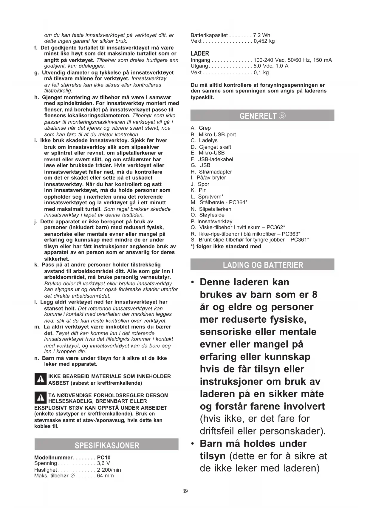 a. Ikke misbruk verktøyet. Bruk et verktøy som er beregnet til den typen arbeid du vil utføre. Med et passende verktøy arbeider du bedre og sikrere i det angitte effektområdet.b. Ikke bruk et verktøy med defekt av/på-bryter. Verktøy som ikke lenger kan slås av eller på, er farlig og må repareres.c. Verktøy som ikke er i bruk, må oppbevares utilgjengelig for barn. Ikke la verktøyet brukes av personer som ikke er kjent med det eller ikke har lest disse instruksene. Verktøy er farlige når de brukes av uerfarne personer.d. Vedlikehold av verktøy. Kontroller om bevegelige verktøydeler fungerer feilfritt og ikke klemmes fast, og om deler er brukket eller skadet slik at dette innvirker på verktøyets funksjon. Reparer disse skadede delene før bruk av verktøyet. Dårlig vedlikeholdte verktøy er årsaken til mange uhell.e. Hvis det er en mulighet for at maskinen eller rengjøringsmidlene kan skade eller misfarge en overate, anbefales det at kompatibilitet testes i et synlig område før bruk.f. Ikke bruk ufortynnede syrer, aceton eller løsemidler.g. Ikke bruk brennbare væsker.h. Ikke ta på eller sett ledende gjenstander (som skrutrekkere eller lignende) inn i mikro-USB-kontakten.i. Ikke foreta endringer eller modikasjoner på maskinen. Uautoriserte modikasjoner kan svekke maskinens sikkerhet, føre til økt støy og vibrasjoner og dårlig ytelse.j. Bruk verktøyet, innsatsverktøy, verktøydeler osv. i henhold til disse instruksene. Ta hensyn til arbeidsforholdene og arbeidet som skal utføres. Bruk av verktøy til andre formål enn det som er angitt, kan føre til farlige situasjoner.