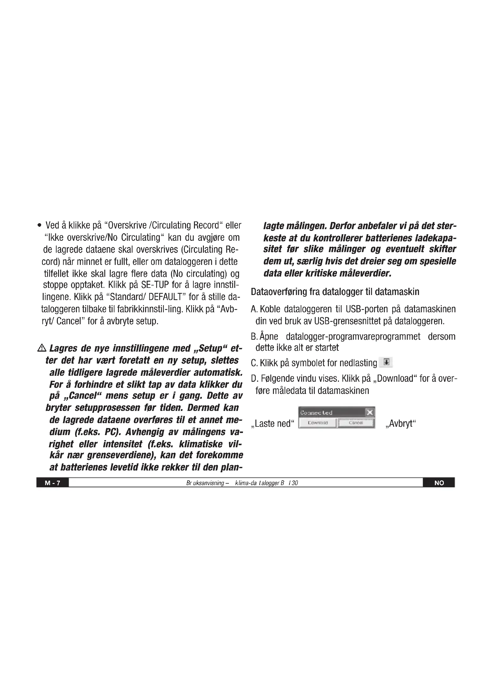 - Vedåklikkepå“Overskrive/CirculatingRecord“eller “Ikke overskrive/No Circulating“ kan du avgjøre om de lagrede dataene skal overskrives (Circulating Re- cord) når minnet er fullt, eller om dataloggeren i dette tilfellet ikke skal lagre flere data (No circulating) og stoppe opptaket. Klikk på SE-TUP for å lagre innstil- lingene. Klikk på “Standard/ DEFAULT” for å stille da- taloggeren tilbake til fabrikkinnstil-ling. Klikk på “Avb- ryt/ Cancel” for å avbryte setup. m Lagres de nye innstillingene med „Setup“ et- ter det har vært foretatt en ny setup, slettes alle tidligere lagrede måleverdier automatisk. For å forhindre et slikt tap av data klikker du på „Cancel“ mens setup er i gang. Dette av bryter setupprosessen før tiden. Dermed kan de lagrede dataene overføres til et annet me- dium (f.eks. PC). Avhengig av målingens va- righet eller intensitet (f.eks. klimatiske vil- kår nær grenseverdiene), kan det forekomme at batterienes levetid ikke rekker til den plan- lagte målingen. Derfor anbefaler vi på det ster- keste at du kontrollerer batterienes ladekapa- sitet før slike målinger og eventuelt skifter dem ut, særlig hvis det dreier seg om spesielle data eller kritiske måleverdier. Dataoverføring fra datalogger til datamaskin A. Koble dataloggeren til USB-porten på datamaskinen din ved bruk av USB-grensesnittet på dataloggeren. B. Åpne datalogger-programvareprogrammet dersom dette ikke alt er startet C. Klikk på symbolet for nedlasting D. Følgende vindu vises. Klikk på „Download“ for å over- føre måledata til datamaskinen „Laste ned“ „Avbryt“ TRO-TR-BA-BL30-HS-002-INT - Kopie.indd 7 08.09.2014 10:20:14NO Br uksanvisning – klima-da t alogger B l 30 M - 8 Når dataene er overført, vises et vindu med følgende grafiske fremstilling: Feltet ovenfor den grafiske fremstillingen inneholder informasjon om tid, skannefrekvens, antall data, alar- minnstillinger og maksimums-, minimums- og gjen- nomsnittsverdien). Zoome inn: