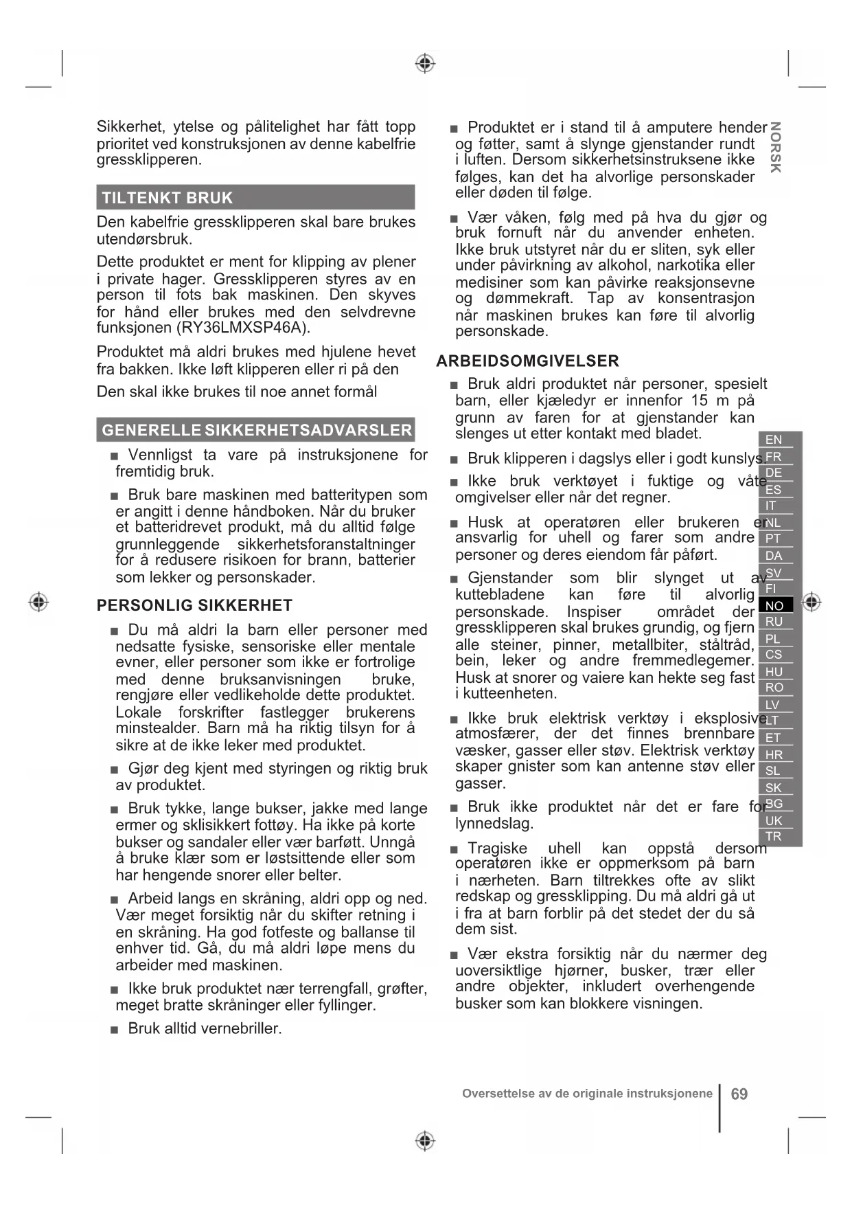 Sikkerhet, ytelse og pålitelighet har fått topp prioritet ved konstruksjonen av denne kabelfrie gressklipperen. TILTENKT BRUK Den kabelfrie gressklipperen skal bare brukes utendørsbruk. Dette produktet er ment for klipping av plener i private hager. Gressklipperen styres av en person til fots bak maskinen. Den skyves for hånd eller brukes med den selvdrevne funksjonen (RY36LMXSP46A). Produktet må aldri brukes med hjulene hevet fra bakken. Ikke løft klipperen eller ri på den Den skal ikke brukes til noe annet formål GENERELLE SIKKERHETSADVARSLER ■ Vennligst ta vare på instruksjonene for fremtidig bruk. ■ Bruk bare maskinen med batteritypen som er angitt i denne håndboken. Når du bruker et batteridrevet produkt, må du alltid følge grunnleggende sikkerhetsforanstaltninger for å redusere risikoen for brann, batterier som lekker og personskader. PERSONLIG SIKKERHET ■ Du må aldri la barn eller personer med nedsatte fysiske, sensoriske eller mentale evner, eller personer som ikke er fortrolige med denne bruksanvisningen bruke, rengjøre eller vedlikeholde dette produktet. Lokale forskrifter fastlegger brukerens minstealder. Barn må ha riktig tilsyn for å sikre at de ikke leker med produktet. ■ Gjør deg kjent med styringen og riktig bruk av produktet. ■ Bruk tykke, lange bukser, jakke med lange ermer og sklisikkert fottøy. Ha ikke på korte bukser og sandaler eller vær barføtt. Unngå å bruke klær som er løstsittende eller som har hengende snorer eller belter. ■ Arbeid langs en skråning, aldri opp og ned. Vær meget forsiktig når du skifter retning i en skråning. Ha god fotfeste og ballanse til enhver tid. Gå, du må aldri løpe mens du arbeider med maskinen. ■ Ikke bruk produktet nær terrengfall, grøfter, meget bratte skråninger eller fyllinger. ■ Bruk alltid vernebriller. ■ Produktet er i stand til å amputere hender og føtter, samt å slynge gjenstander rundt i luften. Dersom sikkerhetsinstruksene ikke følges, kan det ha alvorlige personskader eller døden til følge. ■ Vær våken, følg med på hva du gjør og bruk fornuft når du anvender enheten. Ikke bruk utstyret når du er sliten, syk eller under påvirkning av alkohol, narkotika eller medisiner som kan påvirke reaksjonsevne og dømmekraft. Tap av konsentrasjon når maskinen brukes kan føre til alvorlig personskade. ARBEIDSOMGIVELSER ■ Bruk aldri produktet når personer, spesielt barn, eller kjæledyr er innenfor 15 m på grunn av faren for at gjenstander kan slenges ut etter kontakt med bladet. ■ Bruk klipperen i dagslys eller i godt kunslys. ■ Ikke bruk verktøyet i fuktige og våte omgivelser eller når det regner. ■ Husk at operatøren eller brukeren er ansvarlig for uhell og farer som andre personer og deres eiendom får påført. ■ Gjenstander som blir slynget ut av kuttebladene kan føre til alvorlig personskade. Inspiser området der gressklipperen skal brukes grundig, og fjern alle steiner, pinner, metallbiter, ståltråd, bein, leker og andre fremmedlegemer. Husk at snorer og vaiere kan hekte seg fast i kutteenheten. ■ Ikke bruk elektrisk verktøy i eksplosive atmosfærer, der det finnes brennbare væsker, gasser eller støv. Elektrisk verktøy skaper gnister som kan antenne støv eller gasser. ■ Bruk ikke produktet når det er fare for lynnedslag. ■ Tragiske uhell kan oppstå dersom operatøren ikke er oppmerksom på barn i nærheten. Barn tiltrekkes ofte av slikt redskap og gressklipping. Du må aldri gå ut i fra at barn forblir på det stedet der du så dem sist. ■ Vær ekstra forsiktig når du nærmer deg uoversiktlige hjørner, busker, trær eller andre objekter, inkludert overhengende busker som kan blokkere visningen.70 Oversettelse av de originale instruksjonene