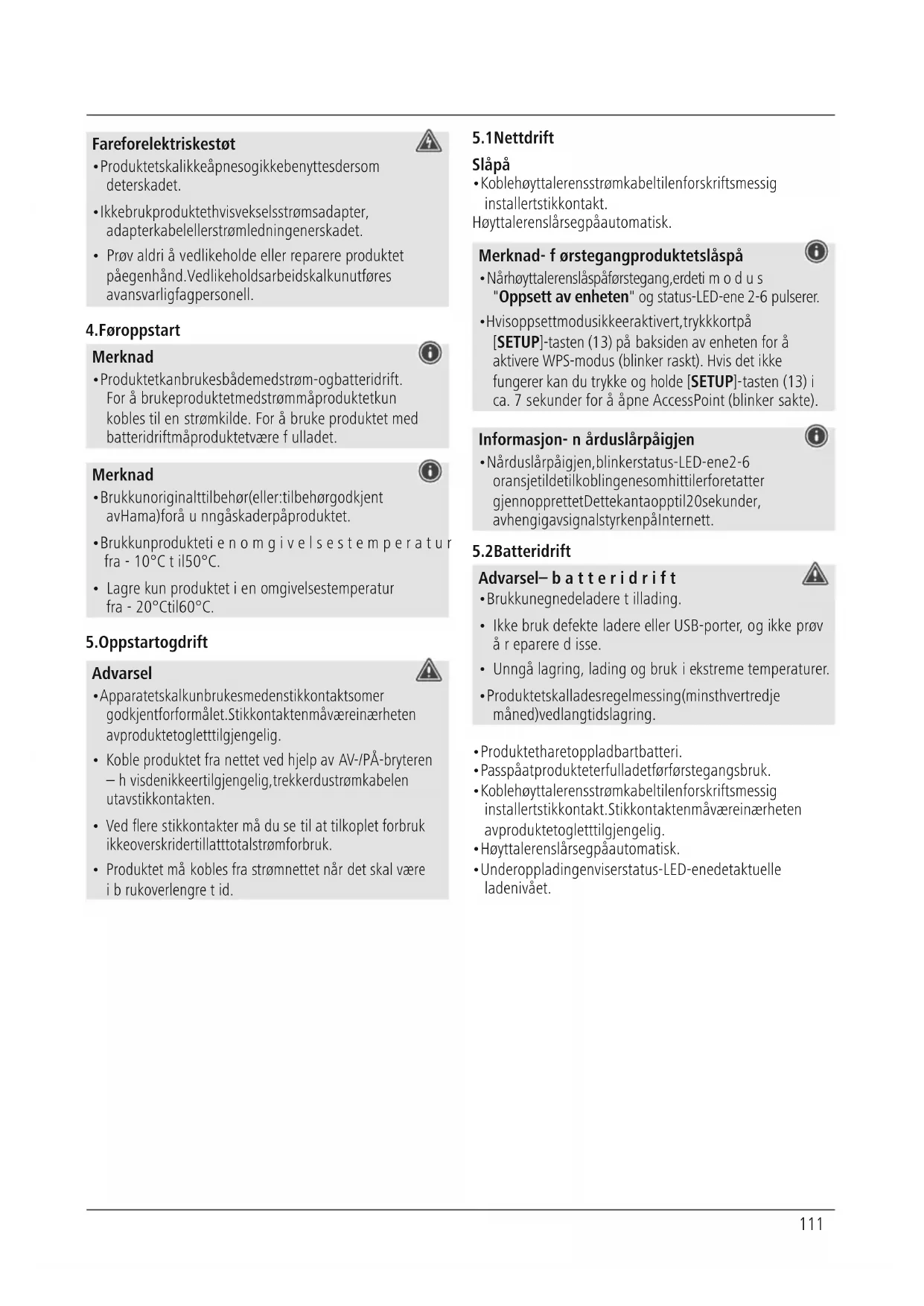 - Prøv aldri åvedlikeholde eller reparereproduktet på egenhånd. Vedlikeholdsarbeid skal kun utføres av ansvarlig fagpersonell. 4.Før oppstart Merknad