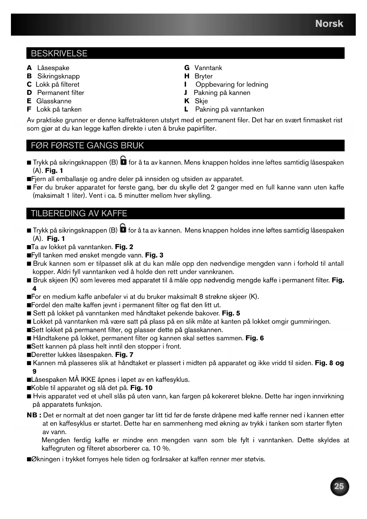 ■ Låsespaken MÅ IKKE åpnes i løpet av en kaffesyklus. ■ Koble til apparatet og slå det på. Fig. 10 ■ Hvis apparatet ved et uhell slås på uten vann, kan fargen på kokerøret blekne. Dette har ingen innvirkning på apparatets funksjon. NB : Det er normalt at det noen ganger tar litt tid før de første dråpene med kaffe renner ned i kannen etter at en kaffesyklus er startet. Dette har en sammenheng med økning av trykk i tanken som starter flyten av vann. Mengden ferdig kaffe er mindre enn mengden vann som ble fylt i vanntanken. Dette skyldes at kaffegruten og filteret absorberer ca. 10 %. ■ Økningen i trykket fornyes hele tiden og forårsaker at kaffen renner mer støtvis. A Låsespake B Sikringsknapp C Lokk på filteret D Permanent filter E Glasskanne F Lokk på tanken G Vanntank H Bryter I Oppbevaring for ledning J Pakning på kannen K Skje L Pakning på vanntanken Norsk