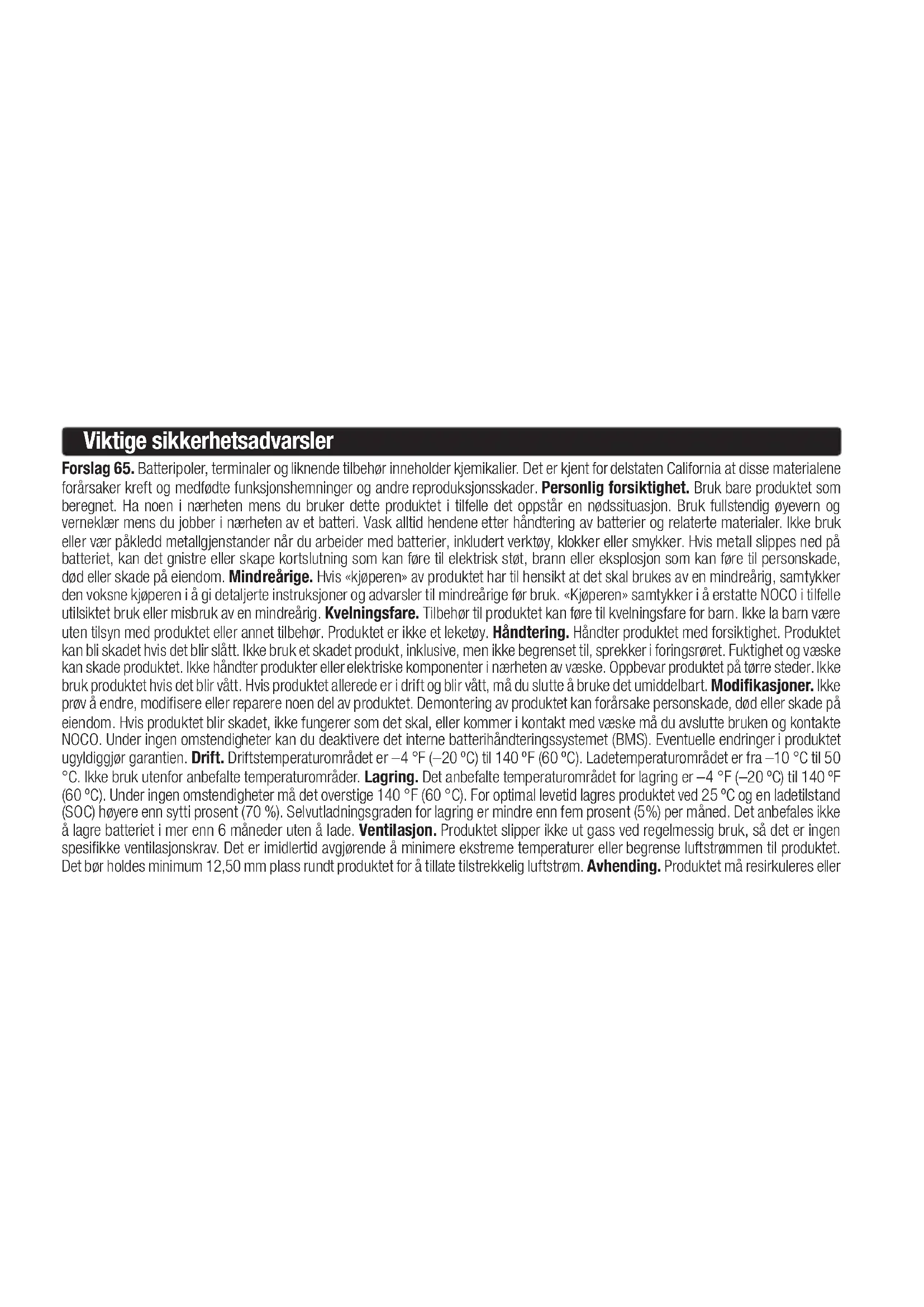 Disse betingelser gælder kun for produktet i garantiperioden. Den problemfrie garanti ophører enten på grund af udløbet af gyldighedsperiode fra købsdatoen (udløbet tid fra serienummerdato, hvis der ikke forefindes noget købsbevis) eller på grund af forholdene omtalt tidligere i dette dokument. Returnér produktet med den nødvendige dokumentation. Med kvittering: 5 år: Intet gebyr. Med købsbevis begynder garantiperioden fra købsdatoen. Med INGEN kvittering: 5 år: Ingen gebyr. Uden købsbevis begynder garantiperioden fra serienummerdatoen. Vi anbefaler at registrere dit NOCO-produkt for at kunne uploade købsbevis og udvide din eektive garantidatoer. Du kan registrere dit NOCO-produkt online på: no.co/register. Hvis du har spørgsmål om din garanti eller dit produkt, kan du kontakte NOCO Support (e-mailadresse eller telefonnummer ovenfor) eller skrive til: The NOCO Company, at 30339 Diamond Parkway, #102, Glenwillow, OH 44139 USA.Bruksveiledning og garanti LES OG GJØR DEG FORSTÅTT MED ALL SIKKERHETSINFORMASJON FØR DU BRUKER PRODUKTET. Dersom du ikke følger disse sikkerhetsinstruksjonene, kan det forårsake ELEKTRISK STØT, EKSPLOSJON og/eller BRANN; som kan medføre ALVORLIGE PRODUKT-/PERSONSKADER og DØD. Risiko for elektrisk støt. Produktet er et elektrisk apparat som kan forårsake støt og alvorlige skader. Ikke utsett apparatet for vann. Sprengfare. Kortslut aldri batteripolene. Ikke bruk med en inkompatibel ladeenhet. Ikke prøv å starte, lade eller lade ut batteriet hvis det er skadet eller frossent. Du må aldri lade eller lade ut produktet utenfor driftstemperaturen. Batteriet må aldri overlades eller overlades for mye. Overskrid aldri batteriets maksimale ladestrøm. Brenn aldri. Brannfare. Produktet er en elektrisk lagringsenhet som kan avgi varme. Ikke dekk til produktet eller legg gjenstander oppå produktet. Hold produktet borte fra brennbare materialer. Risiko for øyenskade. Produktet må kun brukes med vernebriller. Batterier kan eksplodere og følgelig fyre av skadelige partikler. Dersom syren kommer i kontakt med hud eller øyner, må påvirkede områder skylles med rent vann og det må tas kontakt med et giftkontrollsenter. For ytterligere informasjon og hjelp, besøk: FARE NorskForslag 65. Batteripoler, terminaler og liknende tilbehør inneholder kjemikalier. Det er kjent for delstaten California at disse materialene forårsaker kreft og medfødte funksjonshemninger og andre reproduksjonsskader. Personlig forsiktighet. Bruk bare produktet som beregnet. Ha noen i nærheten mens du bruker dette produktet i tilfelle det oppstår en nødssituasjon. Bruk fullstendig øyevern og verneklær mens du jobber i nærheten av et batteri. Vask alltid hendene etter håndtering av batterier og relaterte materialer. Ikke bruk eller vær påkledd metallgjenstander når du arbeider med batterier, inkludert verktøy, klokker eller smykker. Hvis metall slippes ned på batteriet, kan det gnistre eller skape kortslutning som kan føre til elektrisk støt, brann eller eksplosjon som kan føre til personskade, død eller skade på eiendom. Mindreårige. Hvis «kjøperen» av produktet har til hensikt at det skal brukes av en mindreårig, samtykker den voksne kjøperen i å gi detaljerte instruksjoner og advarsler til mindreårige før bruk. «Kjøperen» samtykker i å erstatte NOCO i tilfelle utilsiktet bruk eller misbruk av en mindreårig. Kvelningsfare. Tilbehør til produktet kan føre til kvelningsfare for barn. Ikke la barn være uten tilsyn med produktet eller annet tilbehør. Produktet er ikke et leketøy. Håndtering. Håndter produktet med forsiktighet. Produktet kan bli skadet hvis det blir slått. Ikke bruk et skadet produkt, inklusive, men ikke begrenset til, sprekker i foringsrøret. Fuktighet og væske kan skade produktet. Ikke håndter produkter eller elektriske komponenter i nærheten av væske. Oppbevar produktet på tørre steder. Ikke bruk produktet hvis det blir vått. Hvis produktet allerede er i drift og blir vått, må du slutte å bruke det umiddelbart. Modifikasjoner. Ikke prøv å endre, modifisere eller reparere noen del av produktet. Demontering av produktet kan forårsake personskade, død eller skade på eiendom. Hvis produktet blir skadet, ikke fungerer som det skal, eller kommer i kontakt med væske må du avslutte bruken og kontakte NOCO. Under ingen omstendigheter kan du deaktivere det interne batterihåndteringssystemet (BMS). Eventuelle endringer i produktet ugyldiggjør garantien. Drift. Driftstemperaturområdet er –4 °F (–20 ºC) til 140 ºF (60 ºC). Ladetemperaturområdet er fra –10 °C til 50 °C. Ikke bruk utenfor anbefalte temperaturområder. Lagring. Det anbefalte temperaturområdet for lagring er –4 °F (–20 ºC) til 140 ºF (60 ºC). Under ingen omstendigheter må det overstige 140 °F (60 °C). For optimal levetid lagres produktet ved 25 ºC og en ladetilstand (SOC) høyere enn sytti prosent (70 %). Selvutladningsgraden for lagring er mindre enn fem prosent (5%) per måned. Det anbefales ikke å lagre batteriet i mer enn 6 måneder uten å lade. Ventilasjon. Produktet slipper ikke ut gass ved regelmessig bruk, så det er ingen spesifikke ventilasjonskrav. Det er imidlertid avgjørende å minimere ekstreme temperaturer eller begrense luftstrømmen til produktet. Det bør holdes minimum 12,50 mm plass rundt produktet for å tillate tilstrekkelig luftstrøm. Avhending. Produktet må resirkuleres eller Viktige sikkerhetsadvarslerNO kasseres separat fra husholdningsavfall. Avhending av produktet i husholdningsavfall er ulovlig i henhold til statlige og føderale miljølover og forskrifter. Ta alltid med produktet til ditt lokale batteriresirkulasjonssenter. Ettermontering. Litium-ion-batterier veier vesentlig mindre enn blysyrebatterier med sammenlignbar kapasitet. Det finnes utstyr som er designet for å bruke vekten av blysyrebatterier for å oppnå vektfordeling. Hvis du bruker produktet som et erstatningsbatteri, 