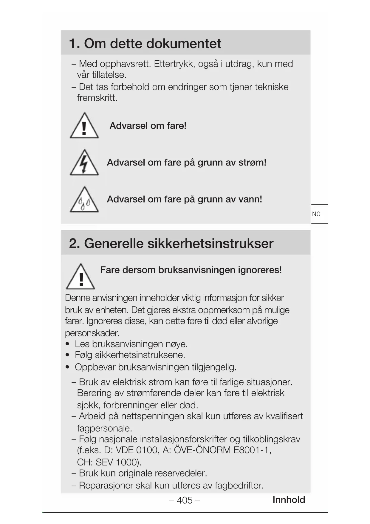- Oppbevar bruksanvisningen tilgjengelig. – Bruk av elektrisk strøm kan føre til farlige situasjoner. Berøring av strømførende deler kan føre til elektrisk sjokk, forbrenninger eller død. – Arbeid på nettspenningen skal kun utføres av kvalifisert fagpersonale. – Følg nasjonale installasjonsforskrifter og tilkoblingskrav (f.eks. D: VDE 0100, A:ÖVE-ÖNORM E8001-1, CH:SEV1000). – Bruk kun originale reservedeler. – Reparasjoner skal kun utføres av fagbedrifter.– 406 – Innhold