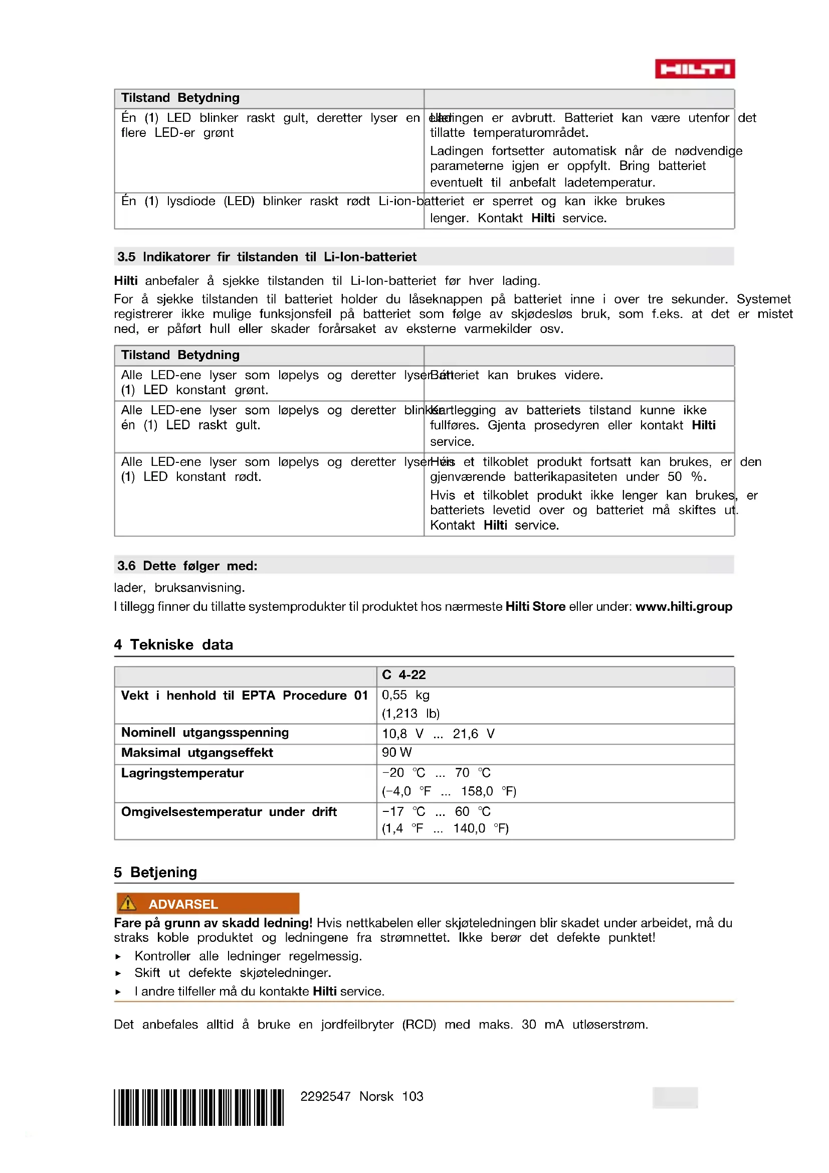 drift. 11 Produsentgaranti ▶ Når det gjelder spørsmål om garantibetingelser, ber vi deg kontakte din lokale Hilti-partner.*2292547* 2292547 Norsk 107 12 Ytterligere informasjon RoHS (direktiv for begrensning av bruk av farlige stoffer) Denne tabellen gjelder for markedet Kina.108 Norsk 2292547 *2292547* Denne tabellen gjelder for markedet Taiwan. 13 Hilti Li-Ion-batterier Informasjon om sikkerhet og bruk I denne dokumentasjonen brukes begrepet batteri om oppladbare Hilti Li-Ion-batterier, der flere Li-Ion-celler er koblet sammen. De er beregnet for Hilti elektroverktøy og skal derfor bare brukes til disse. Bruk bare originale Hilti-batterier! Beskrivelse Hilti-batterier er utstyrt med cellestyrings- og cellebeskyttelsessystemer. Batteriene består av celler som inneholder litium-ion-lagringsmaterialer som gir mulighet til en høy energi- tetthet. Li-ion-cellene har svært lav minneeffekt, men er svært følsomme overfor påvirkning fra ytre krefter, dyputlading eller høye temperaturer. Produktene som er godkjent for Hilti-batterier, finner du i din Hilti Store eller under: www.hilti.group Sikkerhet ▶ Ta hensyn til følgende sikkerhetsanvisninger for sikker håndtering og bruk av li-ion-batterier. Manglende overholdelse kan føre til hudirritasjoner, alvorlige korrosive skader, kjemiske forbrenninger, brann og/eller eksplosjoner. ▶ Behandle batterier med omhu for å unngå skader og forhindre at svært helseskadelige væsker lekker ut! ▶ Batterier må under ingen omstendigheter modifiseres eller manipuleres! ▶ Batteriene må ikke tas fra hverandre, klemmes, varmes opp over 80 °C eller brennes. ▶ Ikke bruk eller lad opp batterier som har vært utsatt for et støt eller er skadd på annen måte. Kontroller batteriene regelmessig for å se etter tegn på skader. ▶ Bruk aldri resirkulerte eller reparerte batterier.*2292547* 2292547 Norsk 109 ▶ Ikke bruk batteriet eller et batteridrevet elektroverktøy som slagverktøy. ▶ Utsett aldri batterier for direkte sollys, høy temperatur, gnistdannelse eller åpen flamme. Dette kan føre til eksplosjoner. ▶ Ikke berør batteripolene med fingrene, verktøy, smykker eller andre elektrisk ledende gjenstander. Dette kan skade batteriet samt forårsake materielle skader og personskader. ▶ Hold batteriene unna regn, fuktighet og væsker. Hvis fuktighet trenger inn, kan dette føre til kortslutning, elektrisk støt, forbrenninger, brann og eksplosjoner. ▶ Bruk kun ladere og elektroverktøy som er beregnet på denne batteritypen. Følg i den forbindelse opplysningene i de tilhørende bruksanvisningene. ▶ Ikke bruk eller oppbevar batteriet i eksplosjonsfarlige omgivelser. ▶ Hvis batteriet er for varmt til å ta i, kan det være defekt. Plasser batteriet på et synlig, ikke brennbart sted med tilstrekkelig avstand til brennbare materialer. La batteriet kjølne. Hvis batteriet fremdeles er for varmt til å ta i etter en time, er det defekt. Gå frem i henhold til anvisningene i kapitlet Tiltak ved batteribrann. Prosedyre ved skadde batterier ▶ Kontakt alltid Hilti service når et batteri er skadet. ▶ Ikke bruk batterier som lekker væske. ▶ Unngå øye- og/eller hudkontakt med væsken som renner ut fra batteriet. Bruk alltid vernehansker og vernebriller under håndtering av batterivæske. ▶ Fjern batterivæsken som har lekket ut med et godkjent kjemisk rensemiddel. Følg lokale rengjørings- forskrifter for batterivæske. ▶ Legg defekte batterier i en ikke-brennbar beholder, og dekk dem med tørr sand, krittpulver (CaCO3) eller silikat (vermiculitt). Sett deretter på lokket lufttett, og oppbevar beholderen på trygg avstand fra brennbare gasser, væsker og gjenstander. ▶ Lever inn beholderen i nærmeste Hilti Store eller kontakt et lokalt renovasjonsfirma. Følg lokale transportforskrifter for skadde batterier! Prosedyre ved batterier som ikke virker lenger ▶ Vær oppmerksom ved all unormal atferd til batteriet, som feillading, uvanlig lang ladetid, merkbart redusert ytelse, uvanlige LED-aktiviteter eller væskelekkasje. Alt dette er tegn på et internt problem. ▶ Hvis du har mistanke om et internt batteriproblem, må du kontakte Hilti service. ▶ Hvis batteriet ikke virker lenger, ikke kan lades opp eller det renner ut væske, må du kassere det. Se kapittel Vedlikehold og avhending. Prosedyre ved batteribrann ADVARSEL Fare på grunn av batteribrann! Et brennende batteri slipper ut farlige og eksplosive væsker og damp som kan forårsake korrosjonsskader, forbrenninger og eksplosjoner. ▶ Bruk personlig verneutstyr når du skal bekjempe en batteribrann. ▶ Sørg for tilstrekkelig ventilasjon slik at farlig og eksplosiv damp kan slippe ut. ▶ Ved intensiv røykutvikling må du straks forlate rommet. ▶ Ved irritasjon i luftveiene må du oppsøke lege. ▶ Ring brannvesenet før du starter et slukkeforsøk. ▶ Batteribranner skal bare bekjempes med vann fra lengst mulig avstand. Pulverapparat eller slukketeppe fungerer ikke med li-Ion-batterier. Brann i omgivelsene kan slukkes med tradisjonelle slukkemidler. ▶ Ikke prøv å bevege store mengder brennende batterier. Fjern uberørt materiale fra området rett i nærheten, for på den måten å isolere de aktuelle batteriene. Hvis du står overfor et batteri som ikke avkjøles, avgir røyk eller brenner: ▶ Ta batteriet på en skuffe, og kast det i ned en bøtte med vann. Den kjølende virkningen reduserer faren for at brannen skal spre seg til battericeller som ennå ikke har nådd den kritiske temperaturen for antennelse. ▶ La batteriet ligge i minst 24 timer i bøtten til det er helt avkjølt. ▶ Se kapittel Prosedyre ved skadde batterier . Informasjon om transport og lagring ▶ Omgivelsestemperatur mellom -17 °C og +60 °C / 1 °F og 140 °F. ▶ Lagringstemperatur mellom -20 °C og +40 °C / -4 °F og 104 °F. ▶ Ikke oppbevar batterier på laderen. Ta alltid batteriet ut av laderen etter ferdig lading. ▶ Batterier bør lagres så kjølig og t