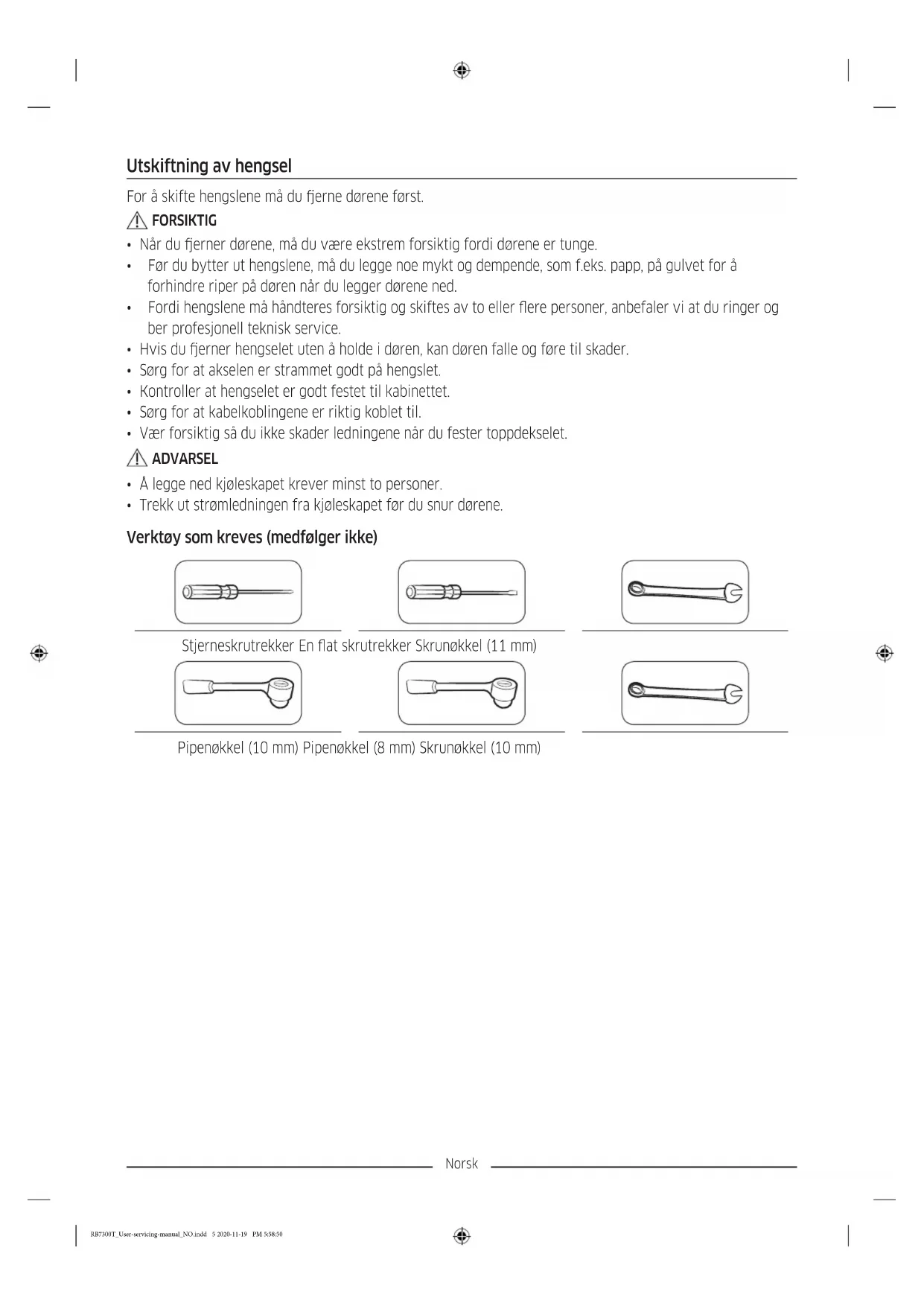 - Trekk ut strømledningen fra kjøleskapet før du snur dørene. Verktøy som kreves (medfølger ikke) Stjerneskrutrekker En at skrutrekker Skrunøkkel (11 mm) Pipenøkkel (10 mm) Pipenøkkel (8 mm) Skrunøkkel (10 mm) RB7300T_User-servicing-manual_NO.indd 5 2020-11-19 PM 5:58:50Norsk Reversere døren MERK For modeller med håndtak, reverser håndtakene først. (For mer informasjon, se «Utskiftning av håndtak (for modeller med avlange håndtak)»-delen.)