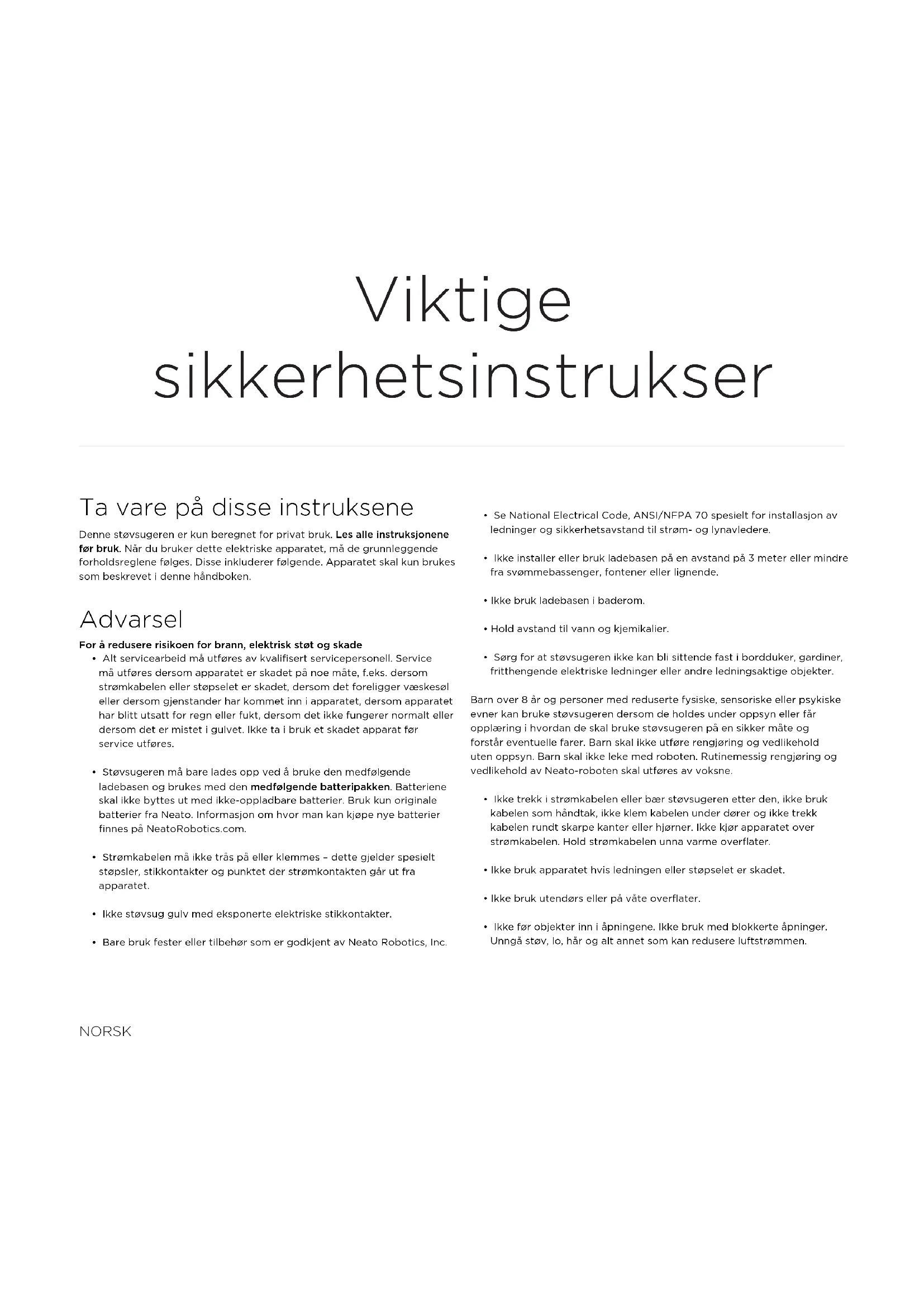 - Sørg for at støvsugeren ikke kan bli sittende fast i bordduker, gardiner, fritthengende elektriske ledninger eller andre ledningsaktige objekter. Barn over 8 år og personer med reduserte fysiske, sensoriske eller psykiske evner kan bruke støvsugeren dersom de holdes under oppsyn eller får opplæring i hvordan de skal bruke støvsugeren på en sikker måte og forstår eventuelle farer. Barn skal ikke utføre rengjøring og vedlikehold uten oppsyn. Barn skal ikke leke med roboten. Rutinemessig rengjøring og vedlikehold av Neato-roboten skal utføres av voksne.