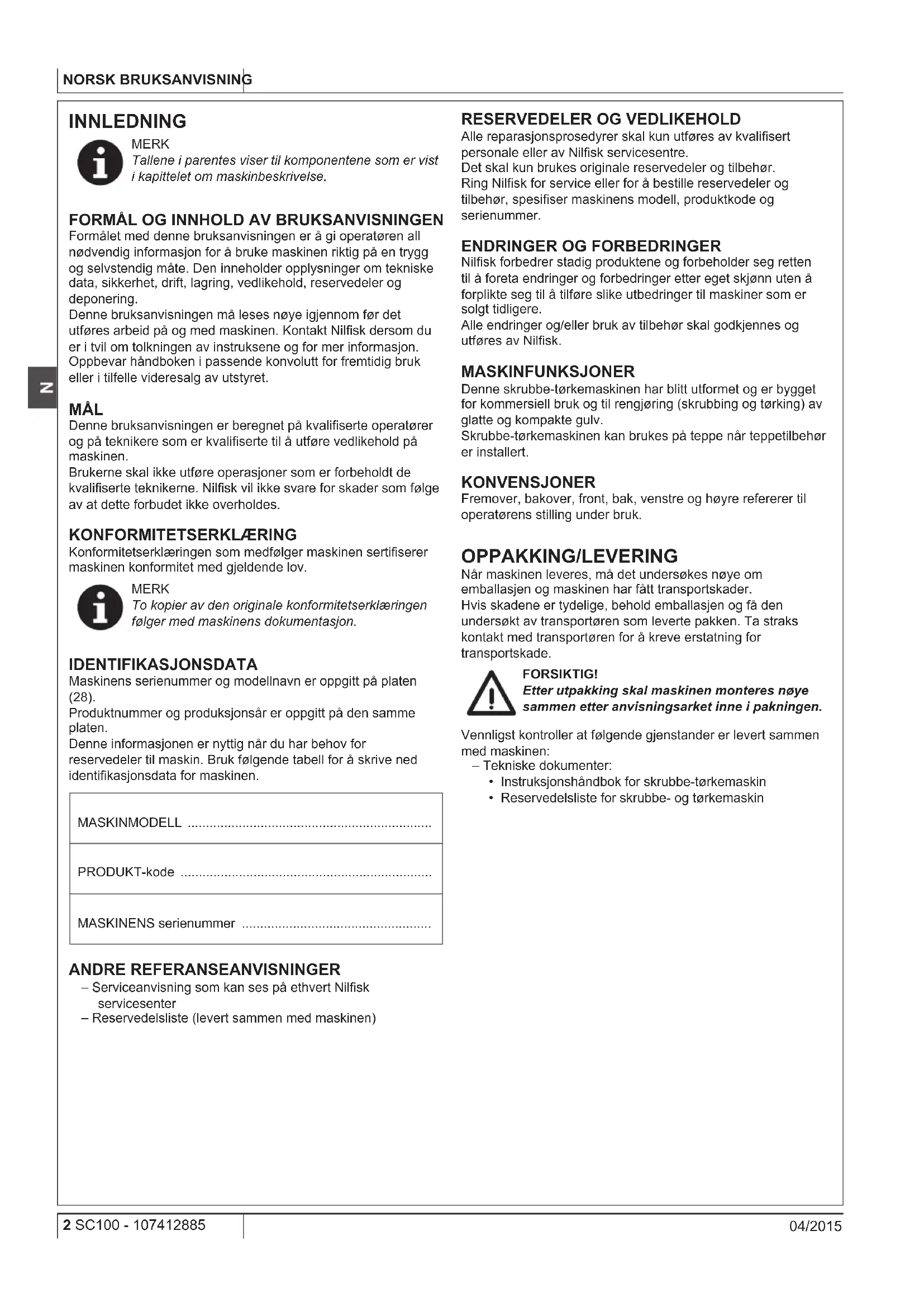 Nilsk forbedrer stadig produktene og forbeholder seg retten til å foreta endringer og forbedringer etter eget skjønn uten å forplikte seg til å tilføre slike utbedringer til maskiner som er solgt tidligere. Alle endringer og/eller bruk av tilbehør skal godkjennes og utføres av Nilsk. MASKINFUNKSJONER Denne skrubbe-tørkemaskinen har blitt utformet og er bygget for kommersiell bruk og til rengjøring (skrubbing og tørking) av glatte og kompakte gulv. Skrubbe-tørkemaskinen kan brukes på teppe når teppetilbehør er installert. KONVENSJONER Fremover, bakover, front, bak, venstre og høyre refererer til operatørens stilling under bruk. OPPAKKING/LEVERING Når maskinen leveres, må det undersøkes nøye om emballasjen og maskinen har fått transportskader. Hvis skadene er tydelige, behold emballasjen og få den undersøkt av transportøren som leverte pakken. Ta straks kontakt med transportøren for å kreve erstatning for transportskade. FORSIKTIG! Etter utpakking skal maskinen monteres nøye sammen etter anvisningsarket inne i pakningen. Vennligst kontroller at følgende gjenstander er levert sammen med maskinen: – Tekniske dokumenter: