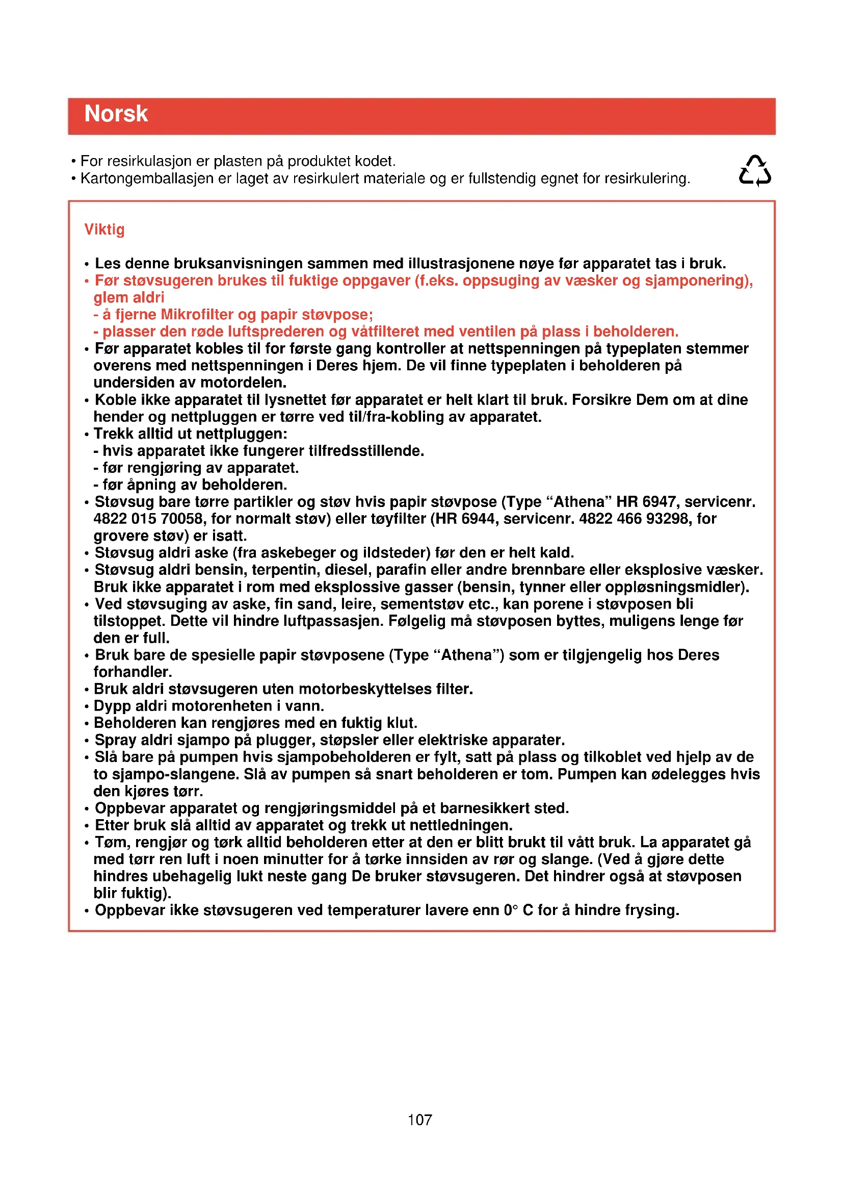 - Støvsug bare tørre partikler og støv hvis papir støvpose (Type “Athena” HR 6947, servicenr. 4822 015 70058, for normalt støv) eller tøyfilter (HR 6944, servicenr. 4822 466 93298, for grovere støv) er isatt.