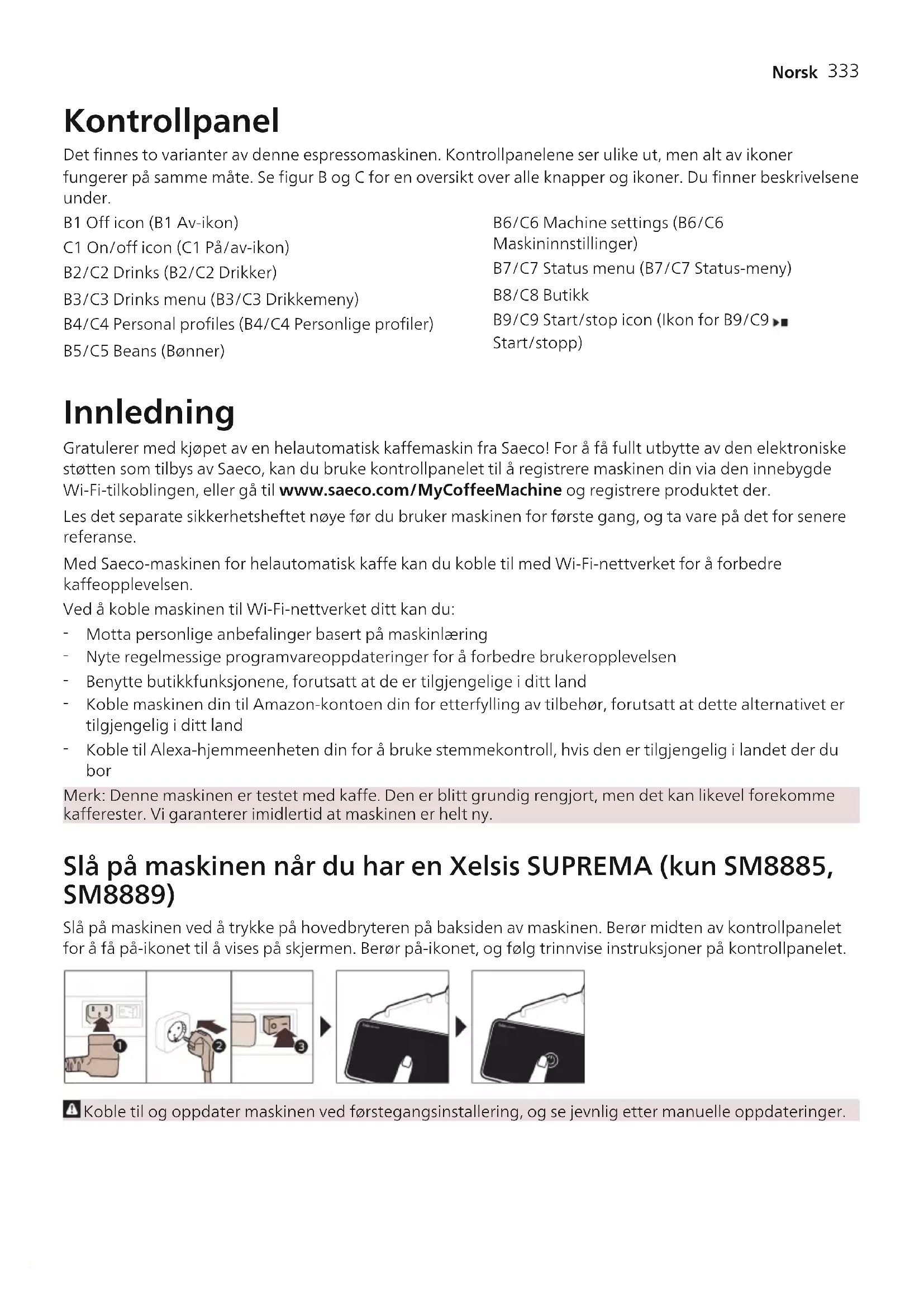 Koble til Alexa-hjemmeenheten din for å bruke stemmekontroll, hvis den er tilgjengelig i landet der du bor Merk: Denne maskinen er testet med kaffe. Den er blitt grundig rengjort, men det kan likevel forekomme kafferester. Vi garanterer imidlertid at maskinen er helt ny. Slå på maskinen når du har en Xelsis SUPREMA (kun SM8885, SM8889) Slå på maskinen ved å trykke på hovedbryteren på baksiden av maskinen. Berør midten av kontrollpanelet for å få på-ikonet til å vises på skjermen. Berør på-ikonet, og følg trinnvise instruksjoner på kontrollpanelet. Koble til og oppdater maskinen ved førstegangsinstallering, og se jevnlig etter manuelle oppdateringer.334 Norsk Slå på maskinen når du har en Xelsis DELUXE (kun SM8780, SM8782, SM8785) Slå på maskinen ved å trykke på hovedbryteren på baksiden av maskinen. Berør på-ikonet, og følg trinnvise instruksjoner på kontrollpanelet. Koble til og oppdater maskinen ved førstegangsinstallering, og se jevnlig etter manuelle oppdateringer. Koble til Wi-Fi Koble kaffemaskinen til et 2,4 GHz 802.11 b/g/n Wi-Fi-hjemmenettverk. Ved å koble kaffemaskinen til Wi-Fi-hjemmenettverket ditt får du en bedre brukeropplevelse. Sørg for at kaffemaskinen og Wi-Fi-ruteren er innenfor hverandres rekkevidde. Følg trinnene under for å koble kaffemaskinen din til Wi-Fi-nettverket. 1 Trykk på Innstillinger-ikonet og sveip fra venstre til høyre for å finne Wi-Fi-ikonet. 2 Trykk på Wi-Fi-ikonet. 3 Følg trinnene på skjermen for å koble maskinen til Wi-Fi-nettverket. Du er nå klar for en tilkoblet opplevelse. Maskinen utfører den automatiske skyllesyklusen når den slås av og på via stemmekontroll, og når maskinen har vært inaktiv en stund og slår seg av. Kontroller at miljøet på maskinen er trygt. Spesielle funksjoner Spesialfunksjon Formål Med BeanMaestro kan du velge type og brenthet på bønnene. Den optimaliserer deretter bryggeinnstillingene automatisk for å hente ut det beste i kaffebønnene.335 Norsk HygieSteam-funksjonen rengjør melkesystemet automatisk, og fjerner mikroorganismer: Bruk den etter at du har brygget cappuccino eller andre melkebaserte drikker. Vår slitesterke kvern er laget av 100% keramikk, og er utrolig hard og presis. Den kan justeres etter egen smak med 12 trinns nivåer. Instrumentbordet for vedlikehold gir deg en nyttig oversikt og holder deg informert om blant annet vannivået eller om det begynner å bli tomt for AquaClean. Brygge drikker Generelle trinn Du kan trakte en drikk ved å følge noen få enkle trinn. 1 Fyll vanntanken med springvann, og fyll bønnekvernen med kaffebønner. 2 Sett én eller to kopper under den høydejusterbare tuten. Skyv kaffetuten opp- eller nedover for å justere høyden i henhold til koppen eller glasset som du bruker. 3 Trykk på Drikker-ikonet for å åpne "Drikker"-menyen. Sveip fra venstre til høyre for å finne ønsket drikk, og trykk på den for å velge den.