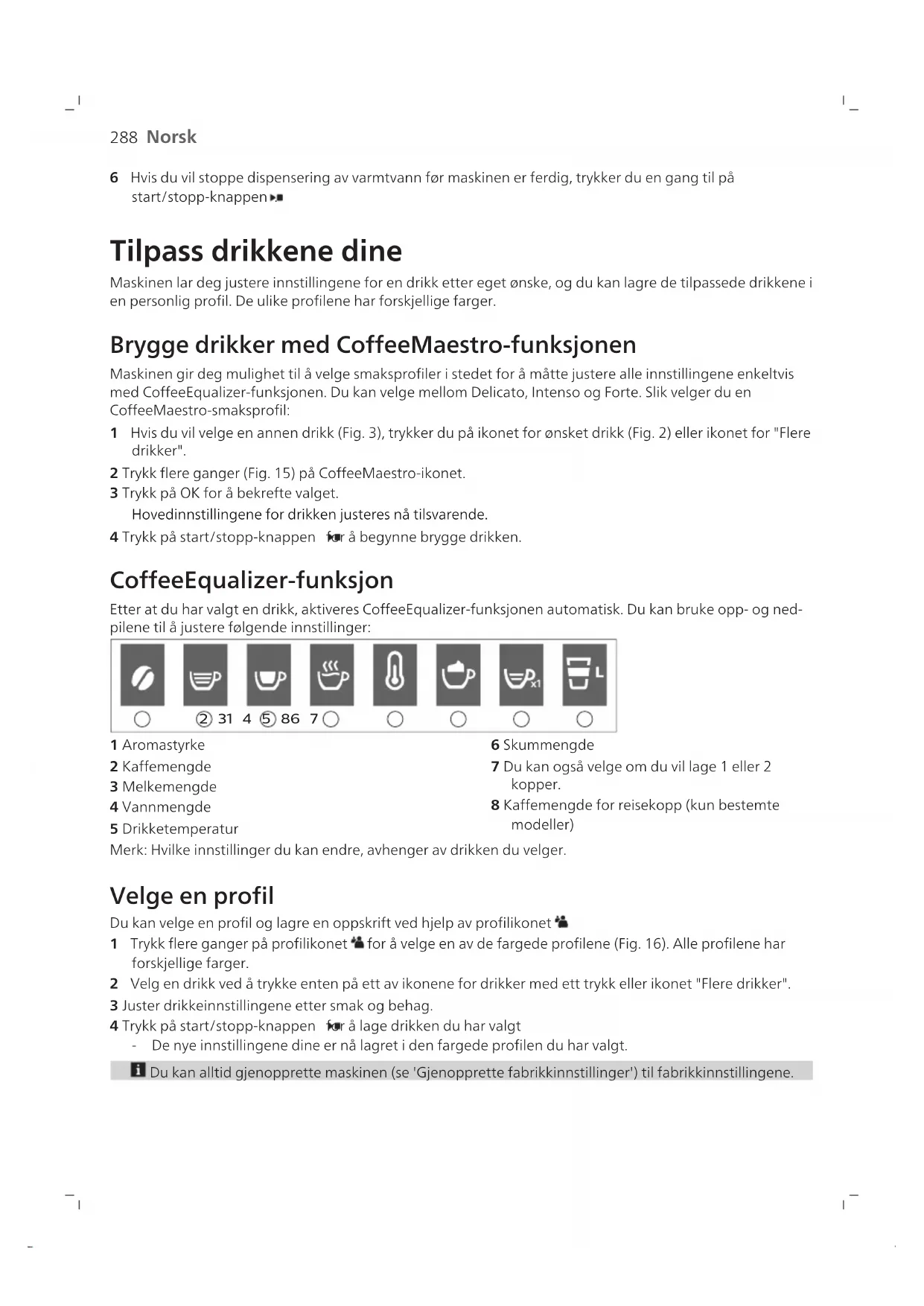Hvis du vil stoppe dispensering av melk før maskinen har dispensert den forhåndsinnstilte mengden, trykker du på start/stopp -knappen. 6 Hvis du vil stoppe dispensering av den ferdige drikken (melk og kaffe) før maskinen er ferdig, trykker du på og holder inne start/stopp -knappen. 7 Rett etter at melken er fylt på, utføres "HygieSteam Shot". Maskinen presser damp gjennom det integrerte melkesystemet for å spyle det raskt. Kaffebrygging med forhåndsmalt kaffe 1 Vipp lokket og hell én måleskje med forhåndsmalt kaffe i kammeret (Fig. 11) for forhåndsmalt kaffe. 2 Etter at du har valgt en drikk, bruker du opp- og ned-pilene for å velge forhåndsmalt kaffe (Fig. 12). Trykk deretter på start/stopp -knappen. Merk: Hvis du velger forhåndsmalt kaffe, vil du ikke kunne justere kaffestyrken og/eller brygge flere drikker samtidig. Tappe varmt vann 1 Kontroller at den integrerte automatiske melkeskummeren er ordentlig festet til maskinen (Fig. 13). 2 Plasser en kopp under tuten 3 Trykk på "Flere drikker"-ikonet (Fig. 3) og bla nedover for å velge "Varmt vann". 4 Bruk opp- og ned-pilene for å justere ønsket (Fig. 14) mengde varmt vann eller temperatur. 5 Trykk på start/stopp- knappen.288 Norsk 6 Hvis du vil stoppe dispensering av varmtvann før maskinen er ferdig, trykker du en gang til på start/stopp-knappen . Tilpass drikkene dine Maskinen lar deg justere innstillingene for en drikk etter eget ønske, og du kan lagre de tilpassede drikkene i en personlig profil. De ulike profilene har forskjellige farger. Brygge drikker med CoffeeMaestro-funksjonen Maskinen gir deg mulighet til å velge smaksprofiler i stedet for å måtte justere alle innstillingene enkeltvis med CoffeeEqualizer-funksjonen. Du kan velge mellom Delicato, Intenso og Forte. Slik velger du en CoffeeMaestro-smaksprofil: 1 Hvis du vil velge en annen drikk (Fig. 3), trykker du på ikonet for ønsket drikk (Fig. 2) eller ikonet for "Flere drikker". 2 Trykk flere ganger (Fig. 15) på CoffeeMaestro-ikonet. 3 Trykk på OK for å bekrefte valget. Hovedinnstillingene for drikken justeres nå tilsvarende. 4 Trykk på start/stopp-knappen for å begynne brygge drikken. CoffeeEqualizer-funksjon Etter at du har valgt en drikk, aktiveres CoffeeEqualizer-funksjonen automatisk. Du kan bruke opp- og ned- pilene til å justere følgende innstillinger: