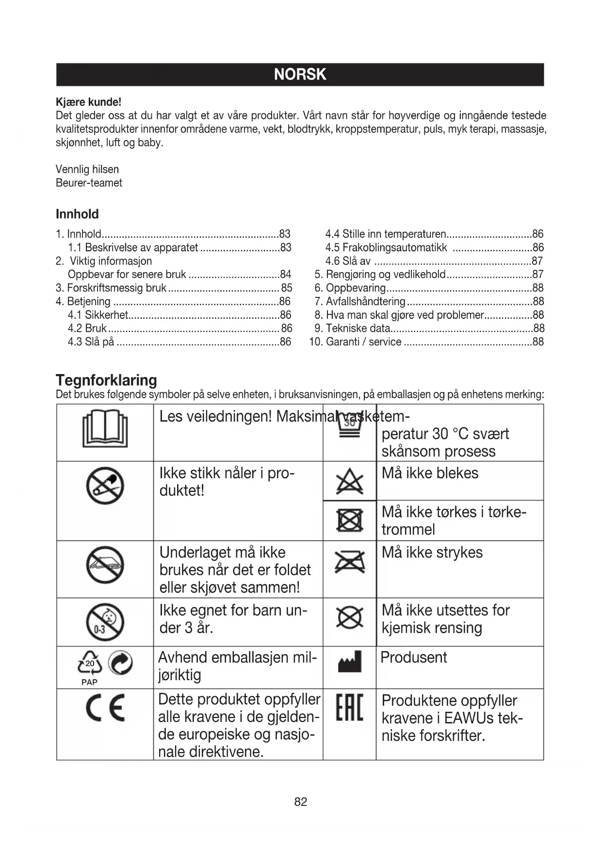 Innhold Kjære kunde! Det gleder oss at du har valgt et av våre produkter. Vårt navn står for høyverdige og inngående testede kvalitetsprodukter innenfor områdene varme, vekt, blodtrykk, kroppstemperatur, puls, myk terapi, massasje, skjønnhet, luft og baby. Vennlig hilsen Beurer-teamet83 Apparat i beskyttelse- sklasse2 Avhendes i samsvar med EU-direktivet for elektrisk og elektronisk utstyr WEEE (Waste Electrical and Electronic Equipment) KEMA KEUR merket dokumenterer sikkerheten og sam- svar med en standard for elektriske produkter. Tekstilene som benyttes ved dette apparatet oppfyller de høye humanøkologiske krav i Oeko-Tex Standard 100, som påvist av Forschungsinstitut Hohenstein. ADVARSEL; Farehenvisning til fare for skader eller fare for din helse. OBS; Sikkerhetshenvisning til mulige skader på apparat/ tilbehør. HENVISNING; Henvisning til viktig informasjon.