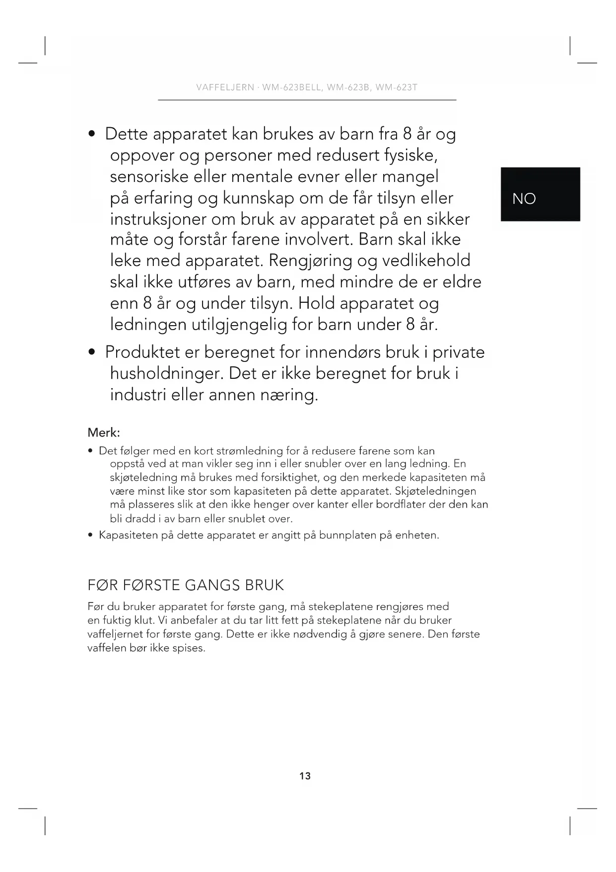 - Dette apparatet kan brukes av barn fra 8 år og oppover og personer med redusert fysiske, sensoriske eller mentale evner eller mangel på erfaring og kunnskap om de får tilsyn eller instruksjoner om bruk av apparatet på en sikker måte og forstår farene involvert. Barn skal ikke leke med apparatet. Rengjøring og vedlikehold skal ikke utføres av barn, med mindre de er eldre enn 8 år og under tilsyn. Hold apparatet og ledningen utilgjengelig for barn under 8 år.