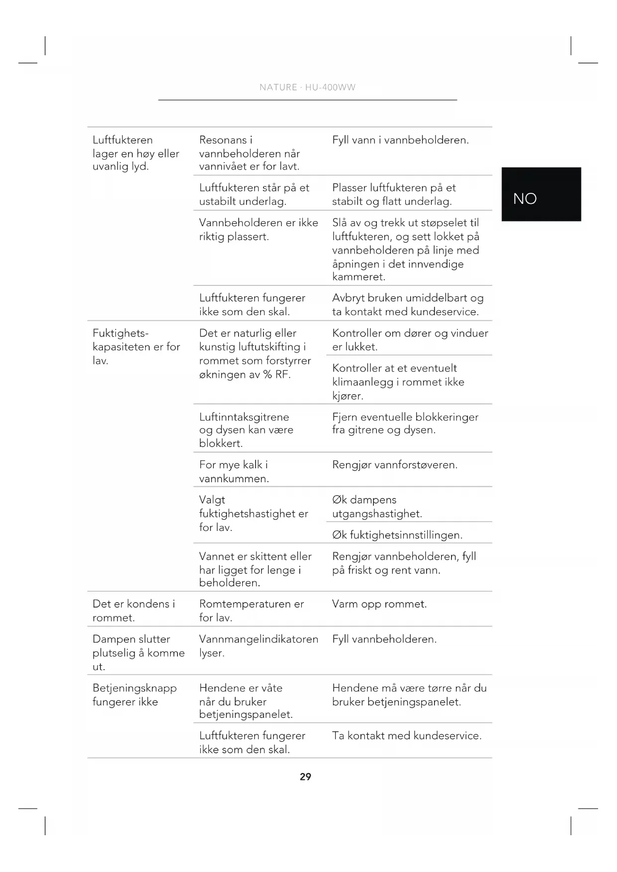 Luftfukteren lager en høy eller uvanlig lyd. Resonans i vannbeholderen når vannivået er for lavt. Fyll vann i vannbeholderen. Luftfukteren står på et ustabilt underlag. Plasser luftfukteren på et stabilt og att underlag. Vannbeholderen er ikke riktig plassert. Slå av og trekk ut støpselet til luftfukteren, og sett lokket på vannbeholderen på linje med åpningen i det innvendige kammeret. Luftfukteren fungerer ikke som den skal. Avbryt bruken umiddelbart og ta kontakt med kundeservice. Fuktighets- kapasiteten er for lav. Det er naturlig eller kunstig luftutskifting i rommet som forstyrrer økningen av % RF. Kontroller om dører og vinduer er lukket. Kontroller at et eventuelt klimaanlegg i rommet ikke kjører. Luftinntaksgitrene og dysen kan være blokkert. Fjern eventuelle blokkeringer fra gitrene og dysen. For mye kalk i vannkummen. Rengjør vannforstøveren. Valgt fuktighetshastighet er for lav. Øk dampens utgangshastighet. Øk fuktighetsinnstillingen. Vannet er skittent eller har ligget for lenge i beholderen. Rengjør vannbeholderen, fyll på friskt og rent vann. Det er kondens i rommet. Romtemperaturen er for lav. Varm opp rommet. Dampen slutter plutselig å komme ut. Vannmangelindikatoren lyser. Fyll vannbeholderen. Betjeningsknapp fungerer ikke Hendene er våte når du bruker betjeningspanelet. Hendene må være tørre når du bruker betjeningspanelet. Luftfukteren fungerer ikke som den skal. Ta kontakt med kundeservice.30