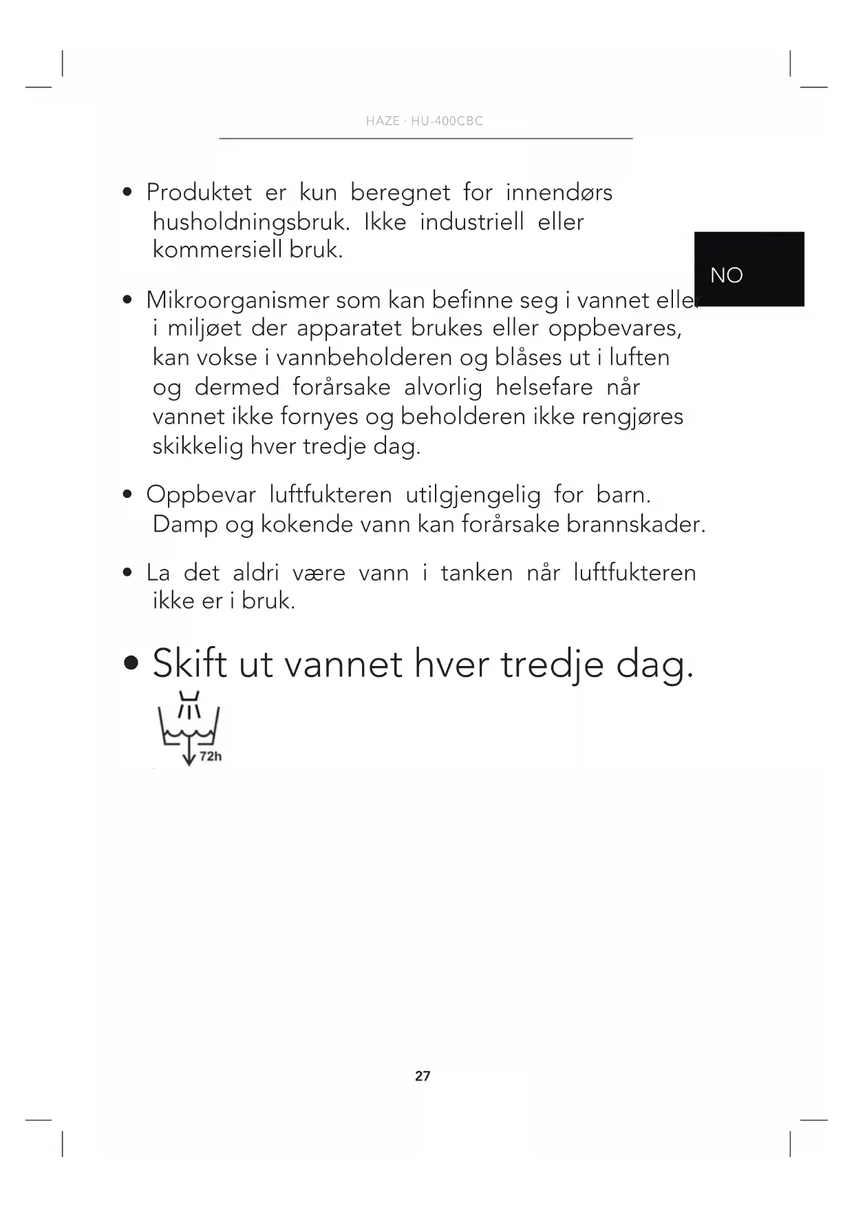- Skrap aldri vannforstøveren med et hardt verktøy. Luftfukteren må rengjøres regelmessig. Les rengjøringsanvisningene i denne bruks- anvisningen for mer informasjon.26
