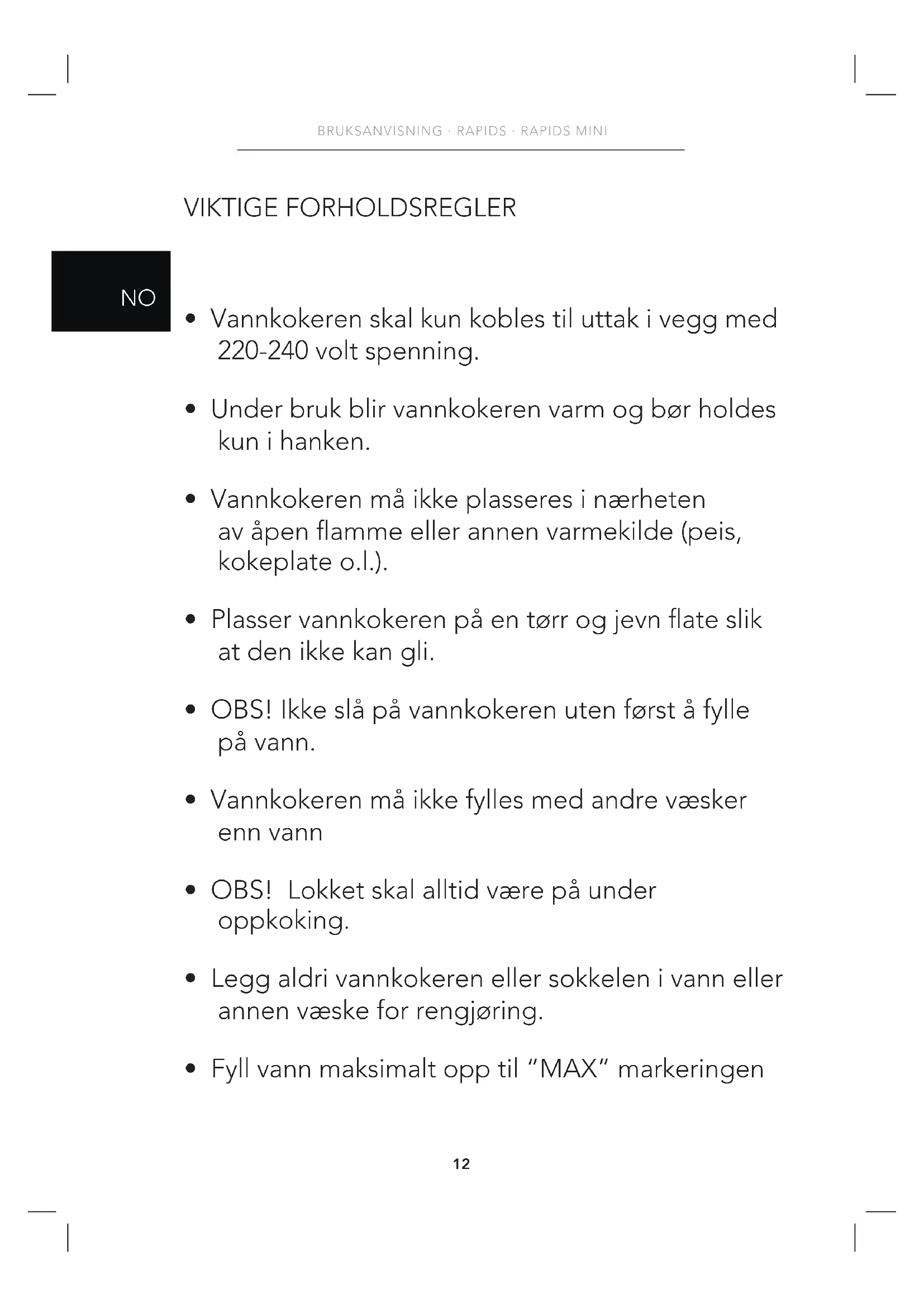 - OBS! Ikke slå på vannkokeren uten først å fylle på vann.