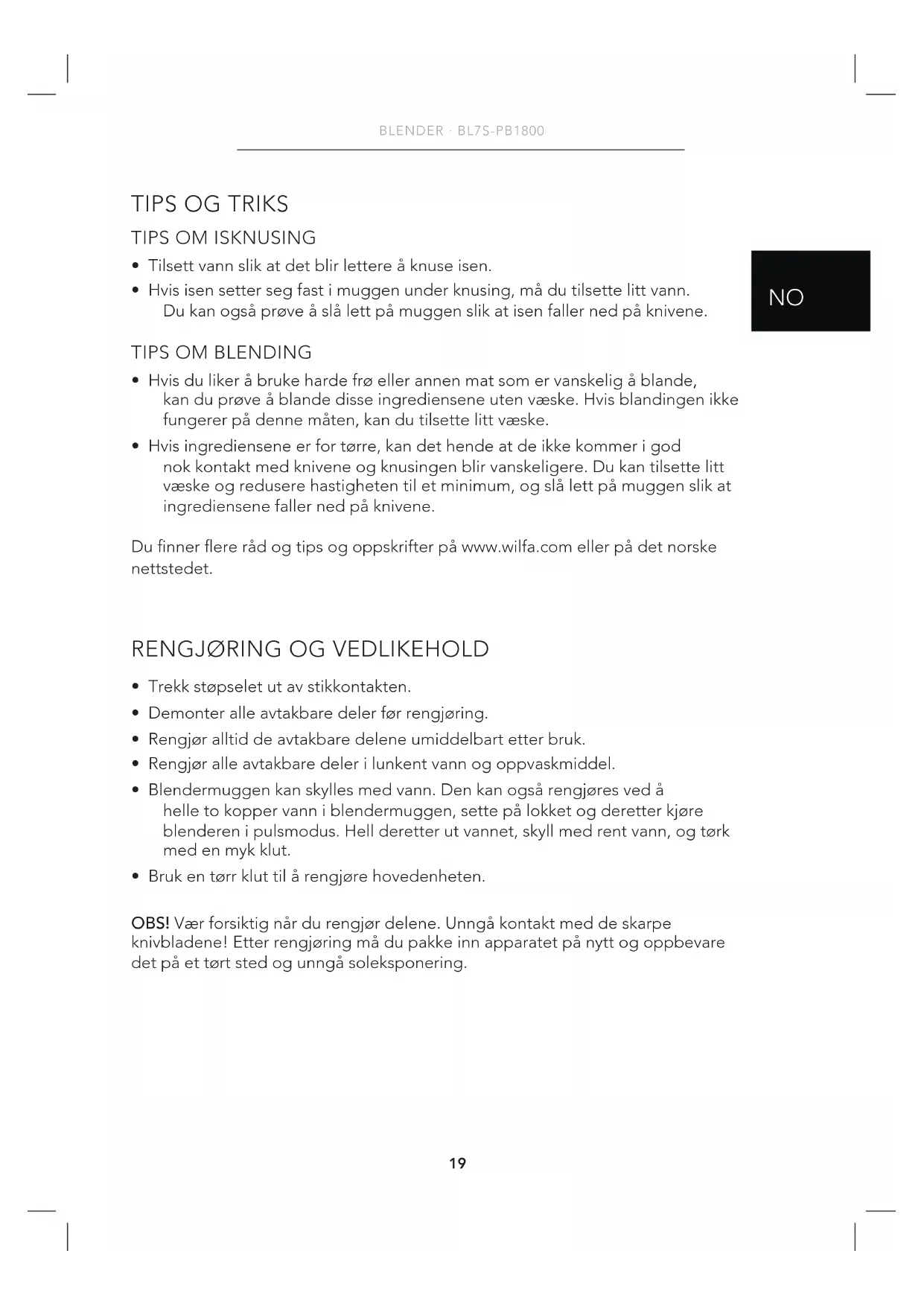 - Hvis ingrediensene er for tørre, kan det hende at de ikke kommer i god nok kontakt med knivene og knusingen blir vanskeligere. Du kan tilsette litt væske og redusere hastigheten til et minimum, og slå lett på muggen slik at ingrediensene faller ned på knivene. Du nner ere råd og tips og oppskrifter på www.wilfa.com eller på det norske nettstedet.