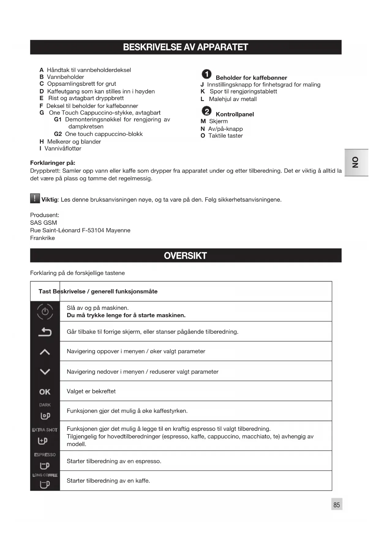 Viktig: Les denne bruksanvisningen nøye, og ta vare på den. Følg sikkerhetsanvisningene. Produsent: SAS GSMRue Saint-Léonard F-53104 MayenneFrankrike OVERSIKT Forklaring på de forskjellige tastene Tast Beskrivelse / generell funksjonsmåteSlå av og på maskinen. Du må trykke lenge for å starte maskinen. Går tilbake til forrige skjerm, eller stanser pågående tilberedning. Navigering oppover i menyen / øker valgt parameterNavigering nedover i menyen / reduserer valgt parameterValget er bekreftetFunksjonen gjør det mulig å øke kaffestyrken.Funksjonen gjør det mulig å legge til en kraftig espresso til valgt tilberedning. Tilgjengelig for hovedtilberedninger (espresso, kaffe, cappuccino, macchiato, te) avhengig av modell. Starter tilberedning av en espresso. Starter tilberedning av en kaffe.86 Starter tilberedning av en cappuccino. MACCHIATO Starter tilberedning av en macchiato (en stor mengde melk, en shot av espresso, toppet av med kremaktig melkeskum). Gir tilgang til meny for tilberedning av te eller te laget på teblader. Gir tilgang til ere tilberedninger: ristretto, melkeskum, doppio, americano (avhengig av modell). Gir tilgang til generell meny (maskininnstillinger, vedlikehold og produktinformasjon). Forklaringer på tastelys Når et tastelys er slukket, er tilsvarende funksjon ikke tilgjengelig. Når lyset er svakt, er funksjonen tilgjengelig og kan velges. Når ønsket funksjon er i gang, blir lyset kraftig. OPPSTART