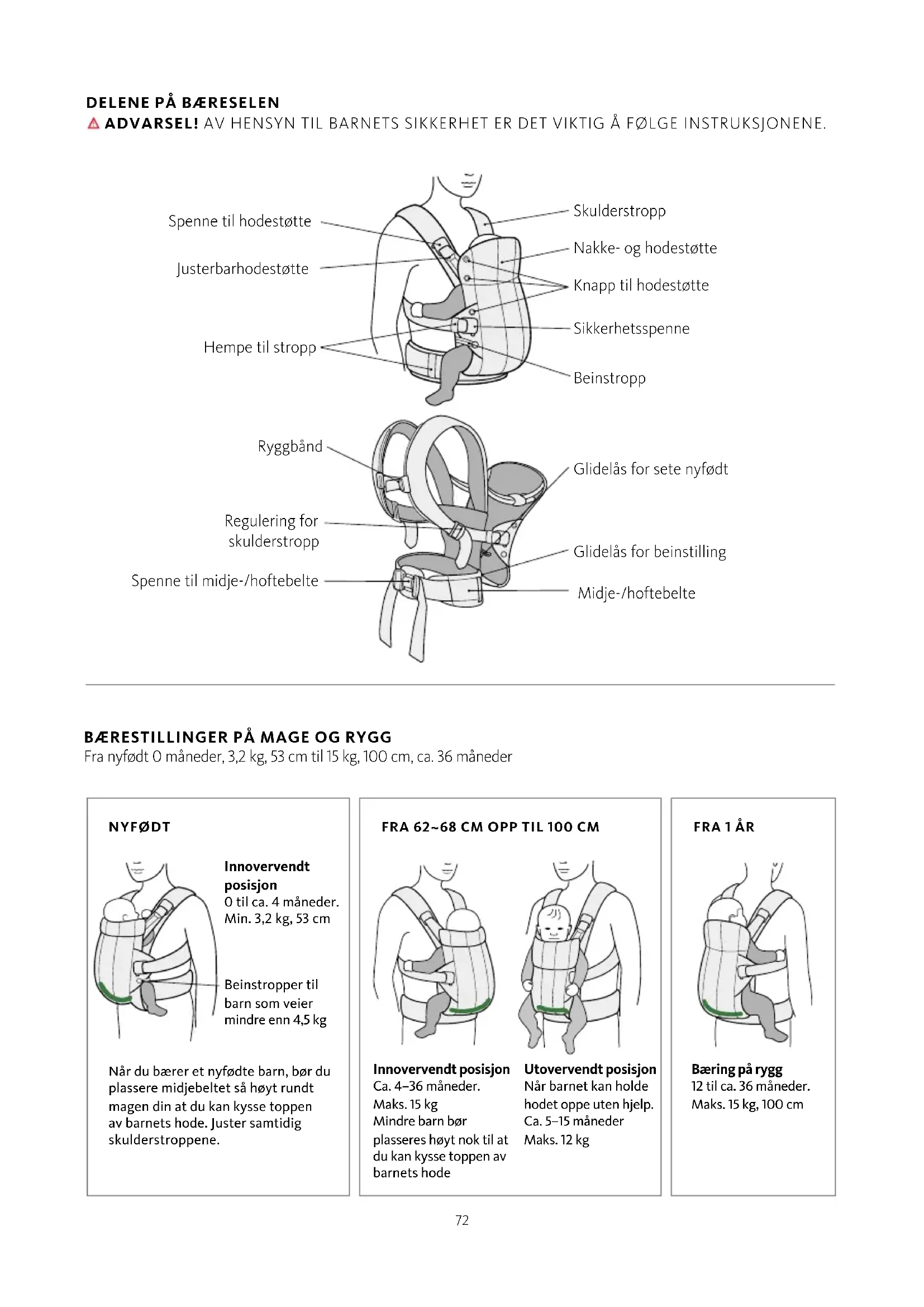 Fra nyfødt 0 måneder, 3,2 kg, 53 cm til 15 kg, 100 cm, ca. 36 måneder Utovervendt posisjon Når barnet kan holde hodet oppe uten hjelp. Ca. 5–15 måneder Maks. 12 kg Bæring på rygg 12 til ca. 36 måneder. Maks. 15 kg, 100 cm Innovervendt posisjon Ca. 4–36 måneder. Maks. 15 kg Mindre barn bør plasseres høyt nok til at du kan kysse toppen av barnets hode Spenne til hodestøtte Hempe til stropp Skulderstropp Nakke- og hodestøtte Knapp til hodestøtte Sikkerhetsspenne Beinstropp Ryggbånd Spenne til midje-/hoftebelte Regulering for skulderstropp Glidelås for beinstilling Midje-/hoftebelte Glidelås for sete nyfødt Justerbar hodestøtte NYFØDT Når du bærer et nyfødte barn, bør du plassere midjebeltet så høyt rundt magen din at du kan kysse toppen av barnets hode. Juster samtidig skulderstroppene. Innovervendt posisjon 0 til ca. 4 måneder. Min. 3,2 kg, 53 cm Beinstropper til barn som veier mindre enn 4,5 kg