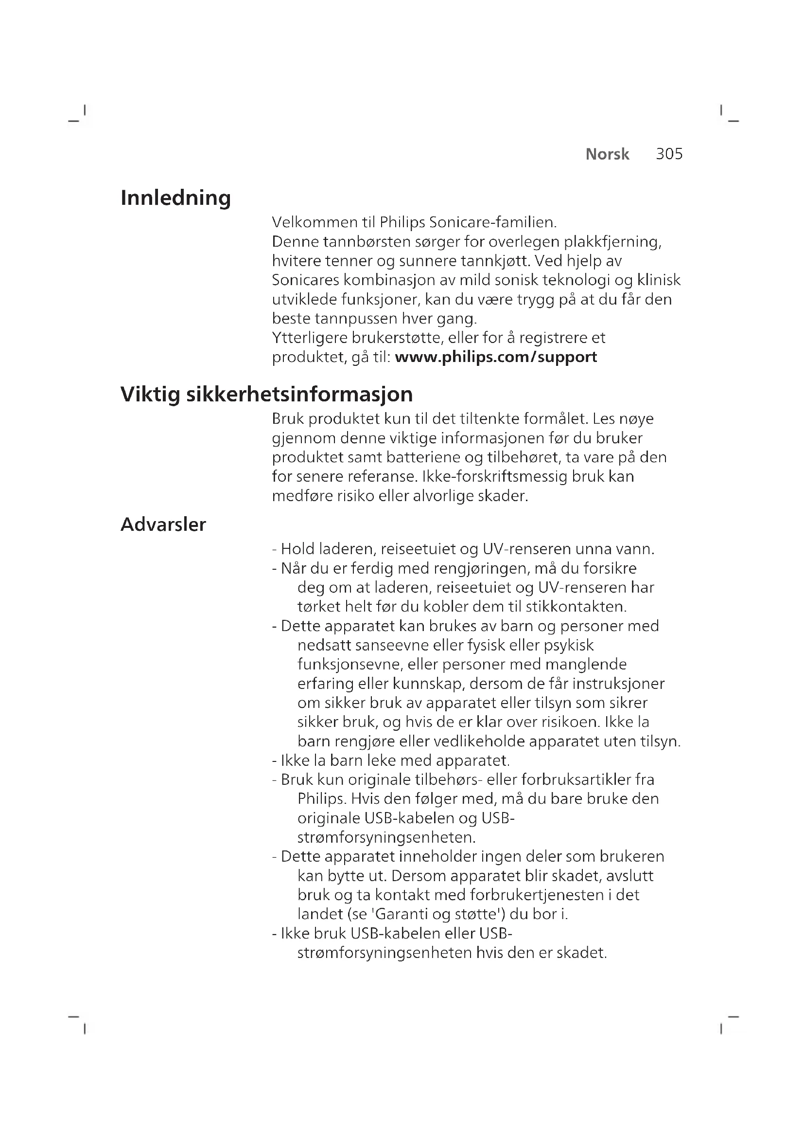 Norsk Innledning Velkommen til Philips Sonicare-familien. Denne tannbørsten sørger for overlegen plakkfjerning, hvitere tenner og sunnere tannkjøtt. Ved hjelp av Sonicares kombinasjon av mild sonisk teknologi og klinisk utviklede funksjoner, kan du være trygg på at du får den beste tannpussen hver gang. Ytterligere brukerstøtte, eller for å registrere et produktet, gå til: www.philips.com/support Viktig sikkerhetsinformasjon Bruk produktet kun til det tiltenkte formålet. Les nøye gjennom denne viktige informasjonen før du bruker produktet samt batteriene og tilbehøret, ta vare på den for senere referanse. Ikke-forskriftsmessig bruk kan medføre risiko eller alvorlige skader. Advarsler - Hold laderen, reiseetuiet og UV-renseren unna vann. - Når du er ferdig med rengjøringen, må du forsikre deg om at laderen, reiseetuiet og UV-renseren har tørket helt før du kobler dem til stikkontakten. - Dette apparatet kan brukes av barn og personer med nedsatt sanseevne eller fysisk eller psykisk funksjonsevne, eller personer med manglende erfaring eller kunnskap, dersom de får instruksjoner om sikker bruk av apparatet eller tilsyn som sikrer sikker bruk, og hvis de er klar over risikoen. Ikke la barn rengjøre eller vedlikeholde apparatet uten tilsyn. - Ikke la barn leke med apparatet. - Bruk kun originale tilbehørs- eller forbruksartikler fra Philips. Hvis den følger med, må du bare bruke den originale USB-kabelen og USB- strømforsyningsenheten. - Dette apparatet inneholder ingen deler som brukeren kan bytte ut. Dersom apparatet blir skadet, avslutt bruk og ta kontakt med forbrukertjenesten i det landet (se 'Garanti og støtte') du bor i. - Ikke bruk USB-kabelen eller USB- strømforsyningsenheten hvis den er skadet.306 Norsk - Ikke bruk laderen, reiseetuiet og/eller UV-renseren utendørs eller i nærheten av oppvarmede overflater. - Ikke vask noen av produktets deler i oppvaskmaskinen. - Dette apparatet er utformet for rengjøring av tenner, tannkjøtt og tunge. - Oppbevar UV-renseren til enhver tid utilgjengelig for barn. - Slutt å bruke UV-renseren hvis UV-LED-lampen/- lyspæren fortsetter å lyse når UV-renseren er åpen. UV-lys kan være skadelig for øyne og hud. - Bruk kun desinfiseringsenheten når beskyttelsesskjermen er på plass. - Ikke ta på UV-lyspæren på UV-renseren når den er varm. - Ikke bruk børstehoder med knekte eller bøyde hår. Skift børstehode hver tredje måned eller tidligere hvis du ser tegn på slitasje. - Unngå direkte kontakt med produkter som inneholder essensielle oljer eller kokosolje. Ved kontakt kan børstehår løsne. - Produktet kan brukes ved maks 4500 meter over havet. MEDISINSKE ADVARSLER - Slutt å bruke apparatet og rådfør deg med tannlegen/legen din dersom det oppstår for mye blødning etter bruk, dersom blødningen vedvarer etter 1 ukes bruk eller hvis du opplever ubehag eller smerte. - Ta kontakt med tannlegen før du bruker apparatet hvis du har hatt operasjoner i tannkjøttet eller andre deler av munnen i løpet av de siste to månedene. - Hvis du har pacemaker eller en annen implantert enhet, bør du ta kontakt med legen eller produsenten av den implanterte enheten før bruk. - Ta kontakt med lege før du bruker apparatet hvis du har medisinske bekymringer. - Dette apparatet er beregnet på personlig tannhygiene. Den er ikke laget for bruk på flere pasienter på et tannlegekontor eller en institusjon.307 Norsk Sikkerhetsinstruksjoner for batteri - Dette apparatet inneholder batterier som bare må byttes ut av en person med opplæring. - Bruk produktet kun til det tiltenkte formålet. Les nøye gjennom denne informasjonen før du bruker produktet samt batteriene og tilbehøret, ta vare på den for senere referanse. Ikke-forskriftsmessig bruk kan medføre risiko eller alvorlige skader. Tilbehøret som følger med, kan variere for de ulike produktene. - Bruk kun originale tilbehørs- eller forbruksartikler fra Philips. Bruk kun den avtakbare forsyningsenheten TCBxxxx (inngangsspenning: 100–240 V~; 50/60 Hz; 1,5 W), HX6100 (inngangsspenning: 100–240 V~; 50/60 Hz; 1,4 W), HX6110 (inngangsspenning: 100–240 V~; 50/60 Hz; 1,5 W), HX6160 (inngangsspenning: 100–240 V~; 50/60 Hz; 6 W), WAAxxxx (inngangsspenning: 100–240 V~; 50/60 Hz; 3,5 W). - Hold produktet og batteriene unna ild, og ikke utsett dem for direkte sollys eller høye temperaturer. - Hvis produktet blir unormalt varmt, avgir lukt, endrer farge eller bruker unormalt lang tid på å lade seg opp, avbryter du bruken og oppladingen og kontakter nærmeste Philips-forhandler. - Ikke legg produktet eller batteriene i en mikrobølgeovn eller på en induksjonskokeplate. - Ikke prøv å åpne, utføre endringer på, stikke hull på, skade eller demontere produktet eller batteriet, siden det kan føre til at batteriet overopphetes eller slipper ut giftige eller farlige stoffer. Unngå kortslutning, overlading og omvendt lading av batteriene. - Dette apparatet inneholder batterier som ikke kan byttes. Når batteriet er på slutten av levetiden, skal apparatet kasseres på en ordentlig måte. Se delen om resirkulering. - Hvis batteriene er skadet eller lekker, skal du passe på at du ikke får batterivæske på huden eller i øynene. Hvis det skulle skje, må du øyeblikkelig skylle med rikelige mengder vann og kontakte lege. - Pass på at du er tørr på hendene og at produktet og batteriene er i tørr stand når du håndterer batteriene.308 Norsk - Lad opp og bruk produktet ved en temperatur på mellom 0 °C og 40 °C. - Ikke la batteripolene på de fjernede batteriene komme i kontakt med metallgjenstander (f.eks. mynter, hårnåler, ringer), da dette kan føre til at batteriene kortsluttes. Ikke pakk inn batteriene i aluminiumsfolie. Teip over batteripolene eller legg batteriene i en plastpose før du kasserer dem. - Dette apparatet inneholder et oppladbart litiumbatteri. MÅ GJENVINNES ELLER KASTES PÅ RIKTIG MÅTE. Lagring og transport Temperatur på -10°C til 60