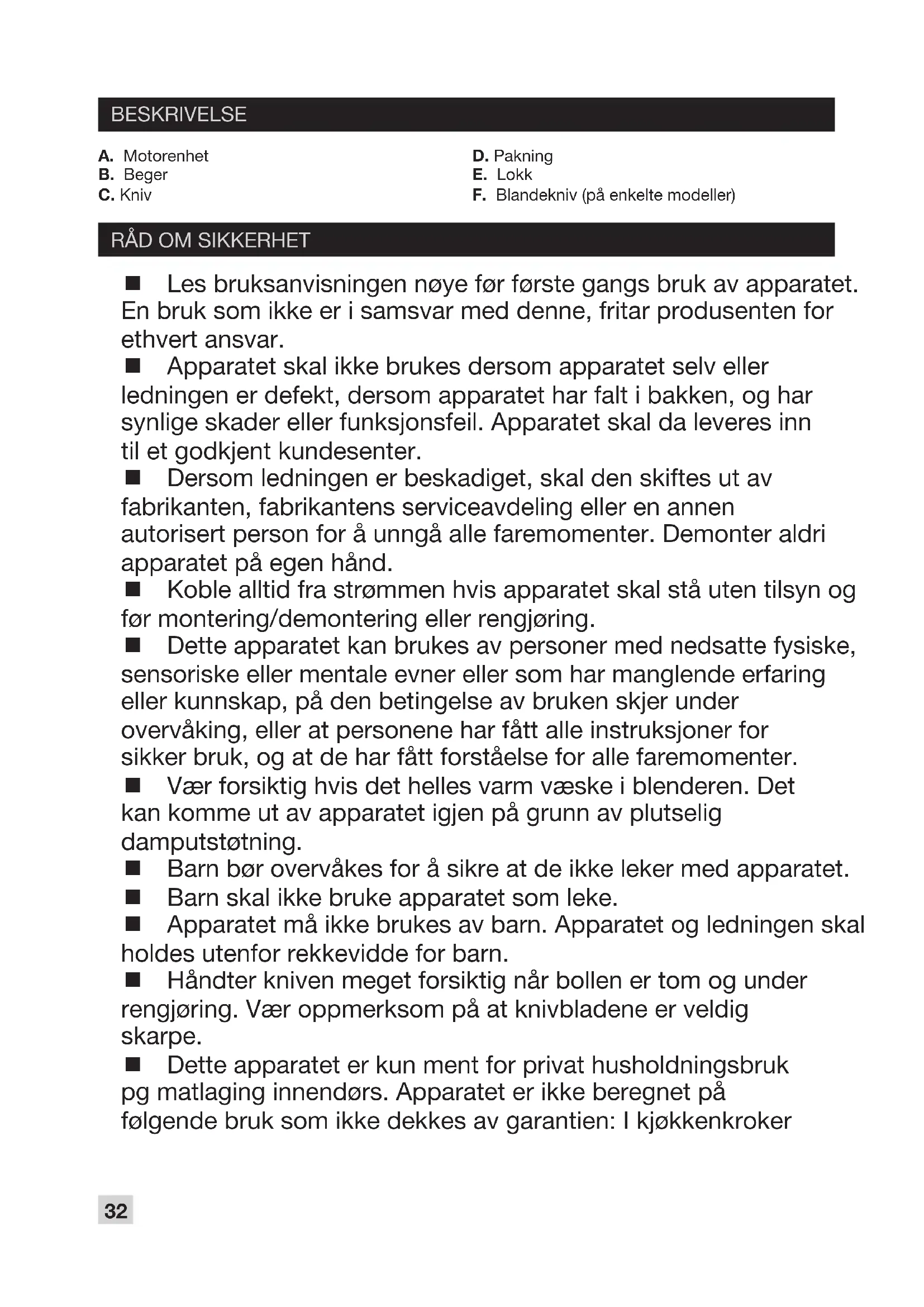 A. Motorenhet B. Beger C. Kniv D. Pakning E. Lokk F. Blandekniv (på enkelte modeller) Les bruksanvisningen nøye før første gangs bruk av apparatet. En bruk som ikke er i samsvar med denne, fritar produsenten for ethvert ansvar. Apparatet skal ikke brukes dersom apparatet selv eller ledningen er defekt, dersom apparatet har falt i bakken, og har synlige skader eller funksjonsfeil. Apparatet skal da leveres inn til et godkjent kundesenter. Dersom ledningen er beskadiget, skal den skiftes ut av fabrikanten, fabrikantens serviceavdeling eller en annen autorisert person for å unngå alle faremomenter. Demonter aldri apparatet på egen hånd. Koble alltid fra strømmen hvis apparatet skal stå uten tilsyn og før montering/demontering eller rengjøring. Dette apparatet kan brukes av personer med nedsatte fysiske, sensoriske eller mentale evner eller som har manglende erfaring eller kunnskap, på den betingelse av bruken skjer under overvåking, eller at personene har fått alle instruksjoner for sikker bruk, og at de har fått forståelse for alle faremomenter. Vær forsiktig hvis det helles varm væske i blenderen. Det kan komme ut av apparatet igjen på grunn av plutselig damputstøtning. Barn bør overvåkes for å sikre at de ikke leker med apparatet. Barn skal ikke bruke apparatet som leke. Apparatet må ikke brukes av barn. Apparatet og ledningen skal holdes utenfor rekkevidde for barn. Håndter kniven meget forsiktig når bollen er tom og under rengjøring. Vær oppmerksom på at knivbladene er veldig skarpe. Dette apparatet er kun ment for privat husholdningsbruk pg matlaging innendørs. Apparatet er ikke beregnet på følgende bruk som ikke dekkes av garantien: I kjøkkenkroker33