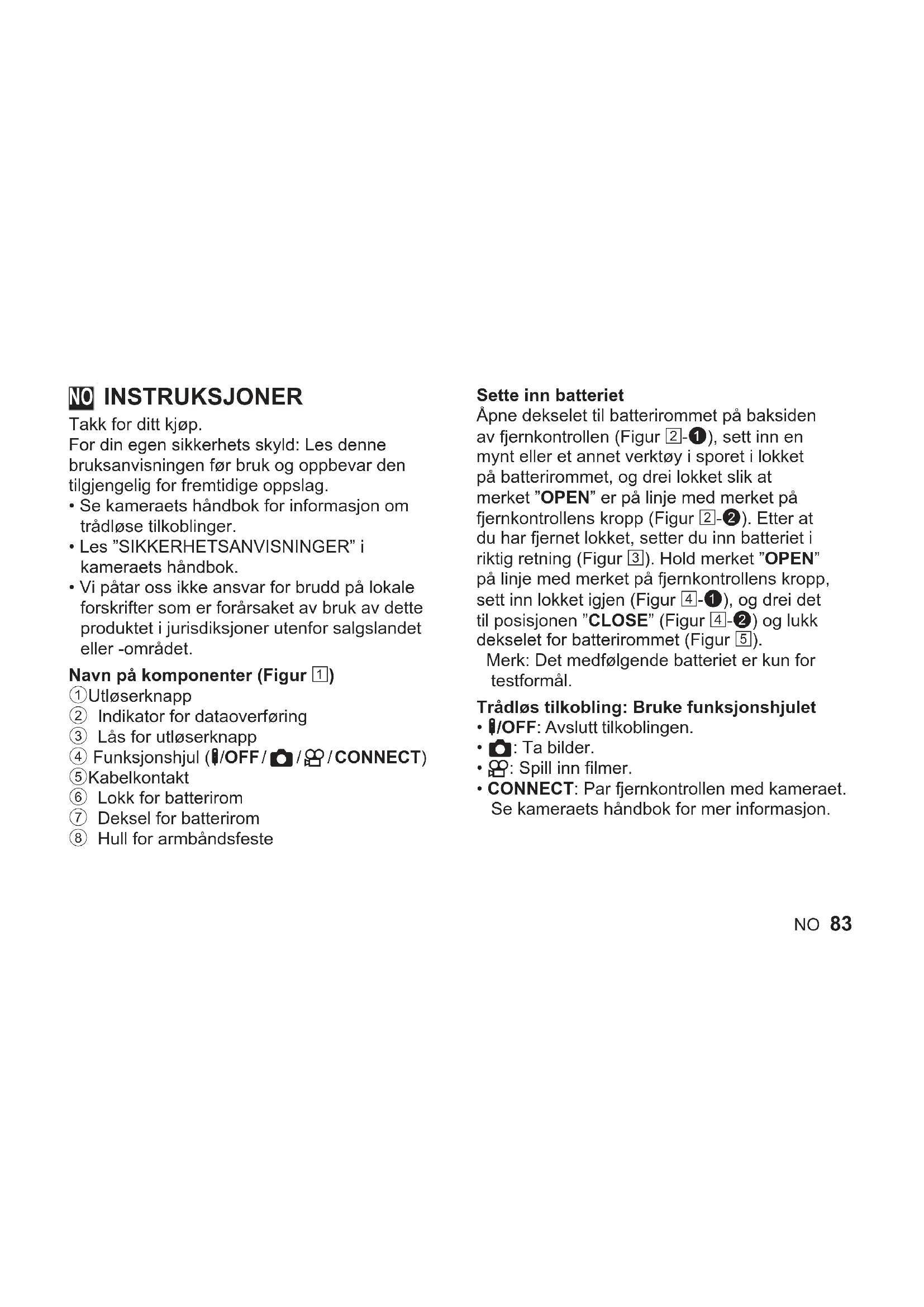 - Vi påtar oss ikke ansvar for brudd på lokale forskrifter som er forårsaket av bruk av dette produktet i jurisdiksjoner utenfor salgslandet eller -området. Navn på komponenter (Figur 1) 1 Utløserknapp 2 Indikator for dataoverføring 3 Lås for utløserknapp 4 Funksjonshjul (b/OFF / K / n / CONNECT) 5 Kabelkontakt 6 Lokk for batterirom 7 Deksel for batterirom 8 Hull for armbåndsfeste Sette inn batteriet Åpne dekselet til batterirommet på baksiden av fjernkontrollen (Figur 2-1), sett inn en mynt eller et annet verktøy i sporet i lokket på batterirommet, og drei lokket slik at merket ”OPEN” er på linje med merket på fjernkontrollens kropp (Figur 2-2). Etter at du har fjernet lokket, setter du inn batteriet i riktig retning (Figur 3). Hold merket ”OPEN” på linje med merket på fjernkontrollens kropp, sett inn lokket igjen (Figur 4-1), og drei det til posisjonen ”CLOSE” (Figur 4-2) og lukk dekselet for batterirommet (Figur 5). Merk: Det medfølgende batteriet er kun for testformål. Trådløs tilkobling: Bruke funksjonshjulet