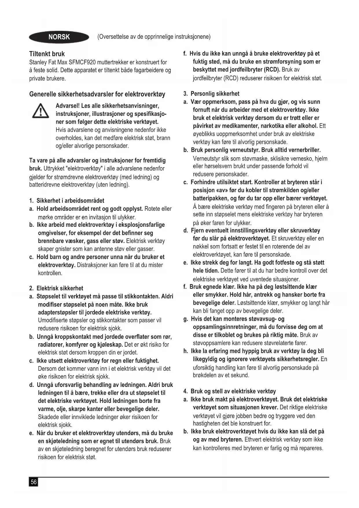 a. Elektroverktøyet skal repareres av kvalisert personell og bare med originale reservedeler. Dette vil sikre at verktøyets sikkerhet blir ivaretatt. b. Skadede batteripakker skal aldri repareres. Service på batteripakker skal kun utføres av produsenten eller autoriserte serviceverksteder. Ytterligere sikkerhetsadvarsler for elektroverktøy Advarsel! Ytterligere sikkerhetsadvarsler for skrunøklerog slag- nøkler. u Hold i det elektriske verktøyet kun i isolerte gripeoverater når du utfører operasjoner hvor skruen kan komme i kontakt med skjulte ledninger. Skruer som kommer i kontakt med en strømførende ledning kan føre til at eksponerte metalldeler på elektroverktøyet blir strømførende, og kan gi brukeren støt. u Bruksområdet er beskrevet i denne bruksanvisningen. Hvis du bruker annet tilbehør, kobler til annet utstyr eller bruker dette produktet til andre oppgaver enn det som er anbefalt i denne håndboken, kan det medføre fare for personskader og/eller skade på eiendom. Andre personers sikkerhet u Dette apparatet er ikke ment for bruk av personer (inkludert barn) med redusert fysiske, sensoriske eller mentale evner, eller mangel på erfaring og kunnskap, med mindre de får tilsyn eller har blitt opplært i bruk av apparatet av en person ansvarlig for deres sikkerhet. u Barn må holdes under oppsyn, sørg for at de ikke leker med apparatet. Restrisikoer Når verktøyet brukes, kan det oppstå ytterligere risikoer som kanskje ikke er beskrevet i de medfølgende sikkerhetsadvarslene. Disse risikoene kan bli forårsaket av feil bruk, langvarig bruk osv. Selv om de relevante sikkerhetsbestemmelsene blir fulgt, og sikkerhetstiltakene blir gjennomført, kan visse gjenværende risikoer ikke unngås. Disse inkluderer: u Personskader som forårsakes av berøring av en roterende/bevegelig del. u Personskader som oppstår ved skifte av deler, blader eller tilbehør.58 (Oversettelse av de opprinnelige instruksjonene) NORSK u Personskader som skyldes for lang tids bruk av verktøyet. Når du bruker et verktøy i lange perioder, må du sørge for å ta regelmessige pauser. u Hørselskader. u Helsefarer forårsaket av innånding av støv som utvikler seg når du bruker verktøyet (eksempel: arbeid med tre, spesielt eik, bøk og MDF). Vibrasjon Vibrasjonsemisjonsverdien som er angitt under tekniske data og samsvarserklæring, er blitt målt i henhold til en standard testmetode som er angitt i EN62841,, og kan brukes til å sammenligne et verktøy med et annet. Den oppgitte vibrasjonsemisjonsverdien kan også brukes til en foreløpig vurdering av eksponering. Advarsel! Vibrasjonsemisjonsverdien under faktisk bruk av elektroverktøyet kan avvike fra den oppgitte verdien avhengig av måten verktøyet blir brukt på. Vibrasjonsnivået kan øke over nivået som er oppgitt. Når det vurderes vibrasjonseksponering for å avgjøre hvilke sikkerhetstiltak som kreves ifølge 2002/44/EF, for å beskytte personer som bruker elektroverktøy regelmessig til arbeidsformål, skal det, når vibrasjonseksponeringen anslås, tas hensyn til de faktiske bruksforholdene og måten verktøyet blir brukt på. Dette inkluderer å ta hensyn til alle deler av brukssyklusen, for eksempel når verktøyet er avslått, når det går på tomgang og når utløseren er trykket inn. Etiketter på verktøyet Følgende advarselssymboler vises på verktøyet sammen med datokoden: Advarsel! Brukeren må lese håndboken for å redusere risikoen for personskade. Ikke se direkte på lampen når den er på Ytterligere sikkerhetsinstruksjoner for batterier og ladere (følger ikke med verktøyet) Batterier u Forsøk aldri å åpne av noen årsak. u Ikke utsett batteriet for vann. u Ikke oppbevar det på steder hvor temperaturen kan komme over 40 °C. u Lad bare ved temperaturer mellom 10 °C og 40 °C. u Bruk bare laderen som følger med verktøyet. u Følg instruksjonene i avsnittet "Miljøvern" når du skal kaste batterier. Ikke forsøk å lade opp skadede batterier. Ladere u Stanley Fat Max-laderen skal bare brukes til å lade batteriet i apparatet som laderen kom sammen med. Andre batterier kan sprekke og føre til personskade og materiell skade. Prøv aldri å lade ikke-oppladbare batterier. u Få defekte strømledninger skiftet ut umiddelbart. u Ikke utsett laderen for vann. u Ikke åpne laderen. u Ikke stikk gjenstander eller ngre inn i laderen. Laderen er bare beregnet for innendørs bruk. Les denne håndboken før bruk. Elektrisk sikkerhet Denne laderen er dobbeltisolert. Jording er derfor ikke nødvendig. Kontroller alltid at nettspennin- gen er i overensstemmelse med spenningen på typeskiltet. Ikke skift ut laderen med et vanlig nettstøpsel. u Hvis strømledningen blir skadet, må den skiftes av produsenten eller et autorisert Stanley Fat Max- servicesenter, så du unngår fare. Funksjoner Dette apparatet har noen av eller alle funksjonene nedenfor.
