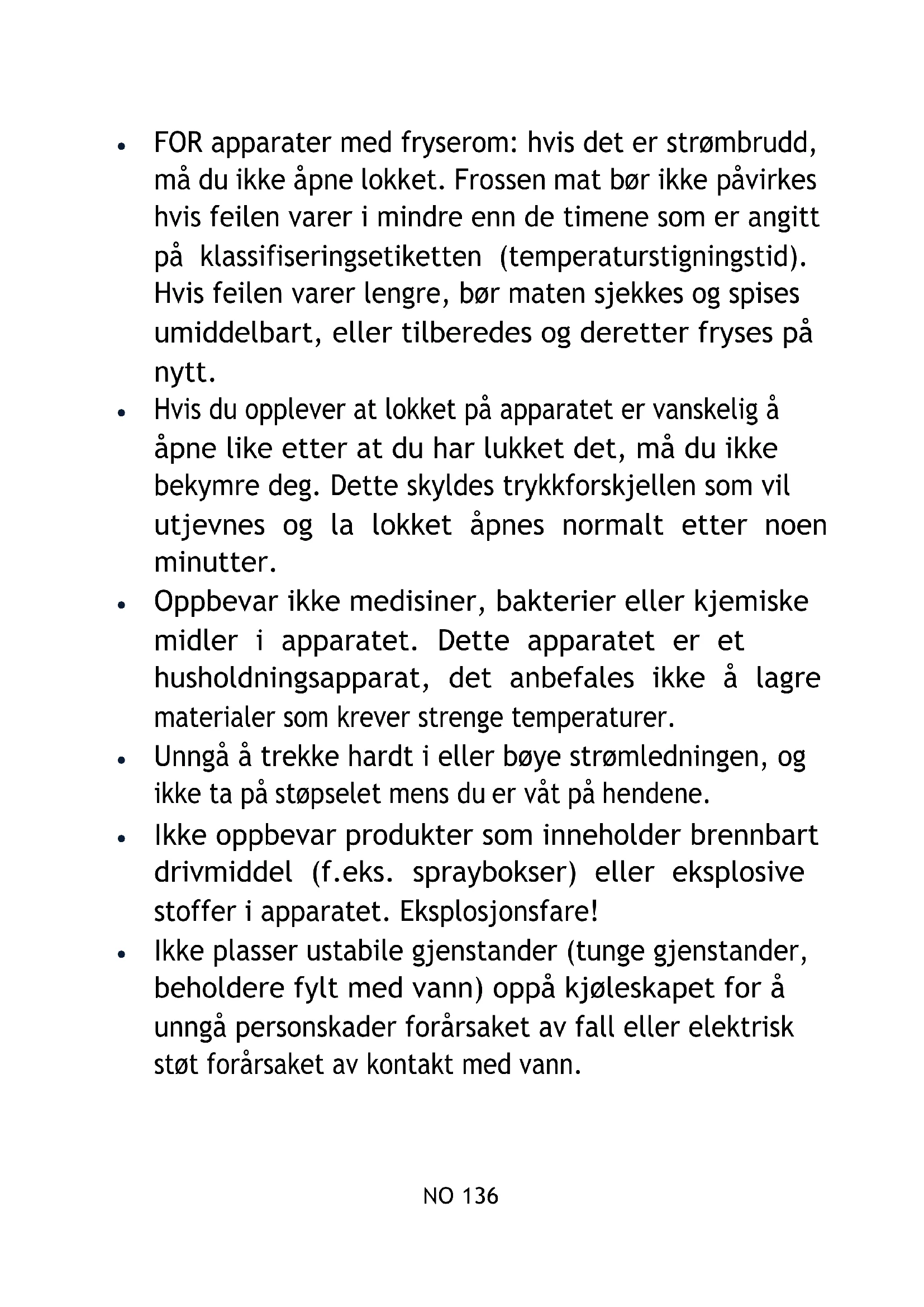FOR apparater med fryserom: oppbevar ikke væsker på flaske eller hermetikk (spesielt kullsyreholdige drikker) i fryserommet. Flasker og bokser kan sprekke!