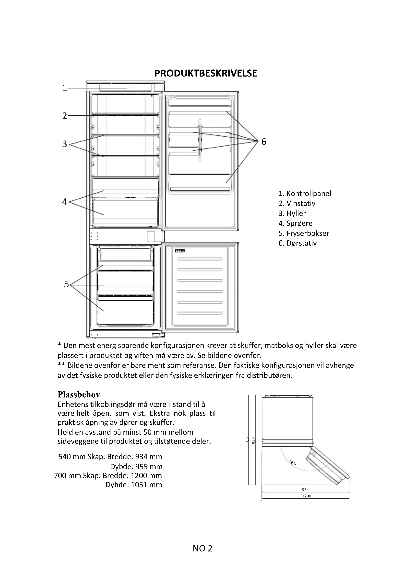 7PRODUKTBESKRIVELSE 1. Kontrollpanel2. Vinstativ3. Hyller4. Sprøere5. Fryserbokser6. Dørstativ* Den mest energisparende konfigurasjonen krever at skuffer, matboks og hyller skal væreplassert i produktet og viften må være av. Se bildene ovenfor.** Bildene ovenfor er bare ment som referanse. Den faktiske konfigurasjonen vil avhengeav det fysiske produktet eller den fysiske erklæringen fra distributøren.Plassbehov Enhetens tilkoblingsdør må være i stand til å være helt åpen, som vist. Ekstra nok plass til praktisk åpning av dører og skuffer. Hold en avstand på minst 50 mm mellom sideveggene til produktet og tilstøtende deler. 540 mm Skap: Bredde: 934 mmDybde: 955 mm700 mm Skap: Bredde: 1200 mmDybde: 1051 mm