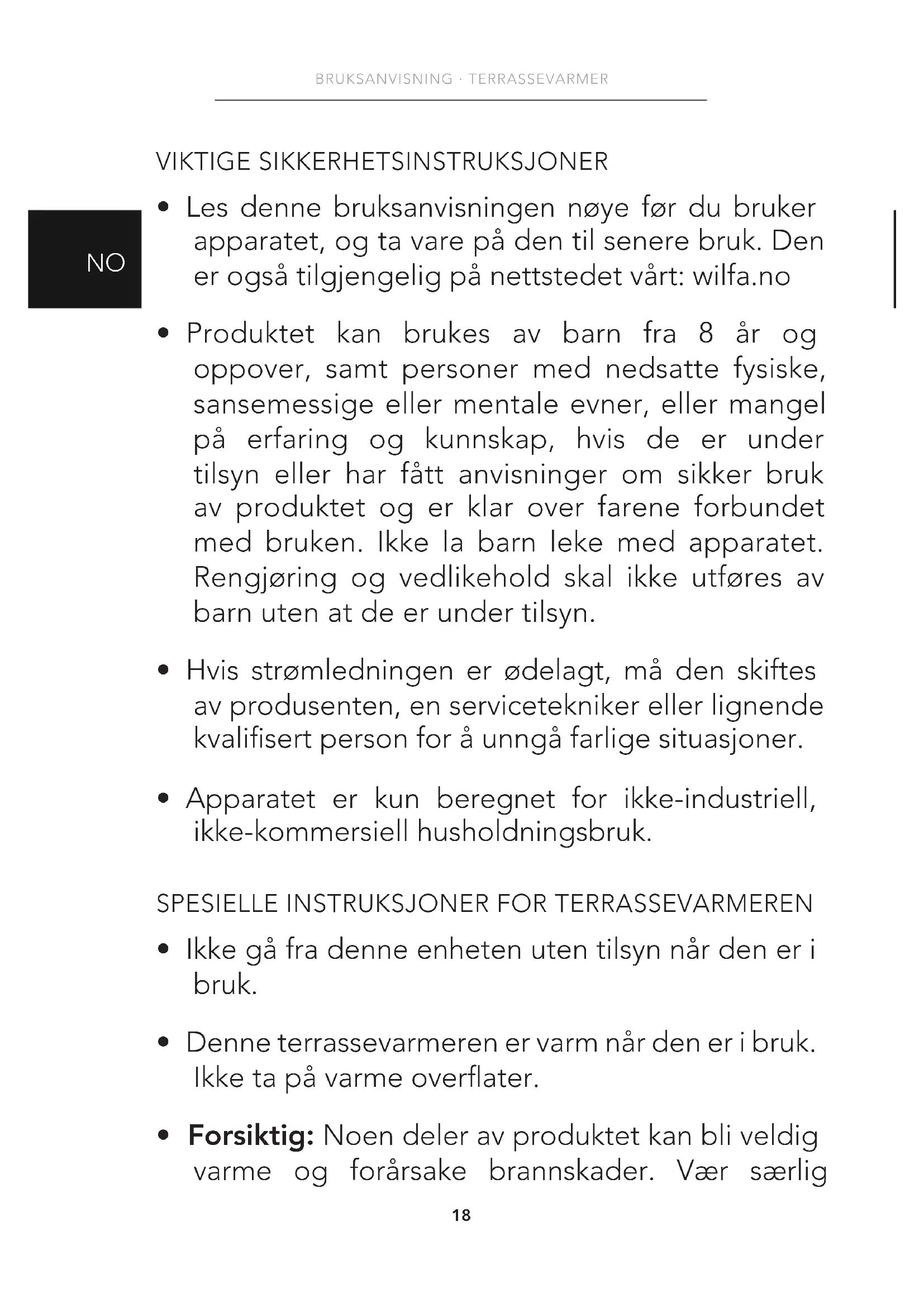 BRUKSANVISNING · TERRASSEVARMER GARANTI Wilfa gir 5 års garanti på dette produktet fra kjøpsdatoen. Garantien dekker produksjonsfeil eller defekter som oppstår i garantiperioden. Kjøpskvitteringen fungerer som bevis overfor forhandleren ved eventuelle garantikrav. Garantien er kun gyldig for produkter som er kjøpt og brukt i privathusholdning. Garantien gjelder ikke hvis produktet brukes kommersielt. Garantien er ikke gyldig hvis produktet misbrukes, ved uaktsom bruk eller hvis du ikke følger instruksjonene fra Wilfa, eller ved uautoriserte modiseringer og reparasjoner. Garantien dekker heller ikke normal bruksslitasje på produktet, misbruk, mangel på vedlikehold, bruk av feil elektrisk spenning eller: