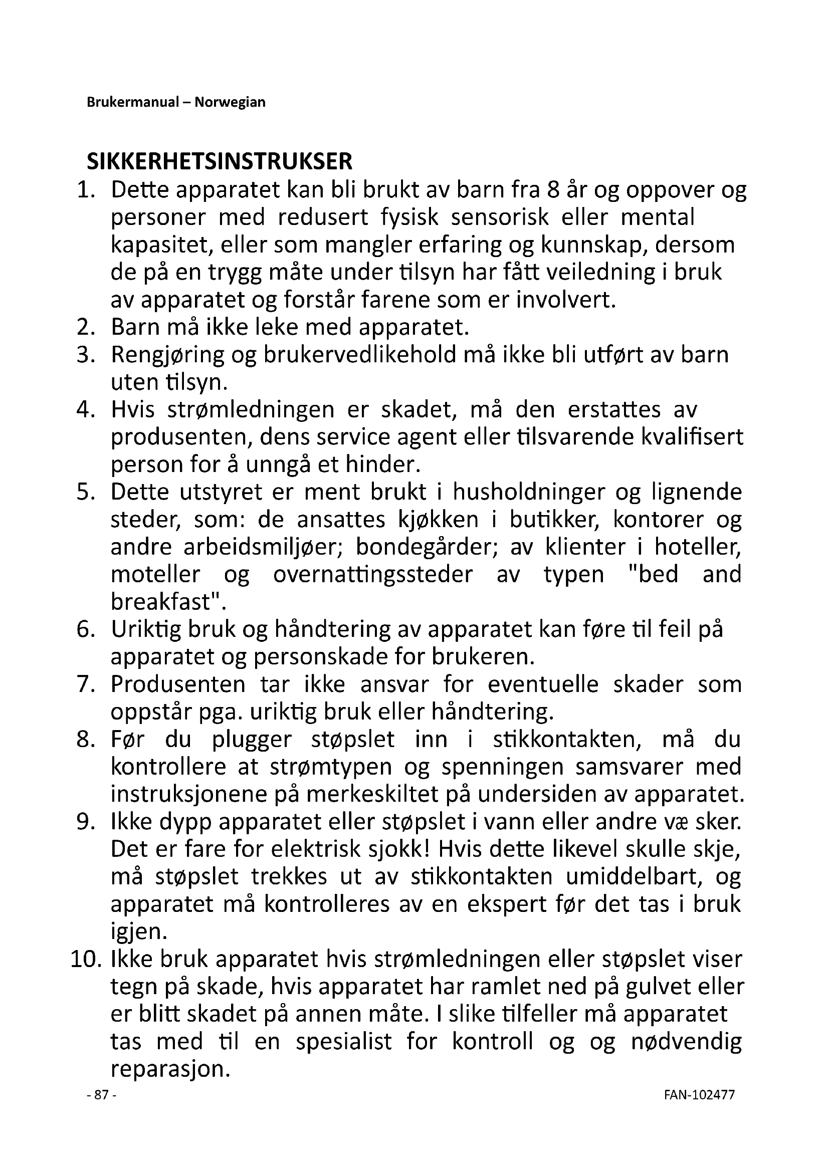 tegn på skade, hvis apparatet har ramlet ned på gulvet eller er blitt skadet på annen måte. I slike tilfeller må apparatet tas med til en spesialist for kontroll og og nødvendig reparasjon.- 88 - FAN-102477