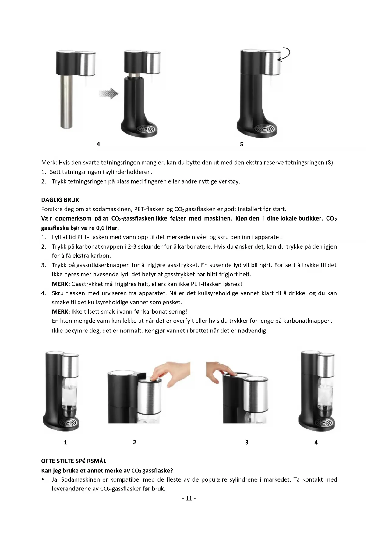 -gassflasker før bruk.- 12 - Kan jeg bruke et annet merke på PET-flasken? Flasken er spesialdesignet for maskinen med hurtigkoblingsdesign som festes enkelt og sikkert hver gang; andre merker passer kanskje ikke. Forsikre deg om at alle ekstra PET-flasker som er kjøpt har samme tilpasning. Hva skal jeg gjøre hvis Sodamaskinen ikke karbonatiserer? Forsikre deg om at apparatet alltid er i loddrett stilling. Kontroller CO