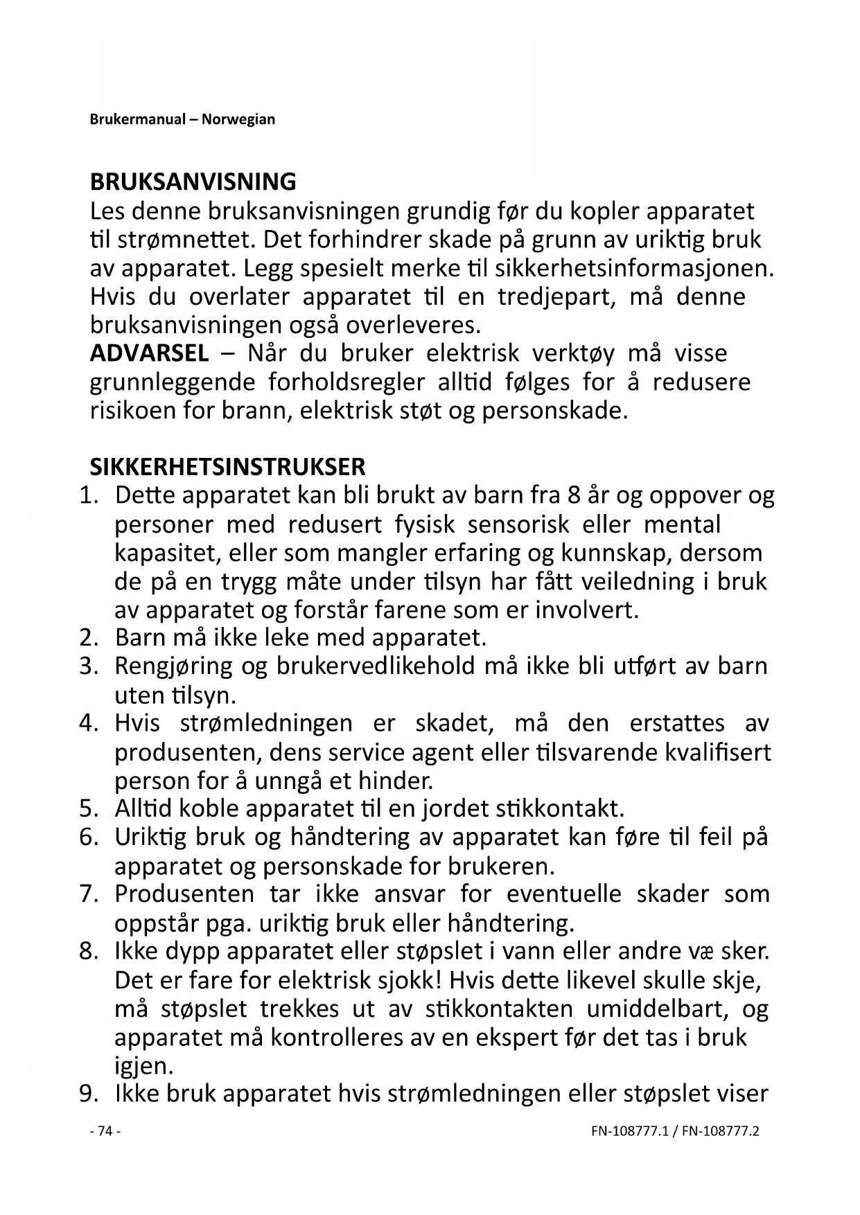 9. Ikke bruk apparatet hvis strømledningen eller støpslet viser- 75 - FN-108777.1 / FN-108777.2