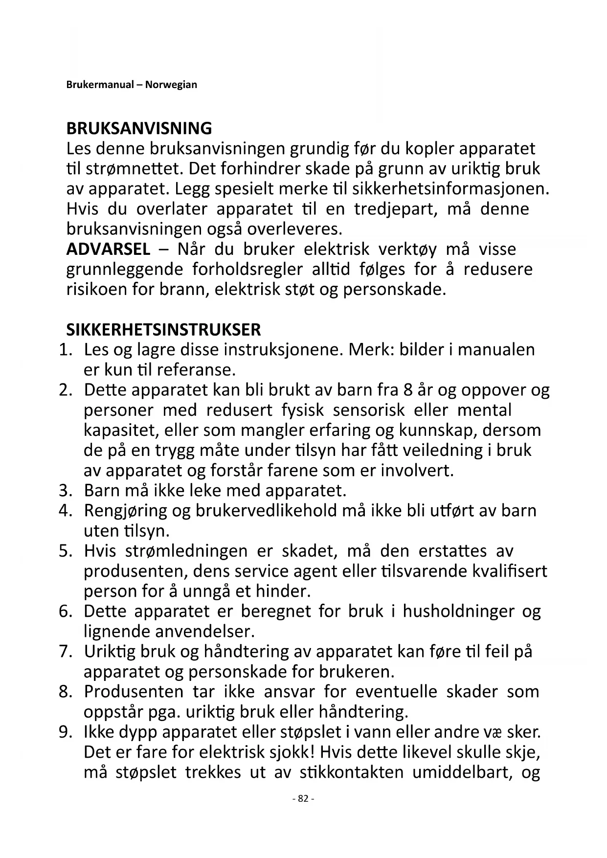 9. Ikke dypp apparatet eller støpslet i vann eller andre væ sker.
