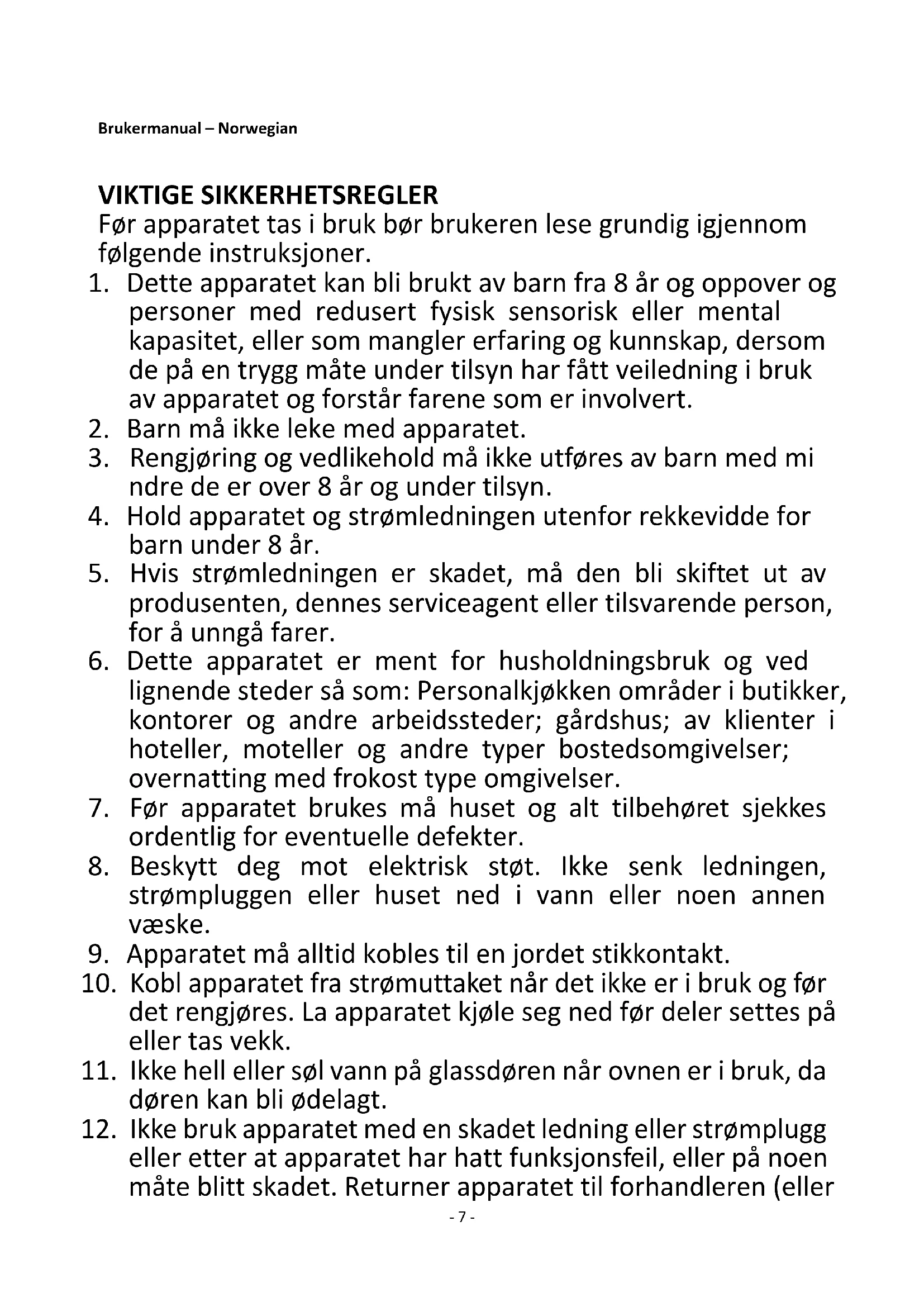 6. Dette apparatet er ment for husholdningsbruk og ved