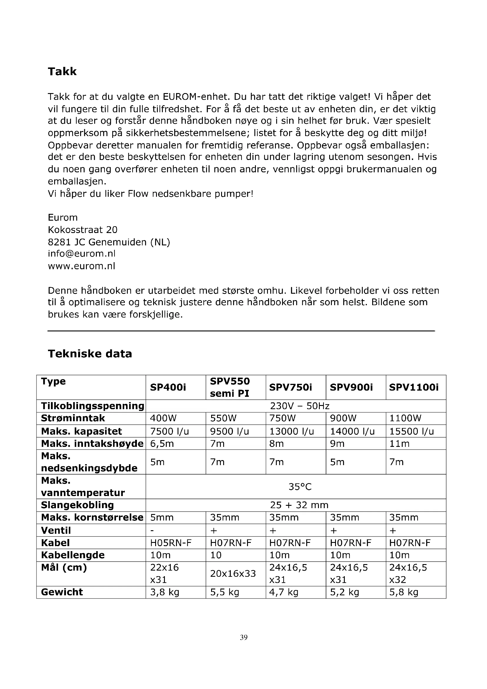 10m 10m 10m Mål (cm) 22x16 x31 20x16x33 24x16,5 x31 24x16,5 x31 24x16,5 x32 Gewicht 3,8 kg 5,5 kg 4,7 kg 5,2 kg 5,8 kg40 Sikkerhetsforskrifter Før du tar den nye pumpen i bruk, må du kontrollere den (inkl. kabel og støpsel) for synlige skader. Ta ikke en skadet pumpe i bruk, og ta kontakt med leverandøren for å få den erstattet. Av sikkerhetsårsaker må den nedsenkbare pumpen alltid være tilkoblet en jordet stikkontakt, som må være installert i tråd med nasjonalt regelverk, på en sikret kurs på maksimalt 16A og med jordfeilbryter (nominell strøm ≤30 mA). Kontroller pumpen, strømkabelen og støpselet før hver gang de brukes. Dersom du konstaterer skade, må du ikke bruke dem, men la de repareres av en autorisert elektriker. Sørg for at elektriske tilkoblinger er og forblir tørre til enhver tid. Rør heller ikke ved dem med våte hender. Kontroller at stikkontakten du ønsker å koble pumpen til er egnet til formålet (se typeskiltet). Beskytt strømkabelen og støpselet mot varme, olje og skarpe kanter. Rengjør utløpsslangen før bruk. Kontroller før bruk at pumpens kapasitet ikke overstiges. Bruk ikke strømkabelen til å henge opp pumpen, for å senke den eller for å flytte den. Om det er nødvendig kan et tau eventuelt festes til håndtaket. Dra heller ikke støpselet ut av stikkontakten etter ledningen, men trekk det ut med hånden! Etter at du har pumpet vann som f.eks. var kloret eller inneholdt sedimenter, må du spyle gjennom pumpen med kaldt vann.. Vær observant på at sand, andre slipemidler og etsende stoffer forårsaker raskere slitasje, og også påvirker pumpens kapasitet. Unngå at pumpen arbeider hvis den av noen årsak ikke kan fjerne vann, f.eks. gjennom tett utløp, for høyt inntak osv. Dette skader pumpen! Bruk ikke pumpen når det befinner seg personer i objektet som skal pumpes tomt. Det er alltid forbudt å bruke denne pumpen i et svømmebasseng. Dersom pumpen løper tørr forårsaker dette raskere slitasje og overoppheting. Unngå derfor alltid at pumpen går mens vann ikke lenger forflyttes, og slå den umiddelbart av når dette skjer. Før du utfører kontroll av eller rengjøring av pumpen må du slå den av gjennom å trekke støpselet ut av stikkontakten. For å unngå personskade må du aldri stikke fingre inn i pumpens innsug mens støpselet står i stikkontakten!41 Sørg for å holde nøye oppsyn når dette apparatet brukes i nærheten av barn, handlingsinkapable personer eller husdyr. Apparatet er ikke egnet for bruk av personer (inkl. barn) med en fysisk, psykisk eller mental begrensning, eller mangel på erfaring og kjennskap, heller ikke under oppsyn eller etter instruks om bruk av apparatet av en person som er ansvarlig for deres sikkerhet. Hold apparatet utenfor barns rekkevidde, og la de aldri være alene med apparatet. Når apparatet skal plasseres må du ha med i betraktningen at det skal være utenfor barns rekkevidde. Sørg for at barn ikke leker med apparatet. Reparer aldri pumpe, strømkabel eller støpsel selv, overlat oppgaven til en kvalifisert fagperson. Importøren og fabrikanten tar ikke ansvar for ukyndig utførte reparasjoner og/eller endringer utført på pumpen. Slike fører også til at garantien ikke lenger gjelder. Hva er pumpen beregnet for? Denne nedsenkbare pumpen er utviklet til privat bruk i og rundt hus og hage. Nedsenkbare pumper bruker først og fremst til å føre bort vann, for flytting av vann, for å pumpe vannreservoirer, kjellere, båter osv. tomme, samt for å sirkulere vann i en begrenset periode. OBS: Denne pumpen kan ikke benyttes i et svømmebasseng! Pumpen er helt vanntett og kan senkes ned til en dybde på maksimum 5 eller 7 meter (se tekniske spesifikasjoner). Den nedsenkbare pumpen er egnet for følgende væsker: Type SPi: rent vann og såpevann Type SPV of SPVi: rent og lettere urent vann og såpevann Pumpen kan ikke brukes til etsende, lettantennelige eller eksplosive væsker (som bensin, diesel, petroleum, løsemidler o.l.), og heller ikke til sjøvann, fett, olje, saltvann, skittent vann fra toaletter o.l. Temperaturen på væsken som skal pumpes må ikke være høyere enn 35°C. Pumpen er ikke egnet for kontinuerlig bruk, som kontinuerlig forflytting av vann. Ved slik bruk vil pumpens levetid bli betydelig redusert.42 Beskrivelse (kan variere noe etter modell)