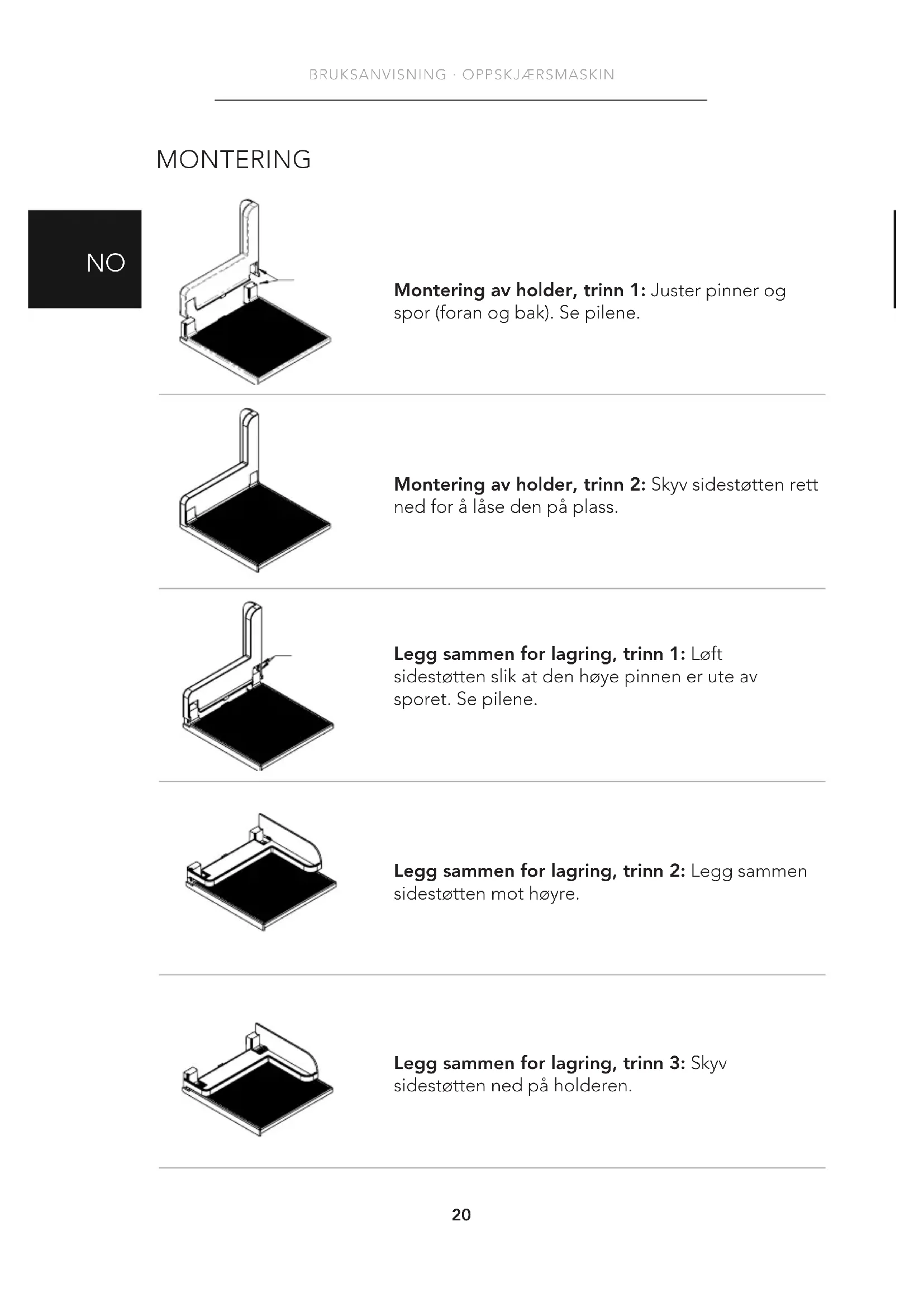 Montering av holder, trinn 1: Juster pinner og spor (foran og bak). Se pilene. Montering av holder, trinn 2: Skyv sidestøtten rett ned for å låse den på plass. Legg sammen for lagring, trinn 1: Løft sidestøtten slik at den høye pinnen er ute av sporet. Se pilene. Legg sammen for lagring, trinn 2: Legg sammen sidestøtten mot høyre. Legg sammen for lagring, trinn 3: Skyv sidestøtten ned på holderen. MONTERING21