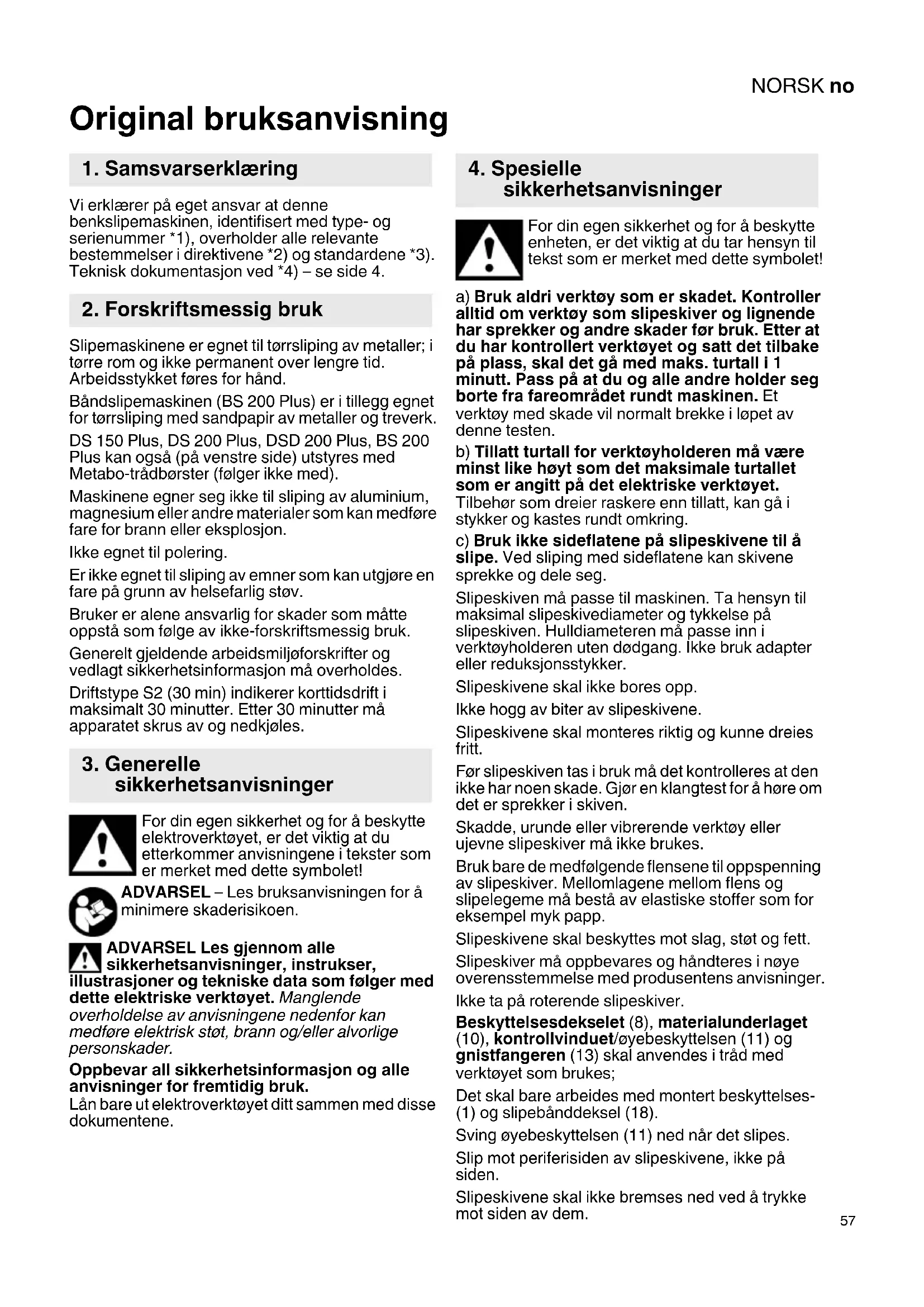 Original bruksanvisning Vi erklærer på eget ansvar at denne benkslipemaskinen, identifisert med type- og serienummer *1), overholder alle relevante bestemmelser i direktivene *2) og standardene *3). Teknisk dokumentasjon ved *4) – se side 4. Slipemaskinene er egnet til tørrsliping av metaller; i tørre rom og ikke permanent over lengre tid. Arbeidsstykket føres for hånd. Båndslipemaskinen (BS 200 Plus) er i tillegg egnet for tørrsliping med sandpapir av metaller og treverk. DS 150 Plus, DS 200 Plus, DSD 200 Plus, BS 200 Plus kan også (på venstre side) utstyres med Metabo-trådbørster (følger ikke med). Maskinene egner seg ikke til sliping av aluminium, magnesium eller andre materialer som kan medføre fare for brann eller eksplosjon. Ikke egnet til polering. Er ikke egnet til sliping av emner som kan utgjøre en fare på grunn av helsefarlig støv. Bruker er alene ansvarlig for skader som måtte oppstå som følge av ikke-forskriftsmessig bruk. Generelt gjeldende arbeidsmiljøforskrifter og vedlagt sikkerhetsinformasjon må overholdes. Driftstype S2 (30 min) indikerer korttidsdrift i maksimalt 30 minutter. Etter 30 minutter må apparatet skrus av og nedkjøles. For din egen sikkerhet og for å beskytte elektroverktøyet, er det viktig at du etterkommer anvisningene i tekster som er merket med dette symbolet! ADVARSEL – Les bruksanvisningen for å minimere skaderisikoen. ADVARSEL Les gjennom alle sikkerhetsanvisninger, instrukser, illustrasjoner og tekniske data som følger med dette elektriske verktøyet. Manglende overholdelse av anvisningene nedenfor kan medføre elektrisk støt, brann og/eller alvorlige personskader. Oppbevar all sikkerhetsinformasjon og alle anvisninger for fremtidig bruk. Lån bare ut elektroverktøyet ditt sammen med disse dokumentene. For din egen sikkerhet og for å beskytte enheten, er det viktig at du tar hensyn til tekst som er merket med dette symbolet! a) Bruk aldri verktøy som er skadet. Kontroller alltid om verktøy som slipeskiver og lignende har sprekker og andre skader før bruk. Etter at du har kontrollert verktøyet og satt det tilbake på plass, skal det gå med maks. turtall i 1 minutt. Pass på at du og alle andre holder seg borte fra fareområdet rundt maskinen. Et verktøy med skade vil normalt brekke i løpet av denne testen. b) Tillatt turtall for verktøyholderen må være minst like høyt som det maksimale turtallet som er angitt på det elektriske verktøyet. Tilbehør som dreier raskere enn tillatt, kan gå i stykker og kastes rundt omkring. c) Bruk ikke sideflatene på slipeskivene til å slipe. Ved sliping med sideflatene kan skivene sprekke og dele seg. Slipeskiven må passe til maskinen. Ta hensyn til maksimal slipeskivediameter og tykkelse på slipeskiven. Hulldiameteren må passe inn i verktøyholderen uten dødgang. Ikke bruk adapter eller reduksjonsstykker. Slipeskivene skal ikke bores opp. Ikke hogg av biter av slipeskivene. Slipeskivene skal monteres riktig og kunne dreies fritt. Før slipeskiven tas i bruk må det kontrolleres at den ikke har noen skade. Gjør en klangtest for å høre om det er sprekker i skiven. Skadde, urunde eller vibrerende verktøy eller ujevne slipeskiver må ikke brukes. Bruk bare de medfølgende flensene til oppspenning av slipeskiver. Mellomlagene mellom flens og slipelegeme må bestå av elastiske stoffer som for eksempel myk papp. Slipeskivene skal beskyttes mot slag, støt og fett. Slipeskiver må oppbevares og håndteres i nøye overensstemmelse med produsentens anvisninger. Ikke ta på roterende slipeskiver. Beskyttelsesdekselet (8), materialunderlaget (10), kontrollvinduet/øyebeskyttelsen (11) og gnistfangeren (13) skal anvendes i tråd med verktøyet som brukes; Det skal bare arbeides med montert beskyttelses- (1) og slipebånddeksel (18). Sving øyebeskyttelsen (11) ned når det slipes. Slip mot periferisiden av slipeskivene, ikke på siden. Slipeskivene skal ikke bremses ned ved å trykke mot siden av dem.