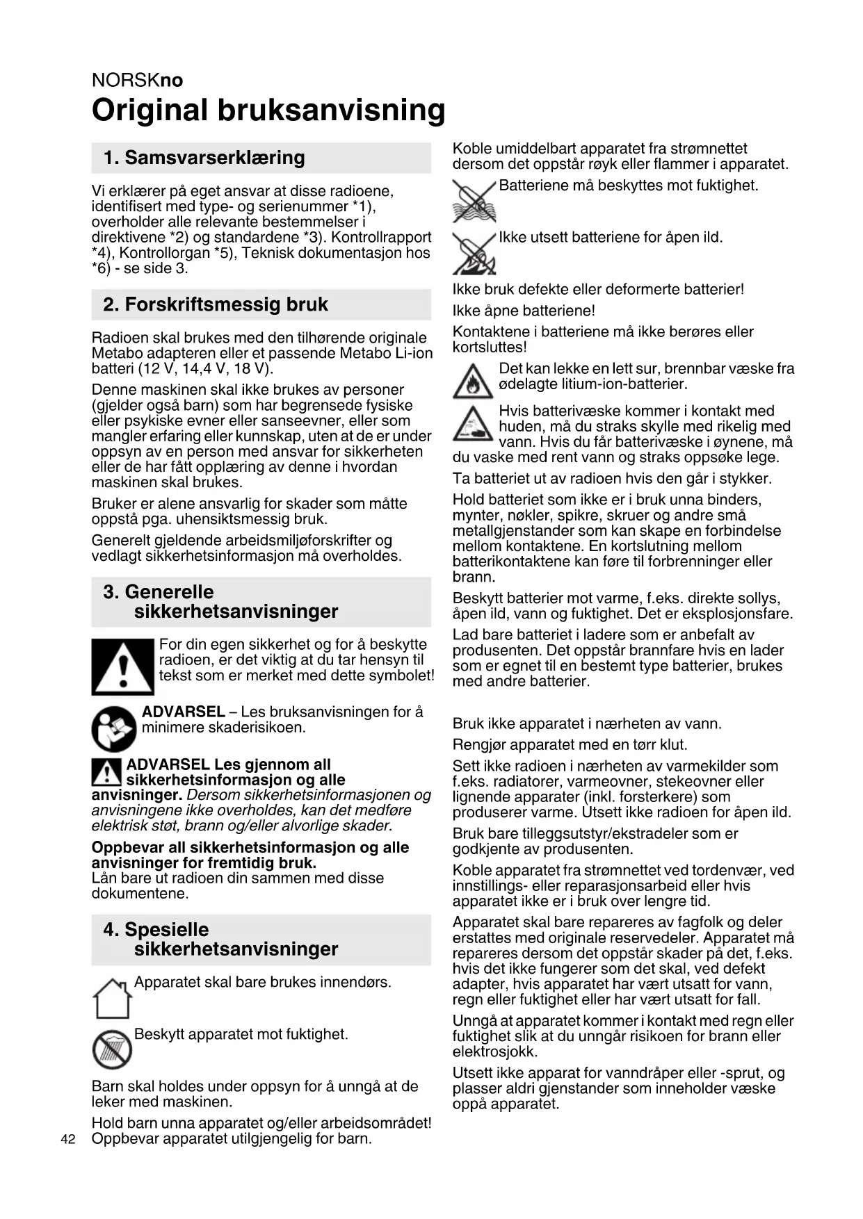 Original bruksanvisning Vi erklærer på eget ansvar at disse radioene, identifisert med type- og serienummer *1), overholder alle relevante bestemmelser i direktivene *2) og standardene *3). Kontrollrapport *4), Kontrollorgan *5), Teknisk dokumentasjon hos *6) - se side 3. Radioen skal brukes med den tilhørende originale Metabo adapteren eller et passende Metabo Li-ion batteri (12 V, 14,4 V, 18 V). Denne maskinen skal ikke brukes av personer (gjelder også barn) som har begrensede fysiske eller psykiske evner eller sanseevner, eller som mangler erfaring eller kunnskap, uten at de er under oppsyn av en person med ansvar for sikkerheten eller de har fått opplæring av denne i hvordan maskinen skal brukes. Bruker er alene ansvarlig for skader som måtte oppstå pga. uhensiktsmessig bruk. Generelt gjeldende arbeidsmiljøforskrifter og vedlagt sikkerhetsinformasjon må overholdes. For din egen sikkerhet og for å beskytte radioen, er det viktig at du tar hensyn til tekst som er merket med dette symbolet! ADVARSEL – Les bruksanvisningen for å minimere skaderisikoen. ADVARSEL Les gjennom all sikkerhetsinformasjon og alle anvisninger. Dersom sikkerhetsinformasjonen og anvisningene ikke overholdes, kan det medføre elektrisk støt, brann og/eller alvorlige skader. Oppbevar all sikkerhetsinformasjon og alle anvisninger for fremtidig bruk. Lån bare ut radioen din sammen med disse dokumentene. Apparatet skal bare brukes innendørs. Beskytt apparatet mot fuktighet. Barn skal holdes under oppsyn for å unngå at de leker med maskinen. Hold barn unna apparatet og/eller arbeidsområdet! Oppbevar apparatet utilgjengelig for barn. Koble umiddelbart apparatet fra strømnettet dersom det oppstår røyk eller flammer i apparatet. Batteriene må beskyttes mot fuktighet. Ikke utsett batteriene for åpen ild. Ikke bruk defekte eller deformerte batterier! Ikke åpne batteriene! Kontaktene i batteriene må ikke berøres eller kortsluttes! Det kan lekke en lett sur, brennbar væske fra ødelagte litium-ion-batterier. Hvis batterivæske kommer i kontakt med huden, må du straks skylle med rikelig med vann. Hvis du får batterivæske i øynene, må du vaske med rent vann og straks oppsøke lege. Ta batteriet ut av radioen hvis den går i stykker. Hold batteriet som ikke er i bruk unna binders, mynter, nøkler, spikre, skruer og andre små metallgjenstander som kan skape en forbindelse mellom kontaktene. En kortslutning mellom batterikontaktene kan føre til forbrenninger eller brann. Beskytt batterier mot varme, f.eks. direkte sollys, åpen ild, vann og fuktighet. Det er eksplosjonsfare. Lad bare batteriet i ladere som er anbefalt av produsenten. Det oppstår brannfare hvis en lader som er egnet til en bestemt type batterier, brukes med andre batterier. Bruk ikke apparatet i nærheten av vann. Rengjør apparatet med en tørr klut. Sett ikke radioen i nærheten av varmekilder som f.eks. radiatorer, varmeovner, stekeovner eller lignende apparater (inkl. forsterkere) som produserer varme. Utsett ikke radioen for åpen ild. Bruk bare tilleggsutstyr/ekstradeler som er godkjente av produsenten. Koble apparatet fra strømnettet ved tordenvær, ved innstillings- eller reparasjonsarbeid eller hvis apparatet ikke er i bruk over lengre tid. Apparatet skal bare repareres av fagfolk og deler erstattes med originale reservedeler. Apparatet må repareres dersom det oppstår skader på det, f.eks. hvis det ikke fungerer som det skal, ved defekt adapter, hvis apparatet har vært utsatt for vann, regn eller fuktighet eller har vært utsatt for fall. Unngå at apparatet kommer i kontakt med regn eller fuktighet slik at du unngår risikoen for brann eller elektrosjokk. Utsett ikke apparat for vanndråper eller -sprut, og plasser aldri gjenstander som inneholder væske oppå apparatet.