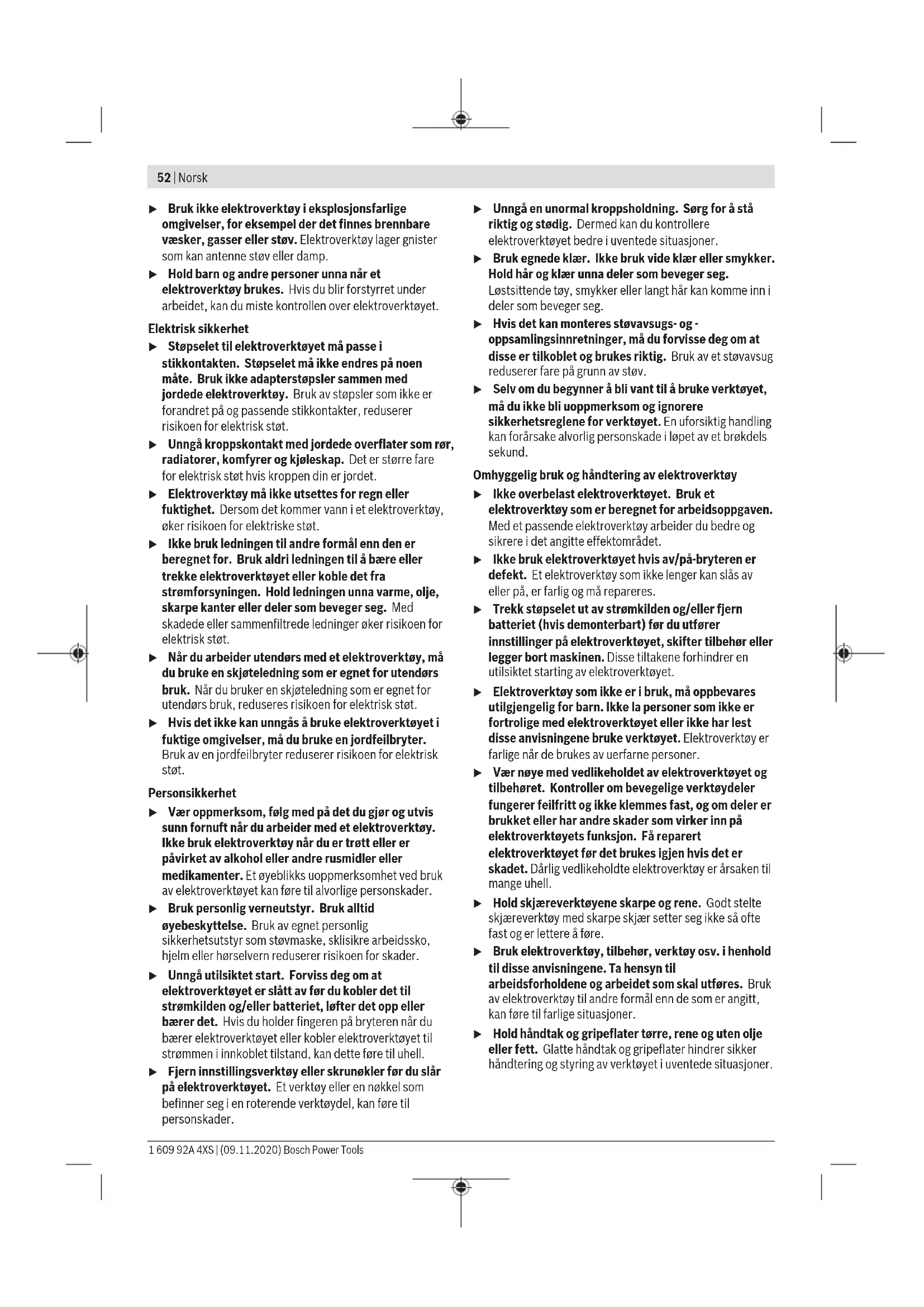 Vibrasjonsnivået og støyemisjonen som er angitt i disse anvisningene er målt i samsvar med en standardisert målemetode og kan brukes til sammenligning av elektroverktøy. Verdiene egner seg også til en foreløpig estimering av vibrasjonsnivået og støyutslippet. Angitt vibrasjonsnivå og støyutslipp representerer de hovedsakelige bruksområdene til elektroverktøyet. Men hvis elektroverktøyet brukes til andre formål, med andre innsatsverktøy eller utilstrekkelig vedlikehold, kan vibrasjonsnivået og støyutslippet avvike fra det som er angitt. Dette kan føre til en betydelig økning av vibrasjonsnivået og støyutslippet for hele arbeidstidsrommet. For en nøyaktig vurdering av vibrasjonsnivået og støyutslippet skal det også tas hensyn til de tidene verktøyet er slått av, eller går, men ikke faktisk er i bruk. Dette kan redusere vibrasjonsnivået og støyutslippet for hele arbeidstidsrommet betraktelig. Bestem ekstra sikkerhetstiltak til beskyttelse av brukeren mot vibrasjonenes virkning, som for eksempel: Vedlikehold av elektroverktøy og innsatsverktøy, holde hendene varme, organisere arbeidsforløpene. Montering u Ta alltid batteriet ut av elektroverktøyet før arbeider på elektroverktøyet utføres (f.eks. vedlikehold, verktøyskifte osv.) og før transport og oppbevaring. Det er fare for skader hvis du trykker på av/på-bryteren ved en feiltagelse. 1 609 92A 4XS | (09.11.2020) Bosch Power ToolsNorsk | 55 Opplading av batteriet u Bruk bare laderne som er oppført i de tekniske spesifikasjonene. Kun disse laderne er tilpasset til Li- ion-batteriet som er brukt i elektroverktøyet. Merk: Batteriet er delvis ladet ved levering. For å sikre full effekt fra batteriet må du lade det helt opp i laderen før første gangs bruk. Litium-ion-batteriet kan lades opp til enhver tid uten at levetiden forkortes. Det skader ikke batteriet å avbryte oppladingen. Li-Ion-batteriet har "Electronic Cell Protection (ECP)" som beskytter mot dyputladning. Når batteriet er utladet, kobles elektroverktøyet ut med en beskyttelseskobling: Innsatsverktøyet beveger seg ikke lenger. u Ikke fortsett å trykke på av/på-bryteren etter automatisk utkobling av elektroverktøyet. Batteriet kan ta skade. Fjerning av batteriet For å ta ut batteriet(6) trykker du på batteriopplåsingsknappen(5) og trekker batteriet bakover og ut av elektroverktøyet. Ikke bruk makt. Verktøyskifte (se bilde A) Hvis av/på-bryteren (8) ikke er trykt inn, låses borespindelen. Dette gir mulighet til rask, behagelig og enkelt skifte av innsatsverktøy i chucken. Åpne hurtigspennchucken (2) ved å dreie i dreieretning ➊ til verktøyet kan settes inn. Sett inn verktøyet. Skru fast hylsen på hurtigspennchucken (2) hardt i dreieretning ➋ for hånd til ingen tilbakegang høres mer. Chucken blir da automatisk låst. Støv-/sponavsuging Støv fra materialer som blyholdig maling, noen tresorter, mineraler og metall kan være helsefarlige. Berøring eller innånding av støv kan utløse allergiske reaksjoner og/eller åndedrettssykdommer hos brukeren eller personer som befinner seg i nærheten. Visse typer støv som eik- eller bøkstøv gjelder som kreftfremkallende, spesielt i kombinasjon med tilsetningsstoffer til trebearbeidelse (kromat, trebeskyttelsesmidler). Asbestholdig materiale må kun bearbeides av fagfolk. – Sørg for god ventilasjon av arbeidsplassen. – Det anbefales å bruke en støvmaske med filterklasse P2. Følg ditt lands gyldige forskrifter for de materialene som skal bearbeides. u Unngå støv på arbeidsplassen. Støv kan lett antennes. Bruk Igangsetting Innsetting av batteriet Merknad: Bruk av batterier som ikke passer til elektroverktøyet kan føre til funksjonsfeil eller skade på elektroverktøyet. Still dreieretningsomkobleren (7) på midten for å hindre utilsiktet innkobling. Sett det ladede batteriet (6) i håndtaket helt det merkes at det festes og ligger helt inntil håndtaket. Stille inn dreieretningen (se bilde B) Med dreieretningsomkobleren (7) kan du endre dreieretningen til elektroverktøyet. Dette er ikke mulig når på/av-bryteren (8) er trykt inn. Høyrerotasjon: For å bore og skru inn skruer trykker du retningsvelgeren (7) mot venstre helt til den stopper. Venstregang: For løsing hhv. utskruing av skruer og muttere trykker du dreieretningsomkobleren (7) mot høyre til den stopper. Inn-/utkobling For å slå på elektroverktøyet trykker du på av/på-bryteren (8) og holder den inne. For å slå av elektroverktøyet slipper du av/på-bryteren (8). Innstilling av turtallet Du kan regulere turtallet til det innkoblede elektroverktøyet trinnløst, avhengig av hvor langt inn du trykker av/på- bryteren (8). Et lett trykk på av/på-bryteren (8) gir lavt turtall. Turtallet stiger med økende trykk. Forhåndsinnstilling av dreiemoment Med innstillingsringen for dreiemoment(3) kan du velge mellom 20 dreiemomenttrinn og "MAX". Når innstilt dreiemoment er nådd, stopper innsatsverktøyet. Bruk trinnet "MAX" ved boring. Mekanisk girvalg u Du kan betjene girvelgeren (4) både når elektroverktøyet er stoppet og når det går. Du bør imidlertid ikke gjøre det ved full belastning eller maksimalt turtall.