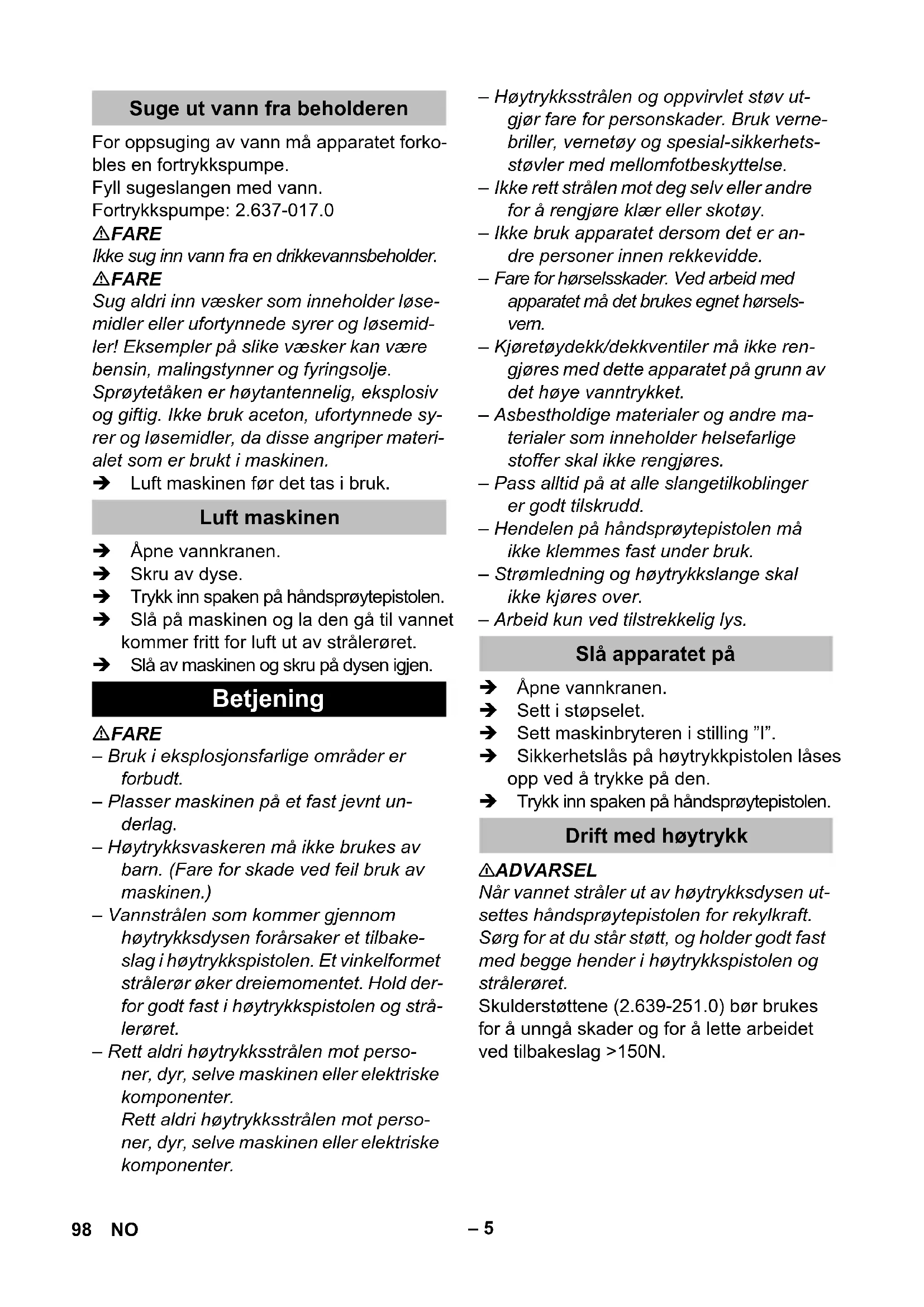 : <100 mg/l Steng vanntilførselen. Skru av filterhus. Trekk ut filteret og rengjør det. Luft apparatet. Merknad: Apparatet leveres med et 80 µm-filter. Når rotordysen benyttes, bør det brukes et 50 µm-filter (6.414-063.0). Strømforsyning 60 Hz variant Vanntilkobling Grenseverdier for vannforsyning Rengjør filtrene 97NO– 5 For oppsuging av vann må apparatet forko- bles en fortrykkspumpe. Fyll sugeslangen med vann. Fortrykkspumpe: 2.637-017.0 FARE Ikke sug inn vann fra en drikkevannsbeholder. FARE Sug aldri inn væsker som inneholder løse- midler eller ufortynnede syrer og løsemid- ler! Eksempler på slike væsker kan være bensin, malingstynner og fyringsolje. Sprøytetåken er høytantennelig, eksplosiv og giftig. Ikke bruk aceton, ufortynnede sy- rer og løsemidler, da disse angriper materi- alet som er brukt i maskinen. Luft maskinen før det tas i bruk. Åpne vannkranen. Skru av dyse. Trykk inn spaken på håndsprøytepistolen. Slå på maskinen og la den gå til vannet kommer fritt for luft ut av strålerøret. Slå av maskinen og skru på dysen igjen. FARE – Bruk i eksplosjonsfarlige områder er forbudt. – Plasser maskinen på et fast jevnt un- derlag. – Høytrykksvaskeren må ikke brukes av barn. (Fare for skade ved feil bruk av maskinen.) – Vannstrålen som kommer gjennom høytrykksdysen forårsaker et tilbake- slag i høytrykkspistolen. Et vinkelformet strålerør øker dreiemomentet. Hold der- for godt fast i høytrykkspistolen og strå- lerøret. – Rett aldri høytrykksstrålen mot perso- ner, dyr, selve maskinen eller elektriske komponenter. Rett aldri høytrykksstrålen mot perso- ner, dyr, selve maskinen eller elektriske komponenter. – Høytrykksstrålen og oppvirvlet støv ut- gjør fare for personskader. Bruk verne- briller, vernetøy og spesial-sikkerhets- støvler med mellomfotbeskyttelse. – Ikke rett strålen mot deg selv eller andre for å rengjøre klær eller skotøy. – Ikke bruk apparatet dersom det er an- dre personer innen rekkevidde. – Fare for hørselsskader. Ved arbeid med apparatet må det brukes egnet hørsels- vern. – Kjøretøydekk/dekkventiler må ikke ren- gjøres med dette apparatet på grunn av det høye vanntrykket. – Asbestholdige materialer og andre ma- terialer som inneholder helsefarlige stoffer skal ikke rengjøres. – Pass alltid på at alle slangetilkoblinger er godt tilskrudd. – Hendelen på håndsprøytepistolen må ikke klemmes fast under bruk. – Strømledning og høytrykkslange skal ikke kjøres over. – Arbeid kun ved tilstrekkelig lys. Åpne vannkranen. Sett i støpselet. Sett maskinbryteren i stilling ”I”. Sikkerhetslås på høytrykkpistolen låses opp ved å trykke på den. Trykk inn spaken på håndsprøytepistolen. 몇 ADVARSEL Når vannet stråler ut av høytrykksdysen ut- settes håndsprøytepistolen for rekylkraft. Sørg for at du står støtt, og holder godt fast med begge hender i høytrykkspistolen og strålerøret. Skulderstøttene (2.639-251.0) bør brukes for å unngå skader og for å lette arbeidet ved tilbakeslag >150N. Suge ut vann fra beholderen Luft maskinen Betjening Slå apparatet på Drift med høytrykk 98 NO– 6 Maskinen er utstyrt med følgende dyse: – Powerdyse, 15° strålevinkel Høytrykk-flatstråle (15°) for rengjøring av store flater. Avles arbeidstrykket på manometeret. Merknad: Til å begynne med må høytrykksstrålen rettes mot rengjøringsobjektet fra større avstand, for å unngå skader pga. for høyt trykk. Slipp avtrekkeren på sprøytepistolen. Sikre spaken på håndsprøytepistolen med sikringslåsen. Høytrykkspistolen inkl. strålerør settes i strålerørholderen. Arbeidstrykket kan endres ved å bruke uli- ke høytrykksdyser. Velg dyse fra tabellen ovenfor. Skru overfalsmutteren av strålerøret. Skift dyse. Skru på festemutrene og trekk dem til. Merknad: Ved denne trykkjusteringsmetoden står all- tid full matemengde på 1800 l/t til disposi- sjon. Slipp avtrekkeren på sprøytepistolen. Sett maskinbryteren i stilling ”0”. Steng vanntilførselen. Trykk på sprøytepistolen til apparatet er trykkløst. Sikre spaken på håndsprøytepistolen med sikringslåsen. Skru vanntilførselslangen av apparatet. Trekk ut nettstøpselet. Lagre strømkabel, høytrykkslange og tilbehør med maskinen. 몇 ADVARSEL Fare for skader! Dersom vann fryser i maskinen, kan dette føre til at deler i maskinen skades. Om vinteren må maskinen oppbevares frostfritt, ellers må den tømmes fullstendig. Ved lengere pauser i arbeidet vil vi anbefale at det pumpes et frostbeskyttel- sesmiddel gjennom maskinen. Skru av vanntilførselslange og høy- trykkslange. Blås den ut med trykkluft. Merknad: Følg bruksanvisning for frostvæsken. Pump vanlig frostvæske gjennom appa- ratet. Dermed oppnås en viss korrosjonsbeskyt- telse. 몇 FORSIKTIG Fare for personskade og materiell skade! Pass på vekten av apparatet ved transport. Trekk betjeningshendelen for parke- ringsbremsen bakover. Trykk betjeningshendelen for parke- ringsbremsen forover. Powerdyse Opphold i arbeidet Endre arbeidstrykket Trykk MPa (bar) Dyse- størrelse Bestillingsnum- mer Flatstråledyse 50 (500) 15060 5.765-263.0 35 (350) 15075 2.113-073.0 25 (250) 15095 2.113-075.0 15 (150) 15120 2.113-077.0 Punktstråledyse 50 (500) 060 5.765-264.0 35 (350) 075 2.113-074.0 25 (250) 095 2.113-076.0 15 (150) 120 2.113-078.0 Etter bruk Frostbeskyttelse Tapp ut vannet Spyl frostvæske gjennom apparatet. Transport Kjøring Parkere 99NO– 7 Fest løfteinnretning midt på streberen for kranløfting. FARE Fare for skader på grunn av maskin som faller ned. – Lokale forskrifter for ulykkesforebyg- ging og sikkerhetsanvisningene skal følges. – Før hver krantransport må man kontrol- lere innretning for kranlasting for ska- der. – Før hver transport med kran skal løfte- utstyret kontrolleres for skader. – Løft apparatet kun ved hjelp av denne innretningen for kranlasting. – Det må ikke brukes anslagskjeden. – 
