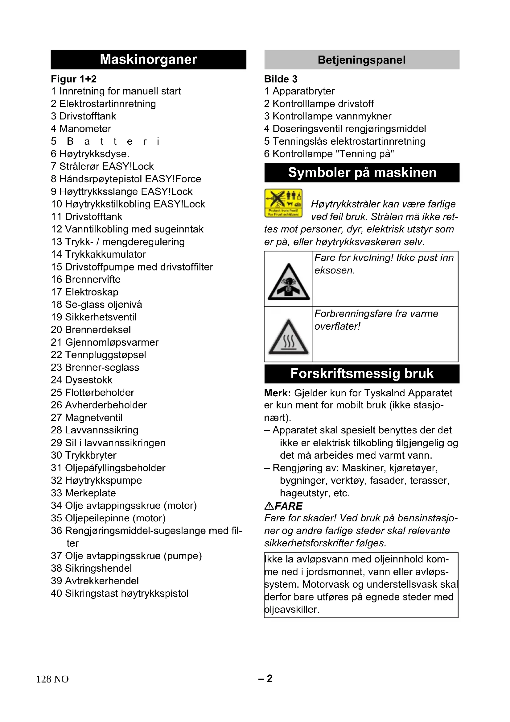 127NO– 2 Figur 1+2 1 Innretning for manuell start 2 Elektrostartinnretning 3 Drivstofftank 4 Manometer 5Batteri 6 Høytrykksdyse. 7 Strålerør EASY!Lock 8 Håndsrpøytepistol EASY!Force 9 Høyttrykksslange EASY!Lock 10 Høytrykkstilkobling EASY!Lock 11 Drivstofftank 12 Vanntilkobling med sugeinntak 13 Trykk- / mengderegulering 14 Trykkakkumulator 15 Drivstoffpumpe med drivstoffilter 16 Brennervifte 17 Elektroskap 18 Se-glass oljenivå 19 Sikkerhetsventil 20 Brennerdeksel 21 Gjennomløpsvarmer 22 Tennpluggstøpsel 23 Brenner-seglass 24 Dysestokk 25 Flottørbeholder 26 Avherderbeholder 27 Magnetventil 28 Lavvannssikring 29 Sil i lavvannssikringen 30 Trykkbryter 31 Oljepåfyllingsbeholder 32 Høytrykkspumpe 33 Merkeplate 34 Olje avtappingsskrue (motor) 35 Oljepeilepinne (motor) 36 Rengjøringsmiddel-sugeslange med fil- ter 37 Olje avtappingsskrue (pumpe) 38 Sikringshendel 39 Avtrekkerhendel 40 Sikringstast høytrykkspistol Bilde 3 1 Apparatbryter 2 Kontrolllampe drivstoff 3 Kontrollampe vannmykner 4 Doseringsventil rengjøringsmiddel 5 Tenningslås elektrostartinnretning 6 Kontrollampe "Tenning på" Høytrykkstråler kan være farlige ved feil bruk. Strålen må ikke ret- tes mot personer, dyr, elektrisk utstyr som er på, eller høytrykksvaskeren selv. Merk: Gjelder kun for Tyskalnd Apparatet er kun ment for mobilt bruk (ikke stasjo- nært). – Apparatet skal spesielt benyttes der det ikke er elektrisk tilkobling tilgjengelig og det må arbeides med varmt vann. – Rengjøring av: Maskiner, kjøretøyer, bygninger, verktøy, fasader, terasser, hageutstyr, etc. FARE Fare for skader! Ved bruk på bensinstasjo- ner og andre farlige steder skal relevante sikkerhetsforskrifter følges. Maskinorganer Betjeningspanel Symboler på maskinen Fare for kvelning! Ikke pust inn eksosen. Forbrenningsfare fra varme overflater! Forskriftsmessig bruk Ikke la avløpsvann med oljeinnhold kom- me ned i jordsmonnet, vann eller avløps- system. Motorvask og understellsvask skal derfor bare utføres på egnede steder med oljeavskiller. 128 NO– 3 Krav til vannkvalitet: OBS Som høytrykksmedium skal det bare bru- kes rent vann. Smuss fører til slitasje før ti- den eller avleiringer på apparatet og på til- behøret. Hvis det brukes resirkulert vann, må følgen- de grenseverdier ikke overskrides. FARE – Høytrykksvaskeren må ikke settes i gang der det er sølt drivstoff. Flytt appa- ratet til et annet sted og unngå gnist- dannelser. – Drivstoff må ikke oppbevares, søles el- ler brukes i nærheten av åpen ild eller ovner, varmekjeler, varmtvannsvarme- re etc., som har åpen flamme eller som kan danne gnister. – Lettantennelige gjenstander og materi- aler må holdes på god avstand fra mas- kinens eksosanlegg (minst 2 m). – Motoren må ikke brukes uten eksosan- legg, og dette må regelmessig kontrol- leres, rengjøres og ved behov skiftes. – Motoren må ikke tas i bruk i skog, bus- kas eller gressbevokste områder, uten at eksosanlegget er utstyrt med gnist- fanger. – Unntatt ved justeringsarbeider, må mo- toren ikke startes med demontert luftfil- ter eller uten deksel over innsugings- stussen. – Det må ikke foretas justeringer på regu- leringsfjærer, reguleringsstag eller an- dre komponenter, som kan bevirke et høyere motorturtall. – Fare for brannskader! Kom aldri i berø- ring med eksosanlegg, sylinder eller kjøleribber. – Stikk aldri hender og føtter inn mellom bevegelige deler. – Forgiftningsfare! Må aldri brukes i luk- kede rom. – Følg gjeldende lovpålagte nasjonale forskrifter for væskestrålemaskiner. – Følg gjeldende lovpålagte nasjonale forskrifter om ulykkesforhindring. Væs- kestrålemaskinen må kontrolleres re- gelmessig og resultatene av kontrollen skal protokollføres. – Varmeinnretningen på maskinen er et fyringsanlegg. Fyringsanlegg må kon- trolleres regelmessig i ehnhold til de gjeldende nasjonale forskriftene. – Det må ikke gjøres endringer på appa- ratet/tilbehøret. FARE Fare for personskade! – Bruk bare originale høytrykksslanger. – Høyttrukksslangen og spruteinnretnin- gen må være egnet for et maksimalt driftstrykk som angitt i Tekniske data. – Unngå kontakt med kjemikalier. – Kontroller høytrykksslangen daglig. Knekte slanger må ikke brukes lenger. Dersom høytrykksslangens ytre trådlag er synlig, må den ikke brukes mer. pH-verdi 6,5...9,5 elektrisk ledningsevne * Ledningsevne ferskvann +1200 µS/cm utfellingsbare stoffer ** < 0,5 mg/l avfiltrerbare stoffer *** < 50 mg/l Hydrokarbonater < 20 mg/l Klorid < 300 mg/l Sulfat < 240 mg/l Kalsium < 200 mg/l Total hardhet < 28 °dH < 50 °TH < 500 ppm (mg CaCO