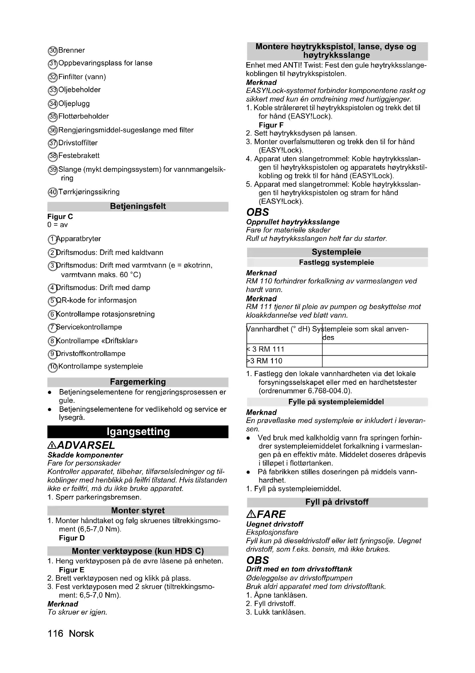 - HDS 9/17-4 CXA114 Norsk Indhold Generelle merknader Les denne oversettelsen av den origina- le driftsveiledningen før apparatet tas i bruk første gang, og følg de vedlagte sikkerhetsanvisningene. Følg anvisningene. Oppbevar begge heftene til senere bruk eller for annen eier. ● Det kan oppstå skader på apparatet og fare for bru- keren og andre personer dersom den originale driftsveiledningen og sikkerhetsanvisningene ikke tas til følge. ● Informer forhandleren umiddelbart ved ev. trans- portskader. ● Kontroller at det ikke mangler noe tilbehør, og at inn- holdet i pakken er uskadet når du pakker ut. Leve- ringsomfang se figur A. ● Fra og med en driftshøyde på 800 m over NN (nor- malnull) må du kontakte forhandleren for å tilpasse brennerreguleringen til høyden og den reduserte surstoffmengden. Sikkerhetsanvisninger For apparatet gjelder følgende sikkerhetshenvisninger: ● Følg de relevante nasjonale forskrifter fra lovgiver for spylemaskiner. ● Følg de relevante nasjonale forskrifter fra lovgiver om forebygging av ulykker. Spylemaskiner må kon- trolleres regelmessig og resultatet av kontrollene må registreres skriftlig. ● Vær oppmerksom på at apparatets varmeinnretning er et fyringsanlegg. Fyringsanlegg må kontrolleres regelmessig i henhold til relevante nasjonale juridis- ke forskrifter. ● I henhold til gjeldende nasjonale bestemmelser må dette apparatet ved kommersiell bruk settes i drift av en kompetent person den første gangen. KÄR- CHER har allerede gjennomført denne første igang- settingen for deg og dokumentert den. Dokumentasjonen om dette kan du få ved fore- spørsel fra din KÄRCHER-partner. Ha dele- og fa- brikknummeret til apparatet klart ved forespørsel om dokumentasjon. ● Vi henviser til at apparatet med jevne mellomrom må kontrolleres av en autorisert person i henhold til de gjeldende nasjonale bestemmelsene. Ta i den forbindelse kontakt med din KÄRCHER-partner. ● Det er ikke tillatt å foreta endringer på apparatet og på tilbehøret. Symboler på apparatet Sikkerhetsinnretninger Sikkerhetsinnretningene skal beskytte brukeren og må ikke overstyres eller forbikobles. Overløpsventil med to trykkbrytere ● Når vannmengden reduseres ved pumpehodet eller med trykk-/volumreguleringen på høytrykkspistolen, åpnes overløpsventilen, og noe av vannet strømmer tilbake til pumpeinnsugingssiden. ● Hvis høytrykkspistolen lukkes, slik at alt vannet strømmer tilbake til pumpeinnsugingssiden, slås pumpen av med trykkbryteren på overløpsventilen. ● Hvis høytrykkspistolen åpnes igjen, slår trykkbryte- ren på sylindertoppen pumpen på igjen. ● Overløpsventilen er stilt inn og plombert fra fabrik- ken. Innstillingen må kun utføres av kundeservice. Sikkerhetsventil ● Sikkerhetsventilen åpnes hvis overløpsventilen eller trykkbryteren er defekt. ● Sikkerhetsventilen stilles inn og plomberes på fa- brikken. Den skal kun stilles inn av kundeservice. Tørrkjøringssikring Tørrkjøringssikringen forhindrer at brenneren kobles inn ved vannmangel. Generelle merknader p. 114