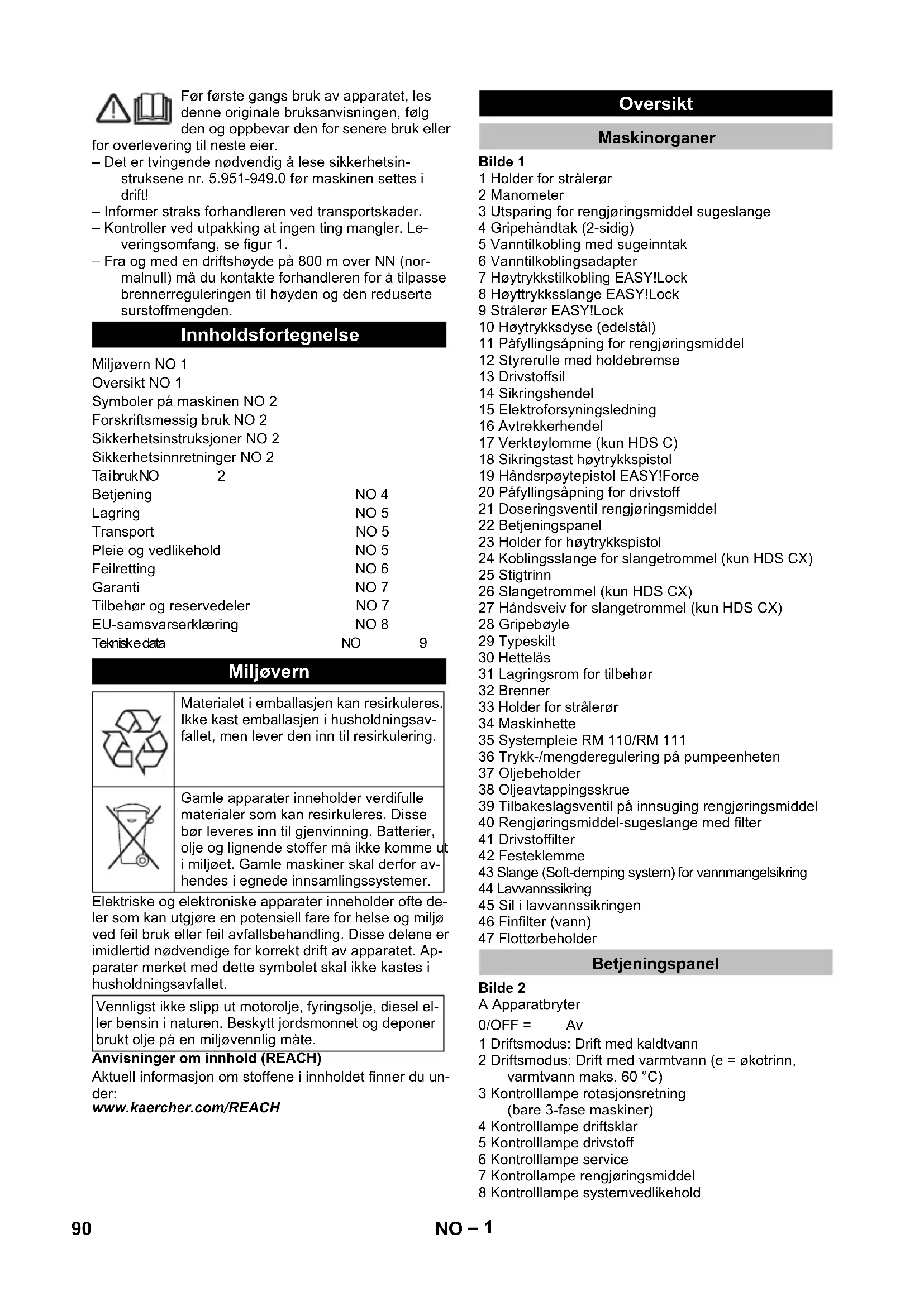 Typisk driftsvægt C kg 118,1 118,1 121,1 Typisk driftsvægt, CX kg 121 121 124 Brændstoftank l 15,5 15,5 15,5 Rensemiddeltank l 15,5 15,5 15,5 89DA– 1 Før første gangs bruk av apparatet, les denne originale bruksanvisningen, følg den og oppbevar den for senere bruk eller for overlevering til neste eier. – Det er tvingende nødvendig å lese sikkerhetsin- struksene nr. 5.951-949.0 før maskinen settes i drift! – Informer straks forhandleren ved transportskader. – Kontroller ved utpakking at ingen ting mangler. Le- veringsomfang, se figur 1. – Fra og med en driftshøyde på 800 m over NN (nor- malnull) må du kontakte forhandleren for å tilpasse brennerreguleringen til høyden og den reduserte surstoffmengden. Elektriske og elektroniske apparater inneholder ofte de- ler som kan utgjøre en potensiell fare for helse og miljø ved feil bruk eller feil avfallsbehandling. Disse delene er imidlertid nødvendige for korrekt drift av apparatet. Ap- parater merket med dette symbolet skal ikke kastes i husholdningsavfallet. Anvisninger om innhold (REACH) Aktuell informasjon om stoffene i innholdet finner du un- der: www.kaercher.com/REACH Bilde 1 1 Holder for strålerør 2 Manometer 3 Utsparing for rengjøringsmiddel sugeslange 4 Gripehåndtak (2-sidig) 5 Vanntilkobling med sugeinntak 6 Vanntilkoblingsadapter 7 Høytrykkstilkobling EASY!Lock 8 Høyttrykksslange EASY!Lock 9 Strålerør EASY!Lock 10 Høytrykksdyse (edelstål) 11 Påfyllingsåpning for rengjøringsmiddel 12 Styrerulle med holdebremse 13 Drivstoffsil 14 Sikringshendel 15 Elektroforsyningsledning 16 Avtrekkerhendel 17 Verktøylomme (kun HDS C) 18 Sikringstast høytrykkspistol 19 Håndsrpøytepistol EASY!Force 20 Påfyllingsåpning for drivstoff 21 Doseringsventil rengjøringsmiddel 22 Betjeningspanel 23 Holder for høytrykkspistol 24 Koblingsslange for slangetrommel (kun HDS CX) 25 Stigtrinn 26 Slangetrommel (kun HDS CX) 27 Håndsveiv for slangetrommel (kun HDS CX) 28 Gripebøyle 29 Typeskilt 30 Hettelås 31 Lagringsrom for tilbehør 32 Brenner 33 Holder for strålerør 34 Maskinhette 35 Systempleie RM 110/RM 111 36 Trykk-/mengderegulering på pumpeenheten 37 Oljebeholder 38 Oljeavtappingsskrue 39 Tilbakeslagsventil på innsuging rengjøringsmiddel 40 Rengjøringsmiddel-sugeslange med filter 41 Drivstoffilter 42 Festeklemme 43 Slange (Soft-demping system) for vannmangelsikring 44 Lavvannssikring 45 Sil i lavvannssikringen 46 Finfilter (vann) 47 Flottørbeholder Bilde 2 A Apparatbryter 1 Driftsmodus: Drift med kaldtvann 2 Driftsmodus: Drift med varmtvann (e = økotrinn, varmtvann maks. 60 °C) 3 Kontrolllampe rotasjonsretning (bare 3-fase maskiner) 4 Kontrolllampe driftsklar 5 Kontrolllampe drivstoff 6 Kontrolllampe service 7 Kontrollampe rengjøringsmiddel 8 Kontrolllampe systemvedlikehold Innholdsfortegnelse Miljøvern NO 1 Oversikt NO 1 Symboler på maskinen NO 2 Forskriftsmessig bruk NO 2 Sikkerhetsinstruksjoner NO 2 Sikkerhetsinnretninger NO 2 Ta i bruk NO 2 Betjening NO 4 Lagring NO 5 Transport NO 5 Pleie og vedlikehold NO 5 Feilretting NO 6 Garanti NO 7 Tilbehør og reservedeler NO 7 EU-samsvarserklæring NO 8 Tekniske data NO 9 Miljøvern Materialet i emballasjen kan resirkuleres. Ikke kast emballasjen i husholdningsav- fallet, men lever den inn til resirkulering. Gamle apparater inneholder verdifulle materialer som kan resirkuleres. Disse bør leveres inn til gjenvinning. Batterier, olje og lignende stoffer må ikke komme ut i miljøet. Gamle maskiner skal derfor av- hendes i egnede innsamlingssystemer. Vennligst ikke slipp ut motorolje, fyringsolje, diesel el- ler bensin i naturen. Beskytt jordsmonnet og deponer brukt olje på en miljøvennlig måte. Oversikt Maskinorganer Betjeningspanel 0/OFF = Av 90 NO– 2 – Betjeningselementer for rengjøringsprosessen er gule. – Betjeningselementer for vedlikehold og service er lysegråe. Høytrykkstråler kan være farlige ved feil bruk. Strålen må ikke rettes mot personer, dyr, elektrisk utstyr som er på, eller høy- trykksvaskeren selv. Rengjøring av: Maskiner, kjøretøyer, bygninger, verk- tøy, fasader, terasser, hageutstyr, etc. FARE Fare for skader! Ved bruk på bensinstasjoner og andre farlige steder skal relevante sikkerhetsforskrifter følges. Krav til vannkvalitet: OBS Som høytrykksmedium skal det bare brukes rent vann. Smuss fører til slitasje før tiden eller avleiringer på ap- paratet og på tilbehøret. Hvis det brukes resirkulert vann, må følgende grense- verdier ikke overskrides. – Følg gjeldende lovpålagte nasjonale forskrifter for væskestrålemaskiner. – Følg gjeldende lovpålagte nasjonale forskrifter om ulykkesforhindring. Væskestrålemaskinen må kon- trolleres regelmessig og resultatene av kontrollen skal protokollføres. – Varmeinnretningen på maskinen er et fyringsan- legg. Fyringsanlegg må kontrolleres regelmessig i ehnhold til de gjeldende nasjonale forskriftene. – Det må ikke gjøres endringer på apparatet/tilbehø- ret. Sikkerhetsinnretninger er beregnet for å beskytte bruke- ren og må ikke settes ut av drift eller omgås. – Når vannmengden reduseres på pumpehodet eller med trykk- og mengdereguleringen, åpner over- strømsventilen og en del av vannet går tilbake til pumpens sugeside. – Dersom høytrykkpistolen lukkes slik at alt vann går tilbake til pumpens sugeside, vil trykkbryteren på overstrømsventilen koble fra pumpen. – Dersom høytrykkspistolen åpnes igjen kobler trykk- bryteren på sylindderhodet pumpen inn igjen. Overstrømsventilen er innstilt og plombert fra fabrikken. Justering må kun foretas av kundeservice. – Sikkerhetsventilen åpner dersom ovestrømsventil eller trykkbryter er defekt. Overstrømsventilen er innstilt og plombert fra fabrikken. Justering må kun foretas av kundeservice. – Lavvannssikringen forhindrer at brenneren kobles inn ved vannmangel. – En sil forhindrer tilsmussing av sikringen og må rengjøres regelmessig. – Avgasstemperaturbegrenseren kobler ut maski