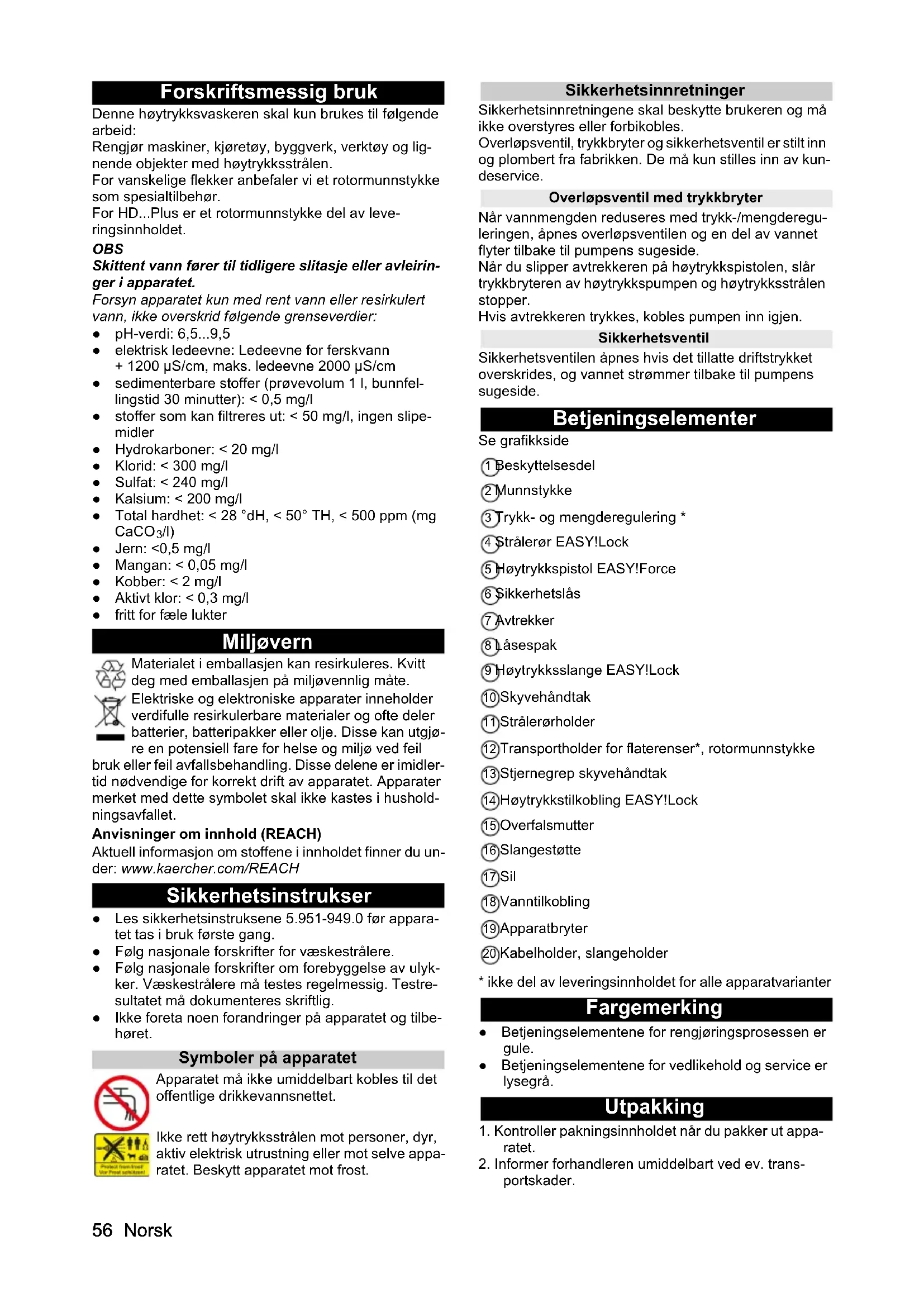 /l) ● Jern: <0,5 mg/l ● Mangan: < 0,05 mg/l ● Kobber: < 2 mg/l ● Aktivt klor: < 0,3 mg/l ● fritt for fæle lukter Miljøvern Materialet i emballasjen kan resirkuleres. Kvitt deg med emballasjen på miljøvennlig måte. Elektriske og elektroniske apparater inneholder verdifulle resirkulerbare materialer og ofte deler batterier, batteripakker eller olje. Disse kan utgjø- re en potensiell fare for helse og miljø ved feil bruk eller feil avfallsbehandling. Disse delene er imidler- tid nødvendige for korrekt drift av apparatet. Apparater merket med dette symbolet skal ikke kastes i hushold- ningsavfallet. Anvisninger om innhold (REACH) Aktuell informasjon om stoffene i innholdet finner du un- der: www.kaercher.com/REACH Sikkerhetsinstrukser ● Les sikkerhetsinstruksene 5.951-949.0 før appara- tet tas i bruk første gang. ● Følg nasjonale forskrifter for væskestrålere. ● Følg nasjonale forskrifter om forebyggelse av ulyk- ker. Væskestrålere må testes regelmessig. Testre- sultatet må dokumenteres skriftlig. ● Ikke foreta noen forandringer på apparatet og tilbe- høret. Symboler på apparatet Apparatet må ikke umiddelbart kobles til det offentlige drikkevannsnettet. Ikke rett høytrykksstrålen mot personer, dyr, aktiv elektrisk utrustning eller mot selve appa- ratet. Beskytt apparatet mot frost. Sikkerhetsinnretninger Sikkerhetsinnretningene skal beskytte brukeren og må ikke overstyres eller forbikobles. Overløpsventil, trykkbryter og sikkerhetsventil er stilt inn og plombert fra fabrikken. De må kun stilles inn av kun- deservice. Overløpsventil med trykkbryter Når vannmengden reduseres med trykk-/mengderegu- leringen, åpnes overløpsventilen og en del av vannet flyter tilbake til pumpens sugeside. Når du slipper avtrekkeren på høytrykkspistolen, slår trykkbryteren av høytrykkspumpen og høytrykksstrålen stopper. Hvis avtrekkeren trykkes, kobles pumpen inn igjen. Sikkerhetsventil Sikkerhetsventilen åpnes hvis det tillatte driftstrykket overskrides, og vannet strømmer tilbake til pumpens sugeside. Betjeningselementer Se grafikkside 1 Beskyttelsesdel 2 Munnstykke 3 Trykk- og mengderegulering * 4 Strålerør EASY!Lock 5 Høytrykkspistol EASY!Force 6 Sikkerhetslås 7 Avtrekker 8 Låsespak 9 Høytrykksslange EASY!Lock 10 Skyvehåndtak 11 Strålerørholder 12 Transportholder for flaterenser*, rotormunnstykke 13 Stjernegrep skyvehåndtak 14 Høytrykkstilkobling EASY!Lock 15 Overfalsmutter 16 Slangestøtte 17 Sil 18 Vanntilkobling 19 Apparatbryter 20 Kabelholder, slangeholder
