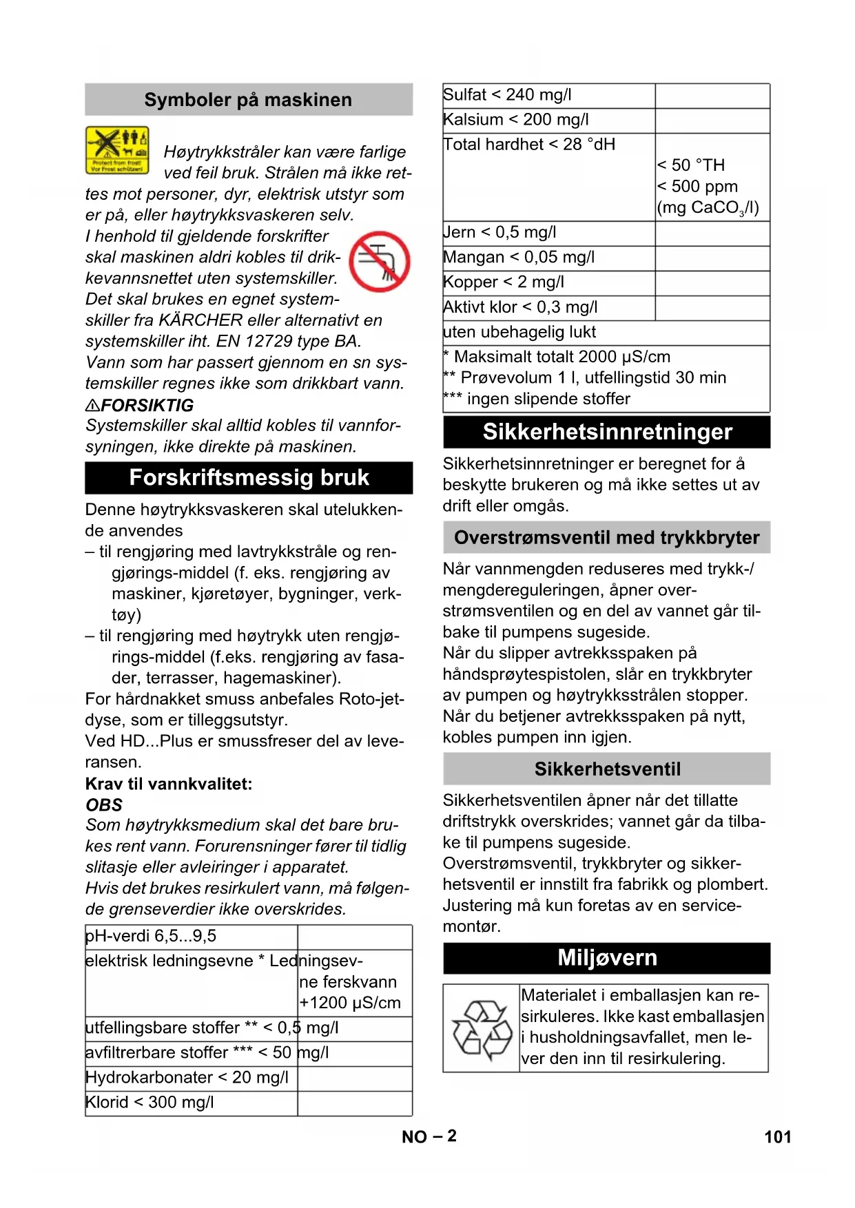 dB(A) 91 88 Driftsstoffer Oliemængde l 0,5 0,75 Olietype: SAE 90 Hypoid Mål og vægt Længde mm 554 Bredde mm 509 Højde mm 1000 Vægt uden tilbehør (MX) kg 48,6 42,1 (49) 47 (55) 48 (50) 99DA– 1 Før første gangs bruk av appa- ratet, les denne originale bruks- anvisningen, følg den og oppbevar den for senere bruk eller for overlevering til neste eier. Vennlist fold ut illustrasjonsarket foran 1 Dyseholder 2 Håndtak 3 Høytrykkstilkobling EASY!Lock 4 Vanntilkobling 5 Manometer 6 Oljenivåindikator 7 Oljebeholder 8 Maskinhette 9 Apparatbryter 10 Festeskrue maskindeksel 11 Slangeholder 12 Holder for høytrykkspistol 13 Dyse 14 Merking av dyse 15 Strålerør EASY!Lock 16 Trykk- / mengderegulering (ikke ved HD 9/18 M) 17 Håndsrpøytepistol EASY!Force 18 Sikringslås 19 Avtrekkerhendel 20 Sikringshendel 21 Høyttrykksslange EASY!Lock 22 Skyvebøyle 23 Kabelholder 24 Doseringsventil rengjøringsmiddel 25 Sugeslange for rengjøringsmiddel, med filter og skruedeksel 26 Flaskeholder for rengjøringsmiddel 27 Sveiv 28 Slangetrommel – Betjeningselementer for rengjørings- prosessen er gule. – Betjeningselementer for vedlikehold og service er lysegråe. – Det er tvingende nødvendig å lese sik- kerhetsinstruksene nr. 5.951-949.0 før maskinen settes i drift! – Følg gjeldende lovpålagte nasjonale forskrifter for væskestrålemaskiner. – Følg gjeldende lovpålagte nasjonale forskrifter om ulykkesforhindring. Væs- kestrålemaskinen må kontrolleres re- gelmessig og resultatene av kontrollen skal protokollføres. – Det må ikke gjøres endringer på appa- ratet/tilbehøret. FARE Anvisning om en umiddelbar truende fare som kan føre til store personskader eller til død. 몇 ADVARSEL Anvisning om en mulig farlig situasjon som kan føre til store personskader eller til død. 몇 FORSIKTIG Anvisning om en mulig farlig situasjon som kan føre til mindre personskader. OBS Anvisning om en mulig farlig situasjon som kan føre til materielle skader. Innholdsfortegnelse Maskinorganer . . . . . . . . . . . . NO 1 Sikkerhetsanvisninger. . . . . . . NO 1 Forskriftsmessig bruk . . . . . . . NO 2 Sikkerhetsinnretninger . . . . . . NO 2 Miljøvern . . . . . . . . . . . . . . . . . NO 2 Før den tas i bruk . . . . . . . . . . NO 3 Ta i bruk . . . . . . . . . . . . . . . . . NO 3 Betjening. . . . . . . . . . . . . . . . . NO 4 Transport. . . . . . . . . . . . . . . . . NO 6 Lagring . . . . . . . . . . . . . . . . . . NO 6 Pleie og vedlikehold . . . . . . . . NO 6 Feilretting . . . . . . . . . . . . . . . . NO 7 Tilbehør og reservedeler. . . . . NO 8 Garanti . . . . . . . . . . . . . . . . . . NO 8 EU-samsvarserklæring . . . . . . NO 8 Tekniske data . . . . . . . . . . . . . NO 9 Maskinorganer Fargemerking Sikkerhetsanvisninger Risikotrinn 100 NO– 2 Høytrykkstråler kan være farlige ved feil bruk. Strålen må ikke ret- tes mot personer, dyr, elektrisk utstyr som er på, eller høytrykksvaskeren selv. I henhold til gjeldende forskrifter skal maskinen aldri kobles til drik- kevannsnettet uten systemskiller. Det skal brukes en egnet system- skiller fra KÄRCHER eller alternativt en systemskiller iht. EN 12729 type BA. Vann som har passert gjennom en sn sys- temskiller regnes ikke som drikkbart vann. 몇 FORSIKTIG Systemskiller skal alltid kobles til vannfor- syningen, ikke direkte på maskinen. Denne høytrykksvaskeren skal utelukken- de anvendes – til rengjøring med lavtrykkstråle og ren- gjørings-middel (f. eks. rengjøring av maskiner, kjøretøyer, bygninger, verk- tøy) – til rengjøring med høytrykk uten rengjø- rings-middel (f.eks. rengjøring av fasa- der, terrasser, hagemaskiner). For hårdnakket smuss anbefales Roto-jet- dyse, som er tilleggsutstyr. Ved HD...Plus er smussfreser del av leve- ransen. Krav til vannkvalitet: OBS Som høytrykksmedium skal det bare bru- kes rent vann. Forurensninger fører til tidlig slitasje eller avleiringer i apparatet. Hvis det brukes resirkulert vann, må følgen- de grenseverdier ikke overskrides. Sikkerhetsinnretninger er beregnet for å beskytte brukeren og må ikke settes ut av drift eller omgås. Når vannmengden reduseres med trykk-/ mengdereguleringen, åpner over- strømsventilen og en del av vannet går til- bake til pumpens sugeside. Når du slipper avtrekksspaken på håndsprøytespistolen, slår en trykkbryter av pumpen og høytrykksstrålen stopper. Når du betjener avtrekksspaken på nytt, kobles pumpen inn igjen. Sikkerhetsventilen åpner når det tillatte driftstrykk overskrides; vannet går da tilba- ke til pumpens sugeside. Overstrømsventil, trykkbryter og sikker- hetsventil er innstilt fra fabrikk og plombert. Justering må kun foretas av en service- montør. Symboler på maskinen Forskriftsmessig bruk pH-verdi 6,5...9,5 elektrisk ledningsevne * Ledningsev- ne ferskvann +1200 µS/cm utfellingsbare stoffer ** < 0,5 mg/l avfiltrerbare stoffer *** < 50 mg/l Hydrokarbonater < 20 mg/l Klorid < 300 mg/l Sulfat < 240 mg/l Kalsium < 200 mg/l Total hardhet < 28 °dH < 50 °TH < 500 ppm (mg CaCO