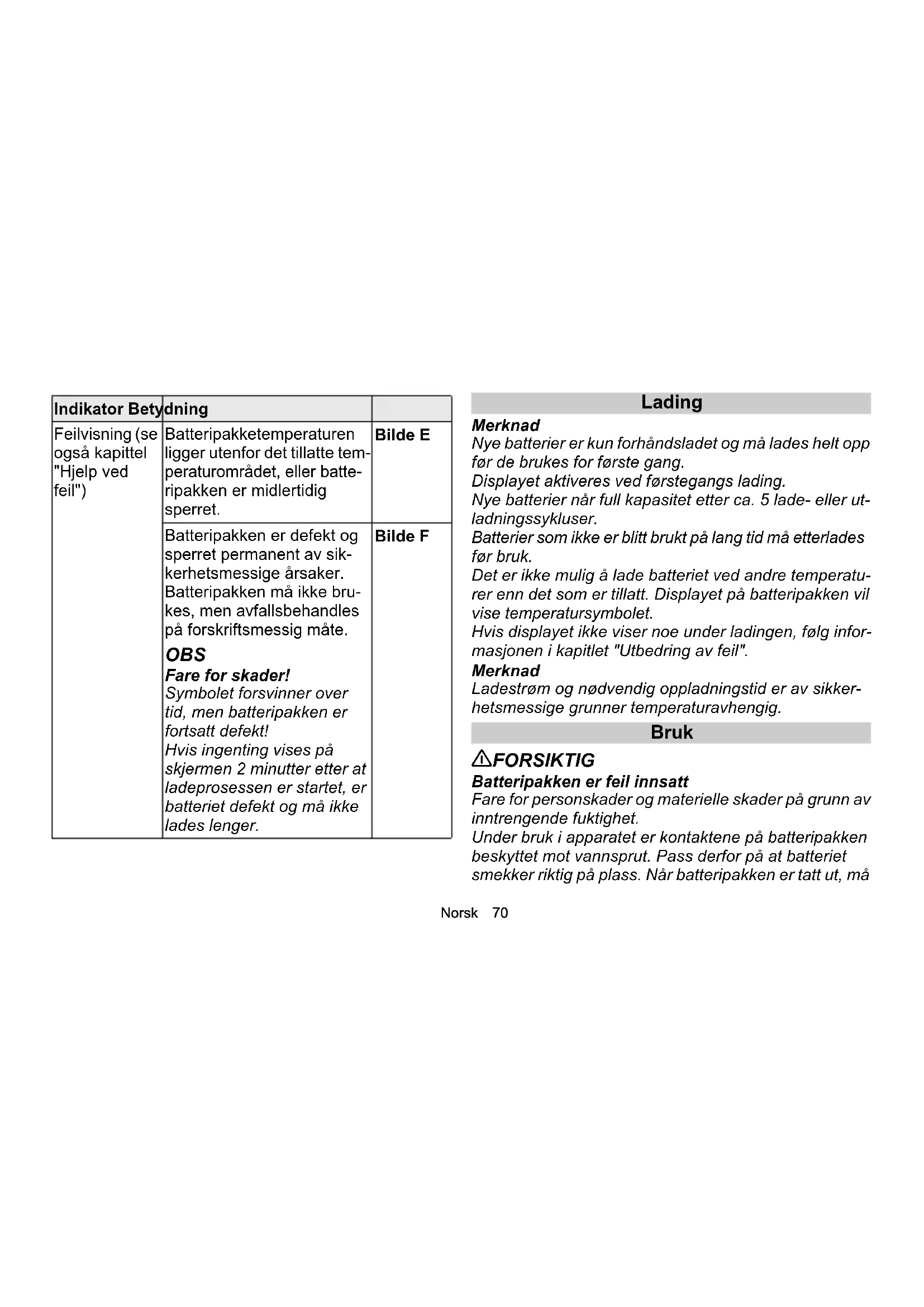 og vent til batteritemperaturen er i normalområdet, se kapittel “Tekniske data”. Ladingen starter automatisk. Feil ved bruk Displayet viser temperatursymbol Batteritemperaturen er for lav / høy.
